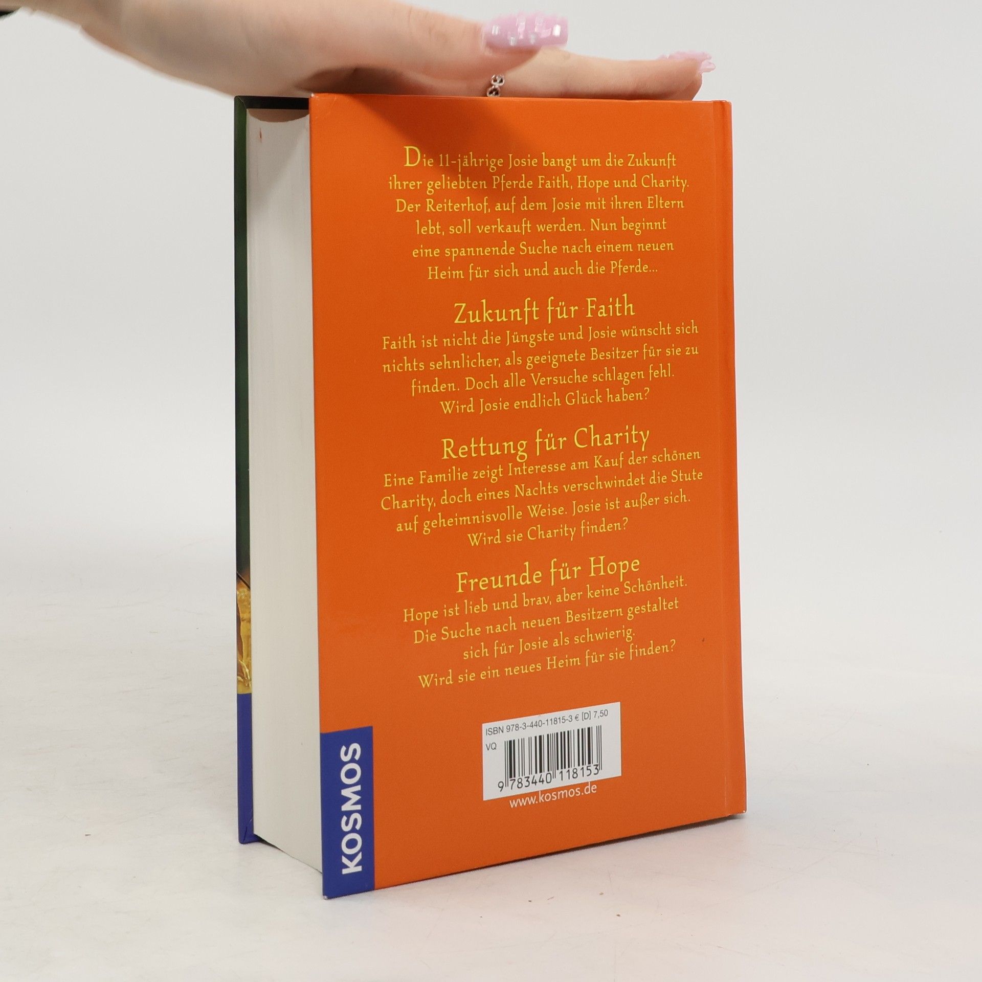 Drei Romane in einem Band: Die 11-jährige Josie bangt um die Zukunft ihrer geliebten Pferde Faith, Hope und Charity. Der Reiterhof, auf dem Josie mit ihren Eltern lebt, soll verkauft werden. Nun beginnt eine spannende Suche nach einem neuen Heim für sich und auch die Pferde. Zukunft für Faith: Faith ist nicht mehr die Jüngste, und Josie wünscht sich nichts sehnlicher, als endlich geeignete Besitzer für sie zu finden. Doch alle Versuche schlagen fehl. Wird Josie endlich Glück haben? Rettung für Charity: Eine Familie zeigt Interesse am Kauf der schönen Charity, doch eines Nachts verschwindet die Stute auf geheimnisvolle Weise. Josie ist außer sich. Wird sie Charity finden? Freunde für Hope: Hope ist zuverlässig und brav, aber keine Schönheit. Die Suche nach neuen Besitzern gestaltet sich für Josie als schwierig. Wird sie ein neues Heim für sie finden?