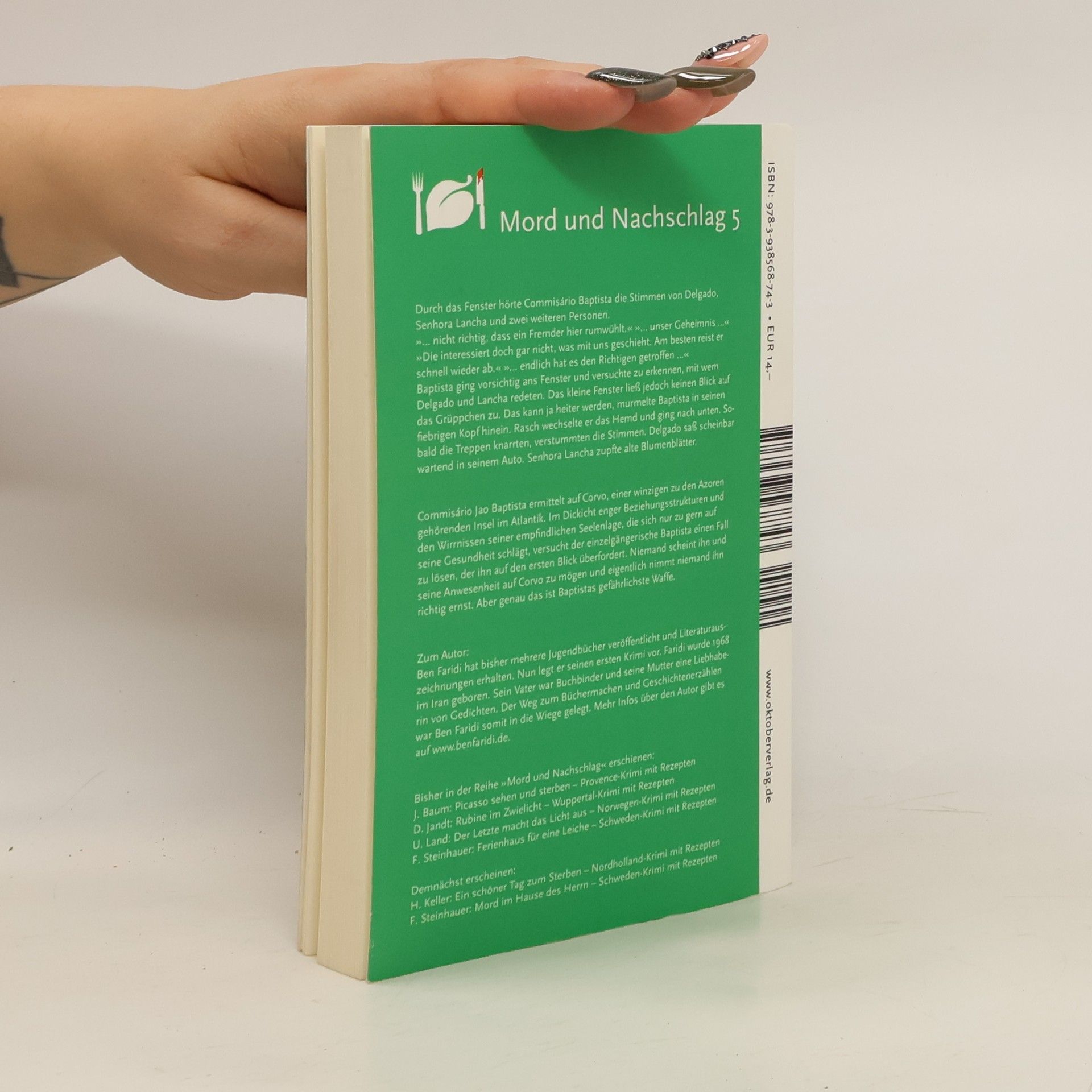 Dreihundert Einwohner leben auf Corvo, einer winzigen, zu den Azoren gehörenden Insel im Atlantik. Ihre Haupteinkommensquelle ist der Tourismus und die Landwirtschaft. Eines Tages geschieht in dieser unberührten Idylle ein bestialischer Mord. Es ist der erste Mord in der Geschichte Corvos überhaupt. Kommissar Jao Baptista wird im Rahmen einer Amtshilfe mit den Ermittlungen beauftragt. Die enge Welt von Corvo, in der jeder jeden kennt, und die ablehnende Haltung gegenüber den Menschen vom Festland lassen ihn kaum vorankommen. Im Dickicht enger Beziehungsstrukturen und im wechselhaften Wetter seiner empfindlichen Seelenlage, die sich nur zu gern auch auf seine Gesundheit schlägt, versucht der einzelgängerische Baptista einen Fall zu lösen, der ihn auf den ersten Blick zu überfordern scheint. Niemand mag ihn so richtig und eigentlich nimmt niemand ihn auch richtig ernst. Genau das aber ist Baptistas gefährlichste Waffe. Im Anhang finden sich wie immer in der Reihe „Mord & Nachschlag“ Kochrezepte zur Geschichte.