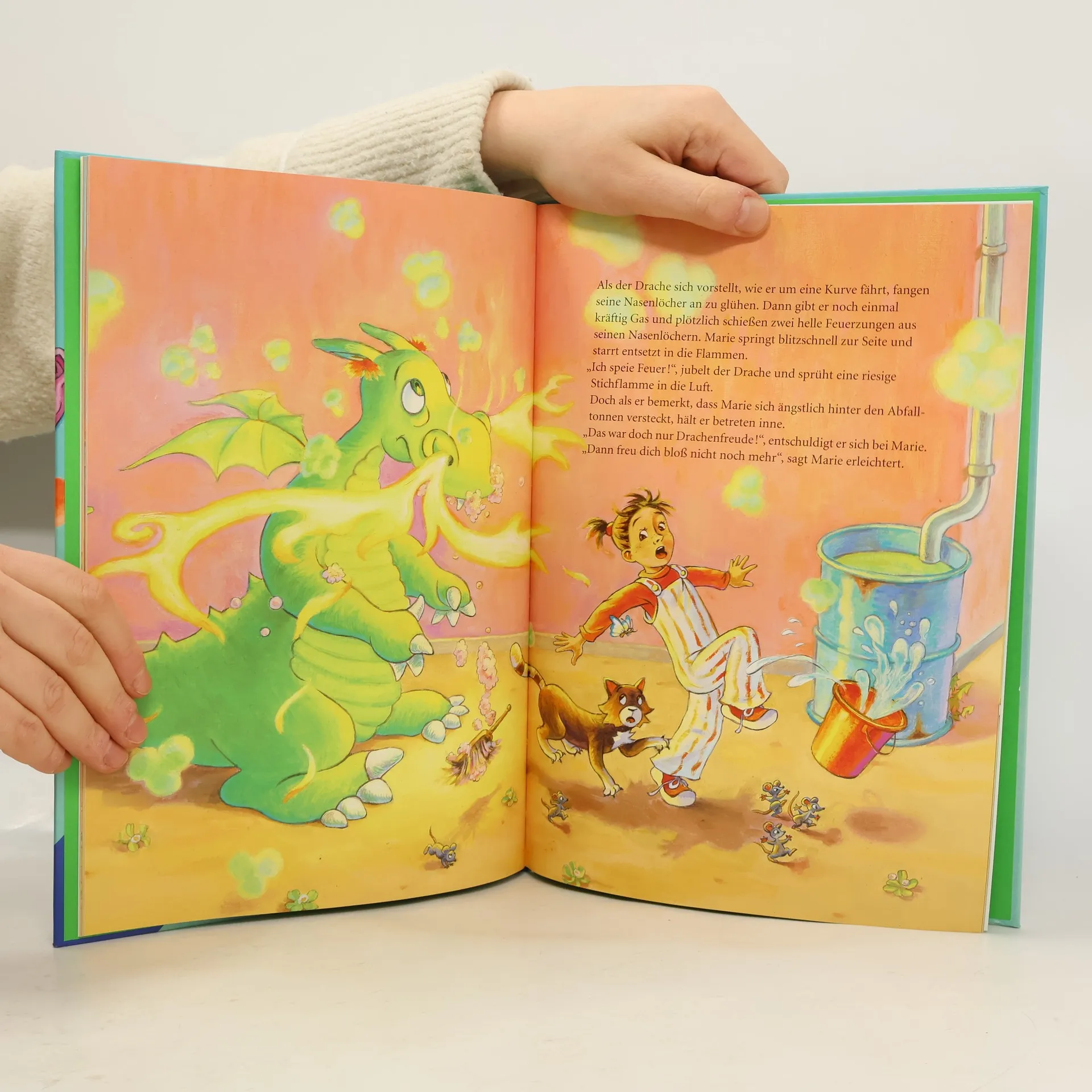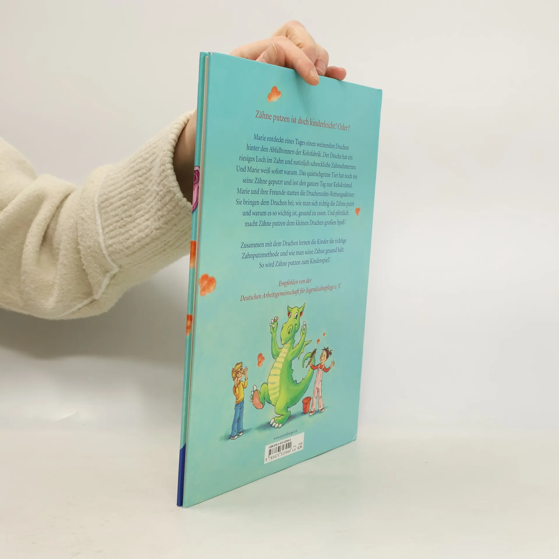 Was macht ein Drache, der schreckliche Zahnschmerzen hat? Er hat ein riesiges Loch im Zahn und seine Zähne noch nie geputzt. Zum Glück trifft er Marie, die mit einer ganzen Zahnpastatube, einem Kehrbesen und einem Eimer Wasser ans Werk rückt und dem Drachen erstmal zeigt, wie man sich richtig die Zähne putzt. Außerdem bringt sie ihm gesundes Essen mit, das gut ist für die Zähne. Natürlich verschwindet aber das Loch nicht und eines Tages sind die Drachenzahnschmerzen so schlimm, dass nur eins hilft: Der Drache muss zum Zahnarzt!