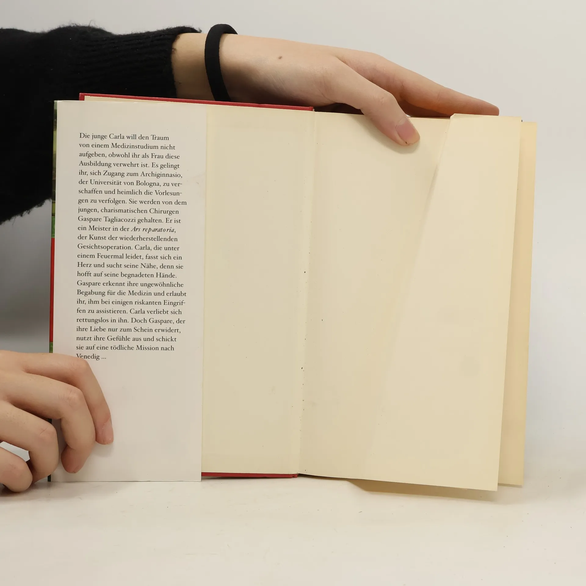 Bologna 1552. Mit einem entstellenden Feuermal – für die Inquisition ein Schandmal der Sünde – kommt Carla zur Welt. Um sich von diesem Makel zu befreien, träumt sie davon, eine Medica zu werden. Doch ein Medizinstudium ist ihr als Frau verwehrt. Sie gibt nicht auf. Heimlich besucht sie Vorlesungen an der Universität, wo der charismatische Chirurg Gaspare Tagliacozzi die Kunst der Gesichtsoperationen lehrt. Sie hofft auf seine begnadeten Hände und verliebt sich dabei rettungslos in ihn. Doch Gaspare, der ihre Liebe nur zum Schein erwidert, schickt sie auf eine tödliche Mission …