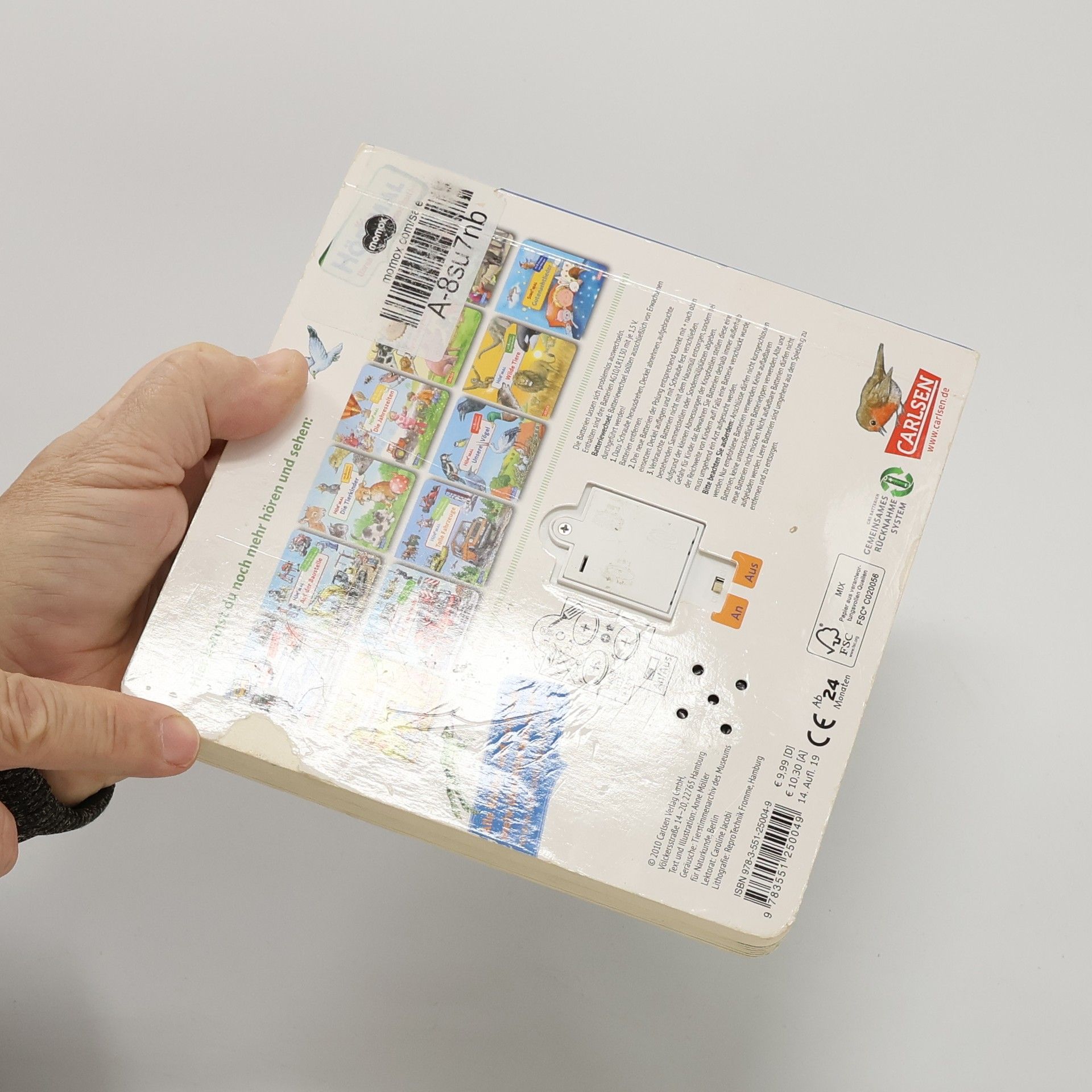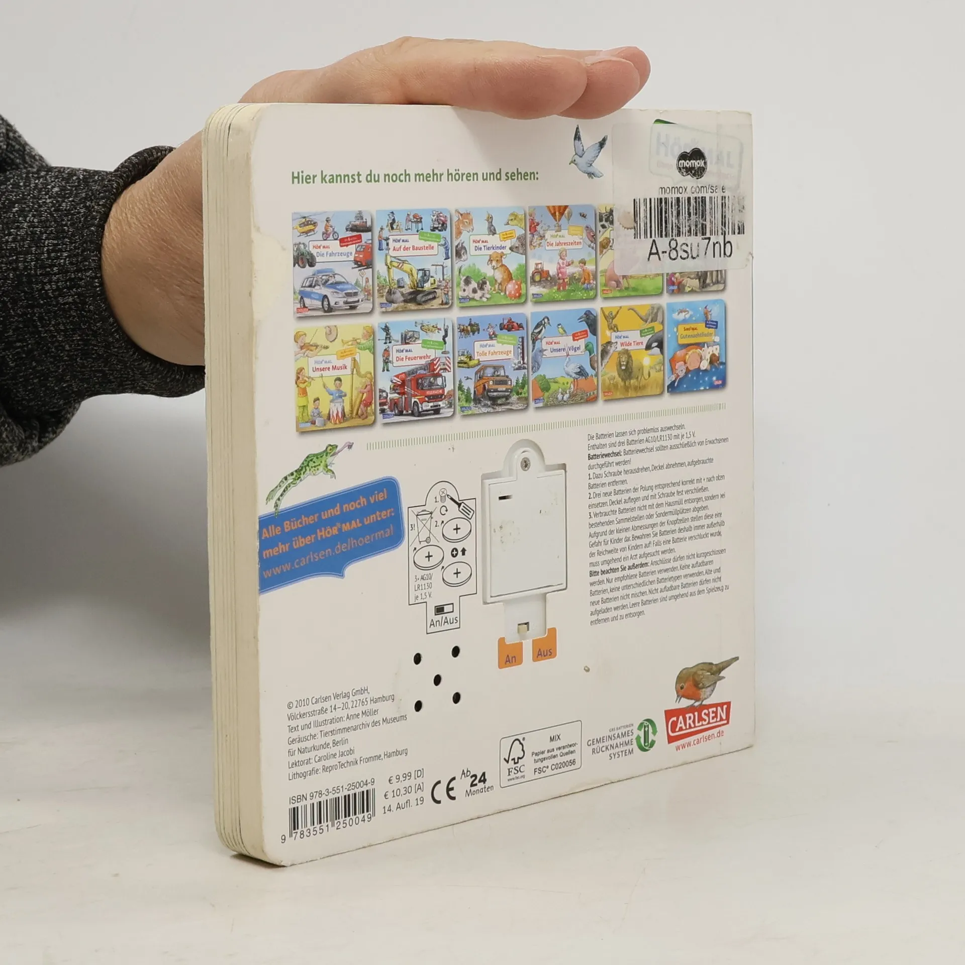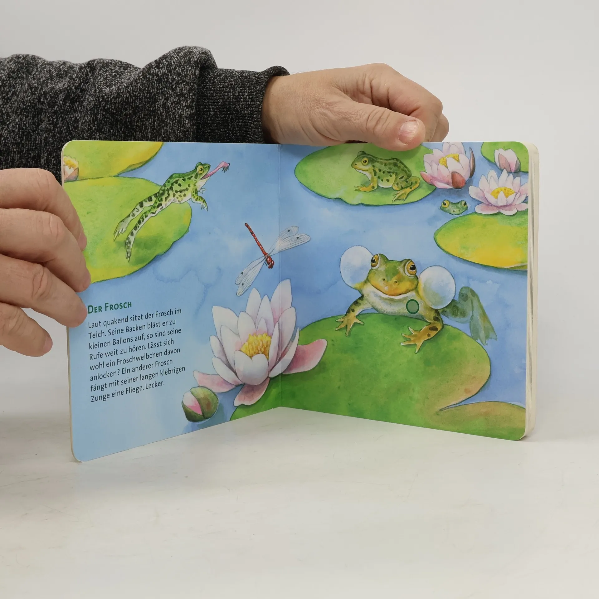 Laut quakend sitzt der Frosch im Teich. Durch leichten Druck auf seinen Bauch ist sein Rufen für jeden zu hören. Auch das Zirpen der Grille, das Donnergrollen eines herannahenden Gewitters, das Singen des Rotkehlchens, der Ruf des Waldkauz und das Rauschen der Meeresbrandung sind in diesem Sachbilderbuch zu hören. Typisch Hör mal: Jedes Buch enthält 6 leicht auslösbare Sounds mit einer Gesamtspielzeit von 60 Sekunden. Durch Druck auf die farbig markierten Punkte auf jeder Doppelseite werden die Geräusche aktiviert und deaktiviert. Kinder ab 2 Jahren können die Bücher problemlos alleine bedienen, bei jüngeren Kindern sollten die Eltern die Soundbuttons drücken, da die Feinmotorik und Kraft der kleinen Finger noch nicht ausreicht. Alle Titel der Reihe unterliegen strengen Sicherheitsanforderungen und Qualitätskontrollen. Jeder Soundknopf wird vor der Auslieferung auf seine Funktionsfähigkeit geprüft. Die Lautstärke der Sounds entspricht den Vorgaben der europäischen Spielzeugrichtlinie. Ausgeliefert werden die Bücher mit 3 handelsüblichen Knopfzell-Batterien LR 1130 mit je 1,5 V. Die Batterien lassen sich problemlos auswechseln. Dies ist zum Beispiel der Fall, wenn die Sounds nicht mehr die volle Spielzeit haben oder sich nur noch schwer auslösen lassen.