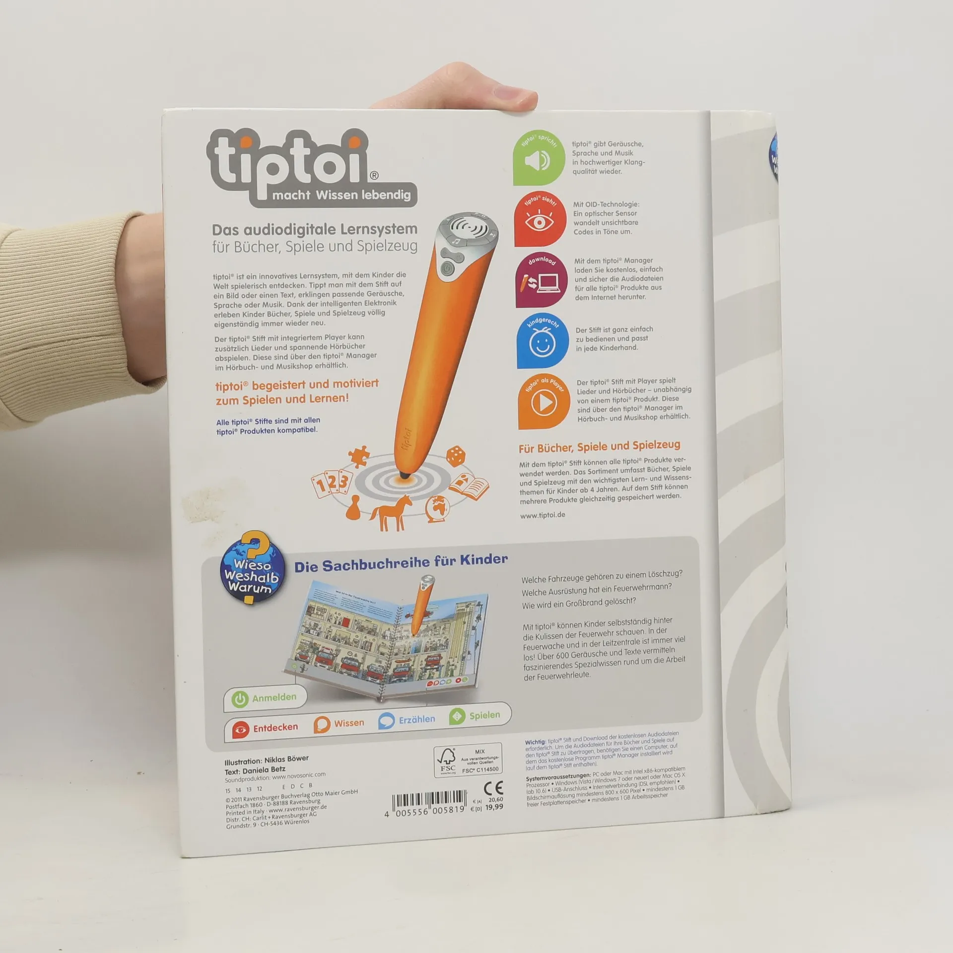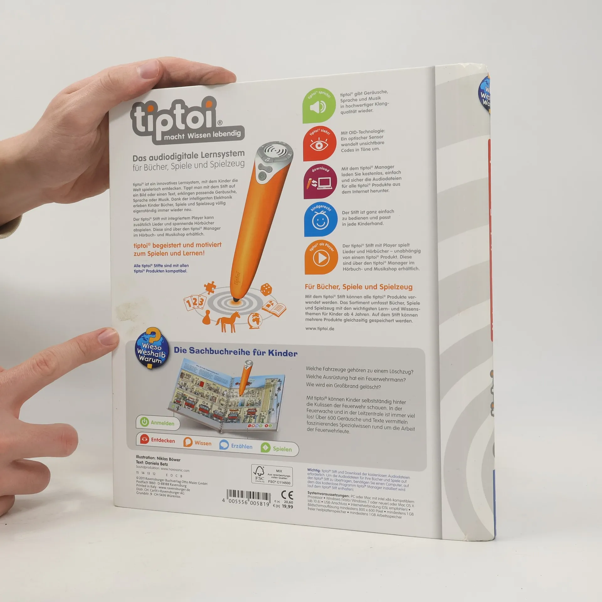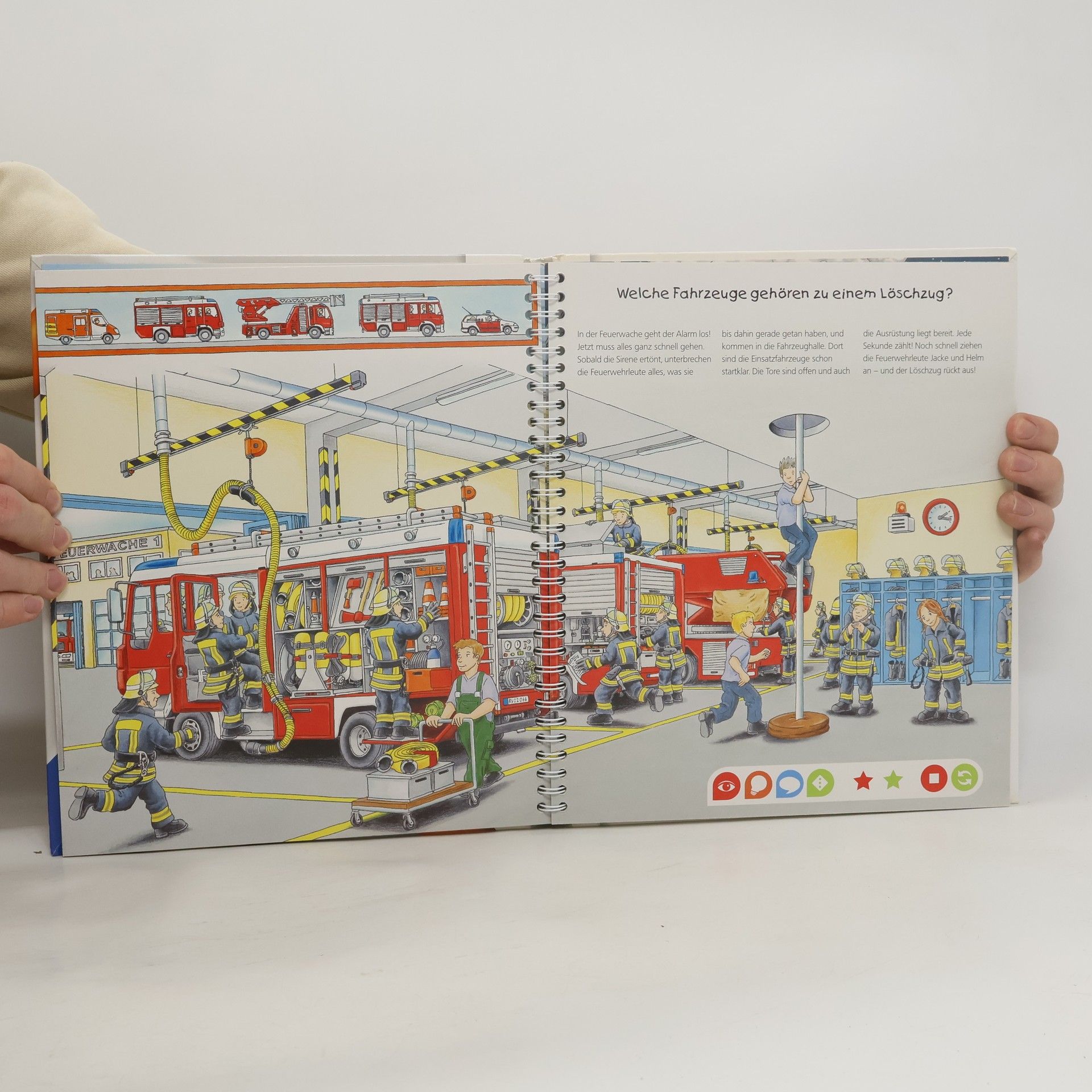 Mit tiptoi wird das faszinierende Thema Feuerwehr zu einem besonderen und interaktiven Spektakel! Welche Fahrzeuge gehören zu einem Löschzug? Welche Ausrüstung braucht ein Feuerwehrmann? Wie und wann ruft man selbst die Feuerwehr? Mit diesem Buch können Kinder selbstständig hinter die Kulissen der Feuerwehr schauen. Los geht es in der Feuerwache und der Leitstelle, danach rückt die Feuerwehr aus der Fahrzeughalle zu verschiedenen Bränden aus. Ob Hausbrand, Großbrand oder Flugzeugbrand: Tolle Bilder und spannende Geräusche vermitteln interessantes Wissen über die Arbeit der Feuerwehr. Was macht der Traktor auf dem Feld? Wann kommt die Feuerwehr? Wie groß wird ein Pony? Die interaktive Sachbuchreihe tiptoi Wieso? Weshalb? Warum? beantwortet wichtige Kinderfragen auf Augenhöhe. Auf den liebevoll illustrierten Seiten tauchen die Kinder in eine Welt ein, die durch zahlreiche authentische Geräusche lebendig wird. Das Sachwissen wird altersgerecht erklärt und ist fachlich geprüft. Die Kinder können sich dank der einfachen und intuitiven Nutzung mit dem tiptoi-Stift das Wissen selbst erschließen. Sie lernen, Zusammenhänge zu begreifen und erfahren spannende Informationen über ihren Alltag und ihre Umwelt. Tolle Geschichten, Lieder und unterhaltsame Spiele laden dabei immer wieder zum selbstständigen Entdecken und Erforschen ein. tiptoi-Stift nicht enthalten. Muss separat erworben werden.