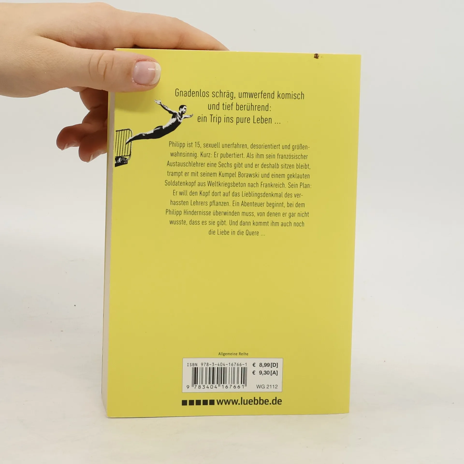 Philipp ist 15, sexuell unerfahren, desorientiert und größenwahnsinnig. Kurz: Er pubertiert. Als ihm sein französischer Austauschlehrer eine Sechs gibt und er deshalb sitzen bleibt, trampt er mit seinem Kumpel Borawski und einem geklauten Soldatenkopf aus Weltkriegsbeton nach Frankreich. Sein Plan: Er will den Kopf dort auf das Lieblingsdenkmal des verhassten Lehrers pflanzen. Ein Abenteuer beginnt, bei dem Philipp Hindernisse überwinden muss, von denen er gar nicht wusste, dass es sie gibt. Und dann kommt ihm auch noch die Liebe in die Quere ...