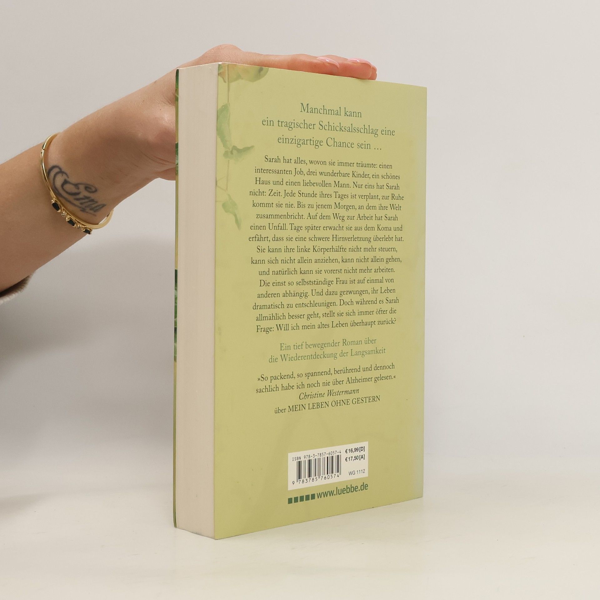 Sarah hat alles, wovon sie immer träumte: einen tollen Job, drei wunderbare Kinder, ein schönes Haus und einen liebevollen Mann. Nur eins hat Sarah nicht: Zeit. Bis zu jenem Morgen, an dem ihre Welt zusammenbricht. Auf dem Weg zur Arbeit hat Sarah einen Unfall. Als sie Tage später aus dem Koma erwacht, kann sie ihre linke Körperhälfte nicht mehr steuern. Die einst so selbstständige Frau ist auf einmal von anderen abhängig. Und dazu gezwungen, ihr Leben dramatisch zu entschleunigen. Doch während es Sarah allmählich besser geht, stellt sie sich immer öfter die Frage: Will ich mein altes Leben überhaupt zurück?