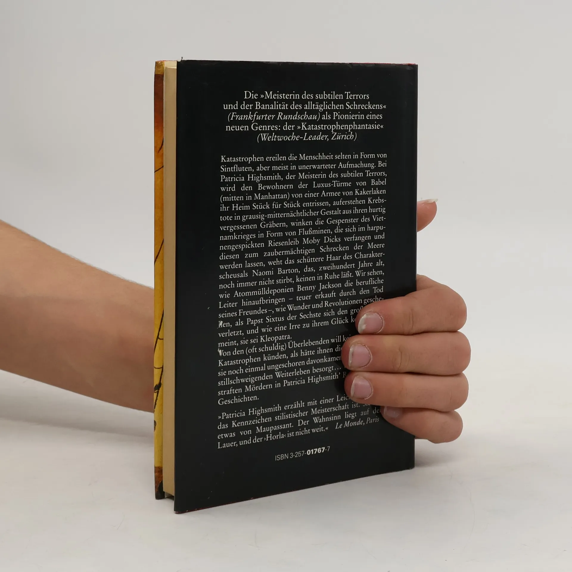 Groteske Geschwüre, die auf einem Friedhof in Österreich ins Unermessliche wachsen; riesige Kakerlaken, gegen alle Insektenmittel resistent, die in einem New Yorker Apartment-Haus das Kommando übernehmen; eine UNO-Mission, die in Afrika grausam endet; Wale, der Papst, ein waffenverliebter US-Präsident sie alle bilden den Stoff, aus dem moderne (natürliche oder unnatürliche) Katastrophen sind. Bei Patricia Highsmith entsteht das Grauen dadurch, dass die Menschen sich so verhalten, wie sie sich eben verhalten, ohne dass übersinnliche böse Mächte ins Spiel kommen.
