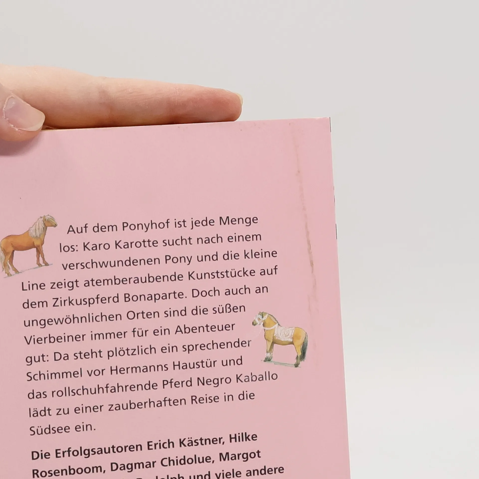 Auf dem Ponyhof ist jede Menge los: Karo Karotte sucht nach einem verschwundenen Pony und die kleine Line zeigt atemberaubende Kunststücke auf dem Zirkuspferd Bonaparte. Aber auch an ungewöhnlichen Orten sind die frechen Vierbeiner immer für ein Abenteuer gut. Da steht plötzlich ein sprechender Schimmel vor Hermanns Haustür und das rollschuhfahrende Pferd Negro Kaballo lädt zu einer zauberhaften Reise in die Südsee ein.