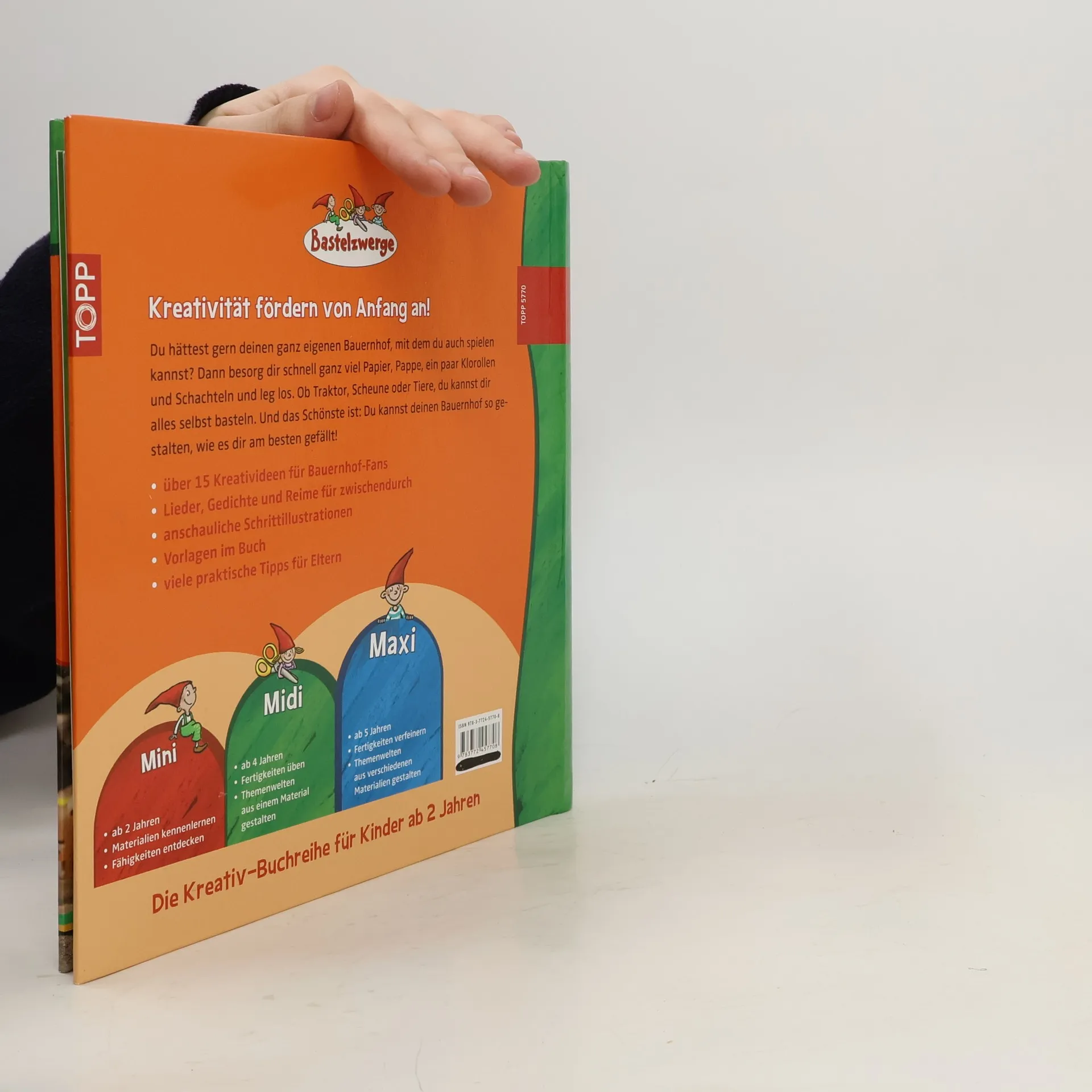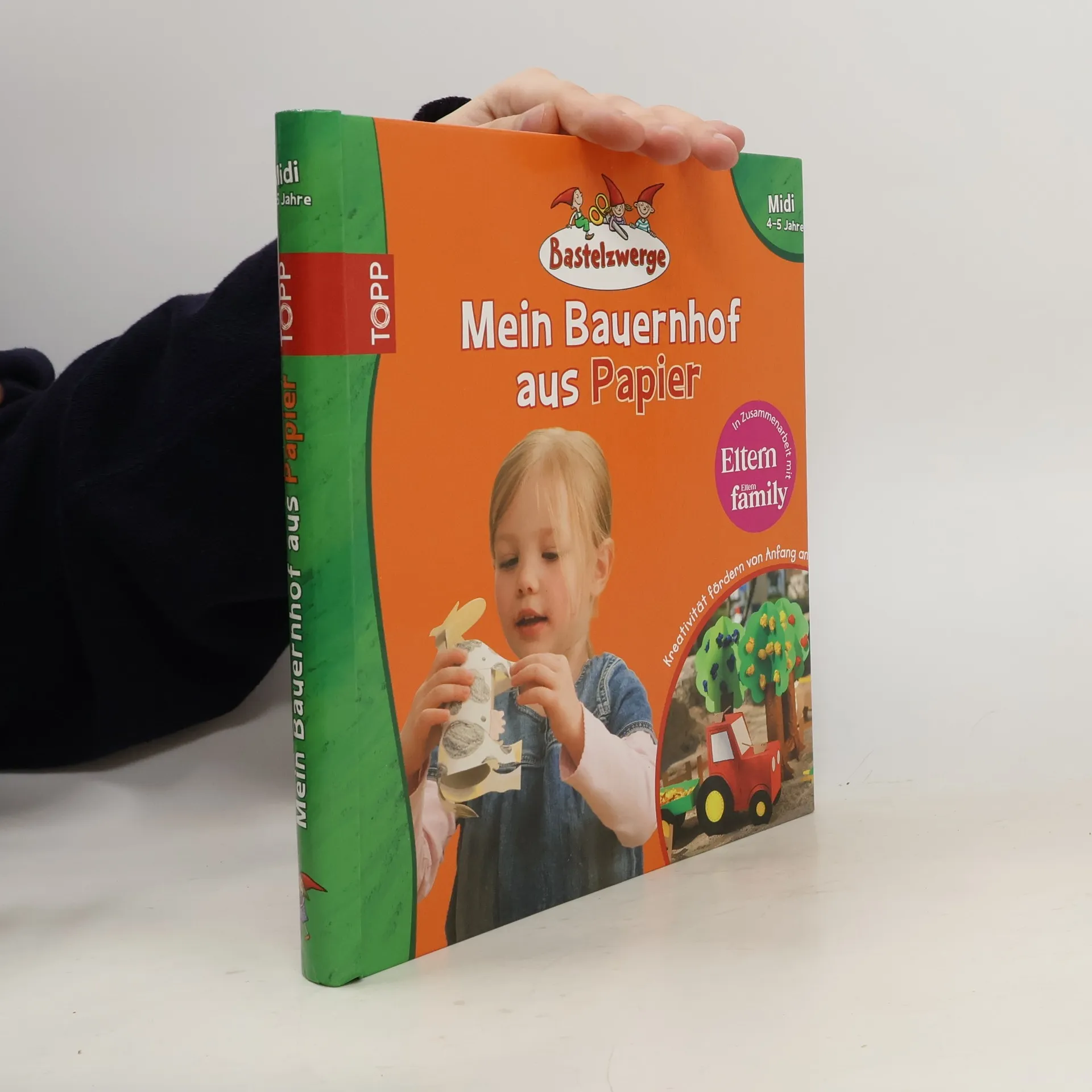 Bastelzwerge Midi – Mein Bauernhof aus Papier. Grund zum Stolzsein: einen ganzen Bauernhof zum Selberbasteln und Spielen. Viele Bastelprojekte aus Papier bietet dieses Bauernhofbuch. Dabei geht es neben den praktischen Ergebnissen zum Spielen auch um eine umfassende Annäherung an das Material Papier. 48 Seiten, 24,5 x 22,5 cm, Hardcover, mit verdeckter Wire-O-Bindung.