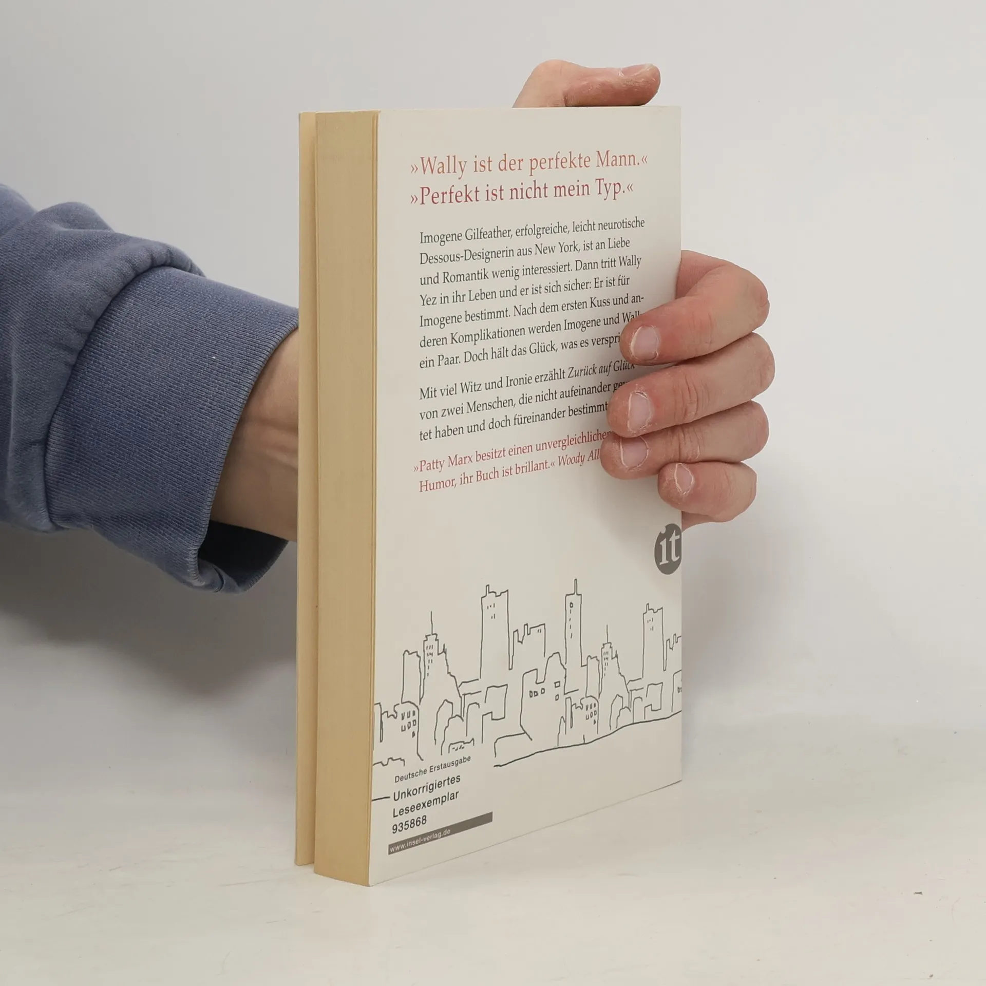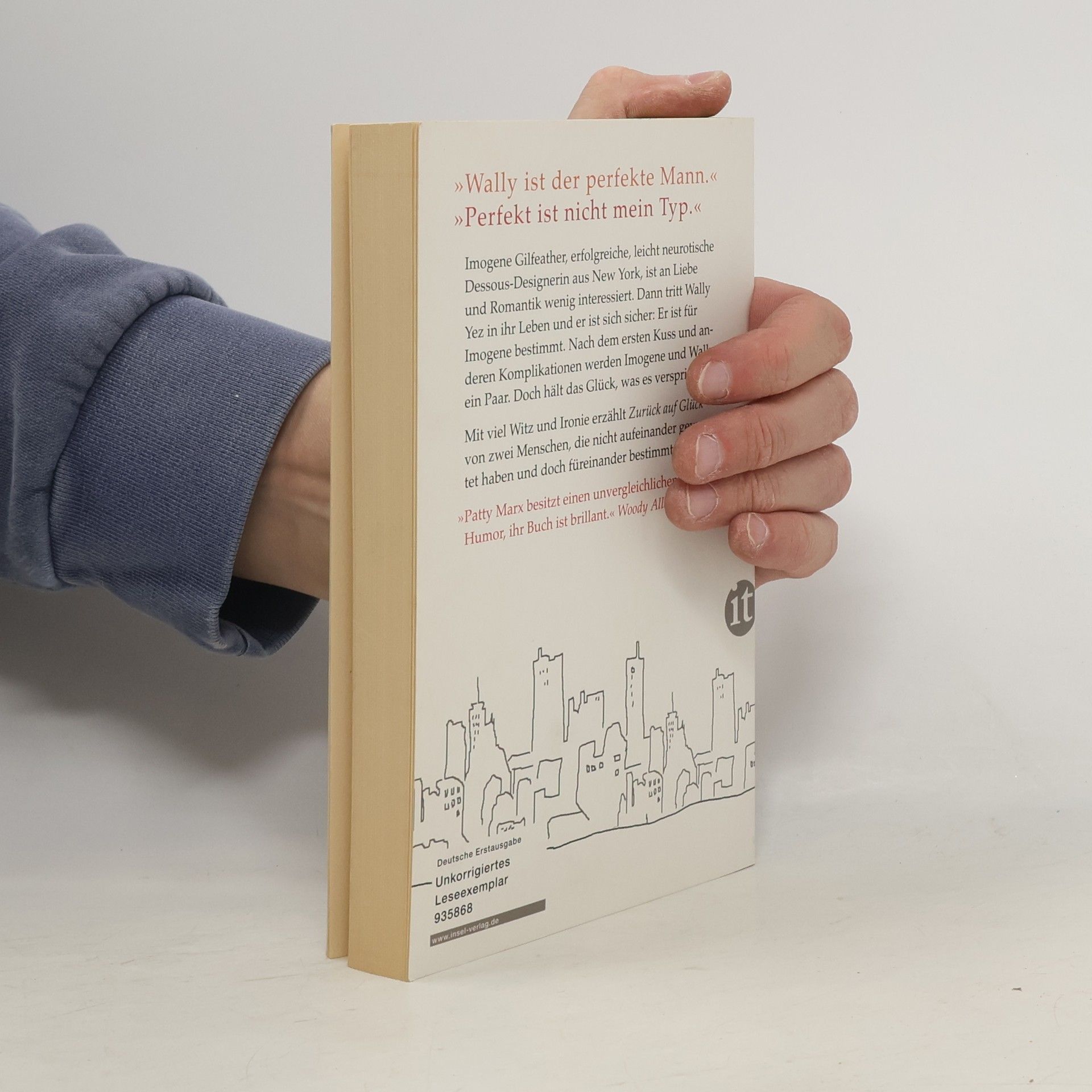 Auf einer Party in New York: Als sie für Apfelkuchen Schlange stehen, begegnen sich die fröhliche, aber neurotische Dessous-Designerin Imogene Gilfeather und der eigenwillige, aber liebenswerte Wissenschaftler Wally Yez. Der scheint der perfekte Mann für Imogene zu sein, doch: »Perfekt«, befindet sie, »ist nicht mein Typ«. Während sich Wally sicher ist, für Imogene bestimmt zu sein, hält sich ihr Interesse an Liebe und Romantik in Grenzen: »Weißt Du, warum ich keine Ohrlöcher habe? Weil die für immer sind!« Doch die Liebe nimmt ihren Lauf: Aus anfänglichen Emails werden stundenlange Telefongespräche; aus einem Date werden zwei, dann drei, dann viele. Imogene und Wally werden ein Paar. Doch hält das Glück, was es verspricht? Mit viel Witz, einer gehörigen Portion Ironie und einer Prise schwarzem Humor erzählt »Zurück auf Glück« von der Alchemie der Paarbeziehung – eine alltägliche und doch überraschend ungewöhnliche Liebesgeschichte, zwischen zwei Menschen, die nicht aufeinander gewartet haben, und doch füreinander bestimmt sind …