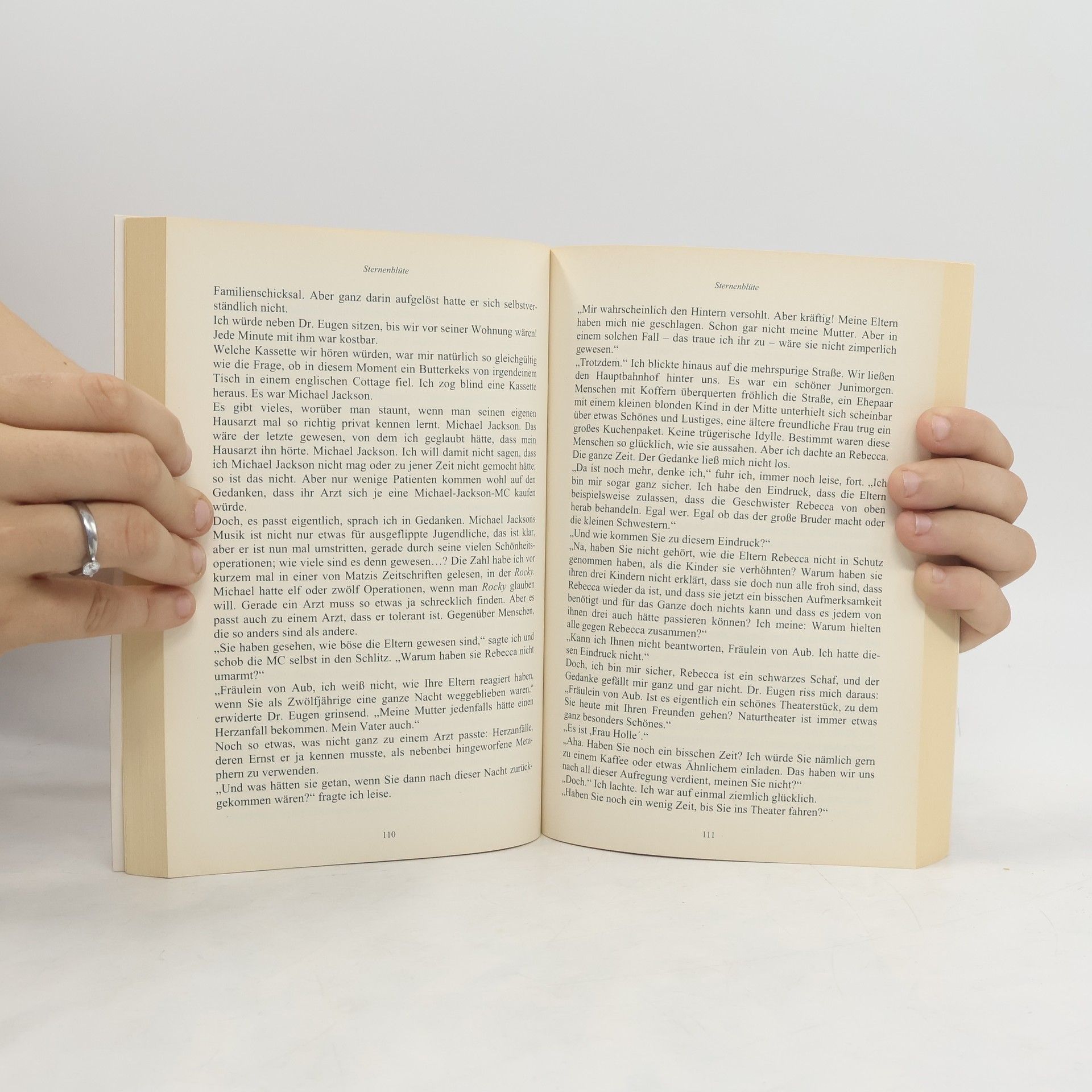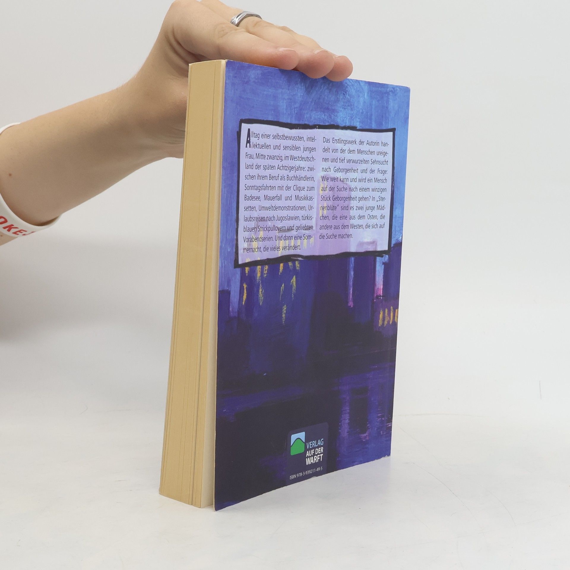Alltag einer selbstbewussten, intellektuellen und sensiblen jungen Frau, Mitte zwanzig, im Westdeutschland der späten Achtzigerjahre: zwischen ihrem Beruf als Buchhändlerin, Sonntagsfahrten mit der Clique zum Badesee, Mauerfall und Musikkassetten, Umweltdemonstrationen, Urlaubsreisen nach Jugoslawien, tür-kisblauen Strickpullovern und geliebten Vorabendserien. Und dann eine Som-mernacht, die vieles verändert. Das Erstlingswerk der Autorin handelt von der dem Menschen ureigenen und tief verwurzelten Sehnsucht nach Geborgenheit und der Frage: Wie weit kann und wird ein Mensch auf der Suche nach einem winzigen Stück Geborgenheit gehen? In Sternenblüte sind es zwei junge Mädchen, die eine aus dem Osten, die andere aus dem Westen, die sich auf die Suche machen.