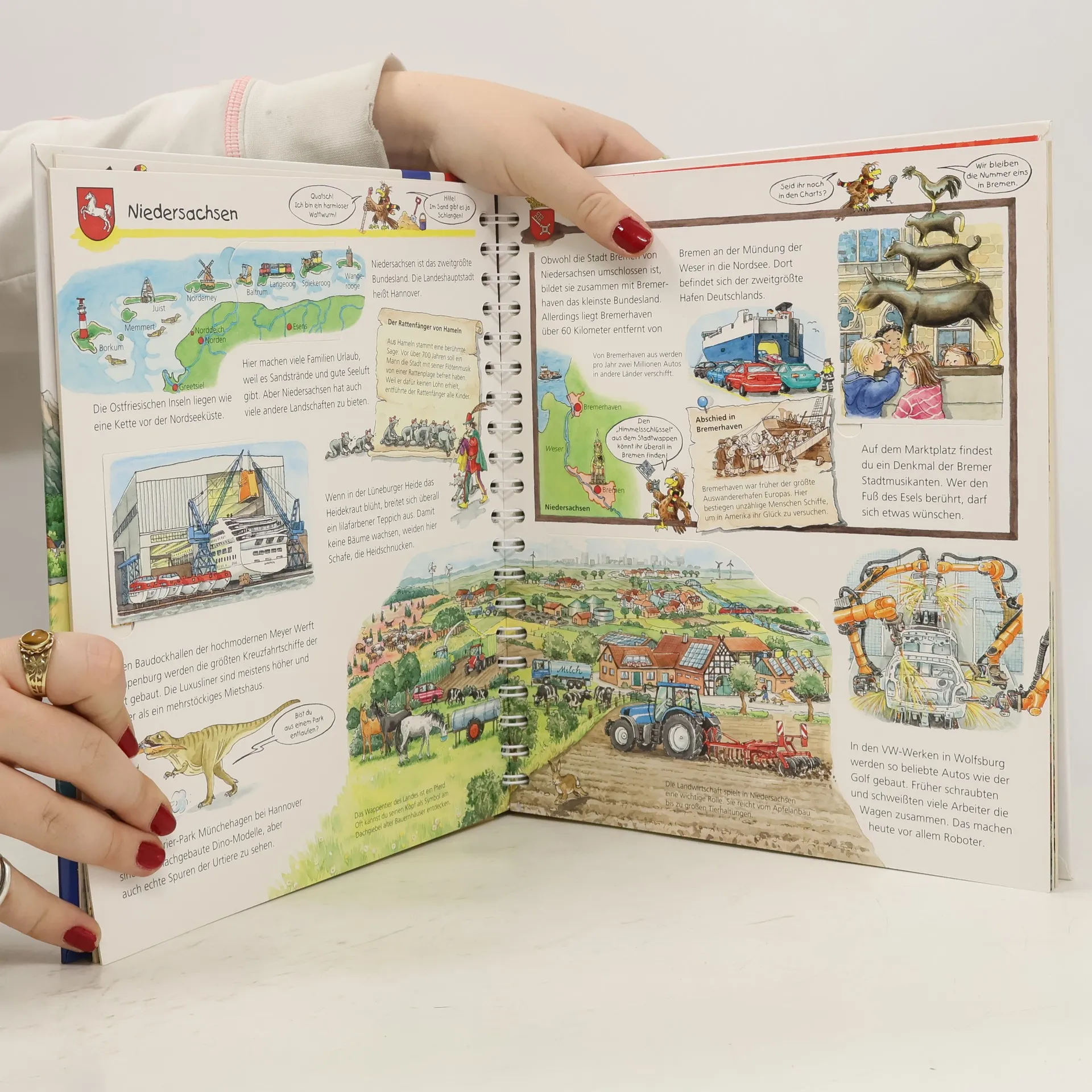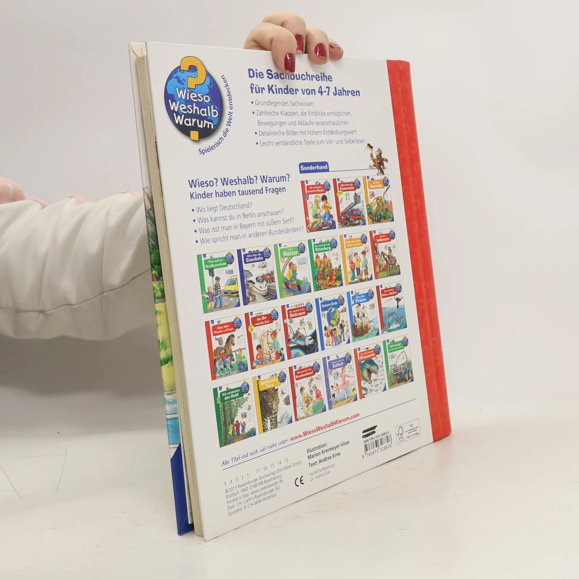 Worin unterscheiden sich der rheinische Karneval und die alemannische Fastnacht? Was kann man an Ostseestränden finden? Gibt es auf dem Blocksberg wirklich Hexen? In diesem Sonderband lernen Kinder von 4-7 Jahren Deutschland in all seinen Facetten kennen. Auf ein bis zwei Seiten wird jeweils ein Bundesland mit seinen Besonderheiten, die Kinder interessieren, vorgestellt. Zur besseren Orientierung gibt es zusätzlich zu den 22 Inhaltsseiten eine Ausklappseite mit einer Deutschlandkarte. Dort finden Kinder alle Bundesländer und viele Städte, Flüsse und Sehenswürdigkeiten wieder, die im Buch vorkommen. Deutschland hat viele Gesichter: Es gibt hohe Berge und weite Ebenen, lange Flüsse und große Seen sowie Küsten an der Nord- und der Ostsee. So unterschiedlich wie das Land sind auch die Menschen. Deutschland ist bunt und das Zuhause vieler Kulturen. Vom Lübecker Marzipan bis zur Weißwurst, von der Sächsischen Schweiz bis zur Frankfurter Skyline: In diesem Buch gibt es jede Menge zu entdecken. Es macht neugierig auf das eigene und andere Bundesländer, die bei Reisen erkundet werden können. Spielerisch die Welt entdecken Voller Neugier und spielerischer Freude wollen Kinder alles ganz genau wissen und haben viele Fragen. Gar nicht so einfach, die passenden Antworten zu finden. Wieso? Weshalb? Warum? beantwortet die vielen Fragen auf Augenhöhe der Kinder. Mit den Büchern dieser Reihe können Kinder den Dingen auf den Grund gehen, selbstständig Zusammenhänge verstehen und erkennen, was dahintersteckt. So werden sie liebevoll in ihrer Entwicklung gefördert. Diese spielerische Herangehensweise und der Detailreichtum der Inhalte garantieren lange Freude an jedem einzelnen Buch. Seit über 20 Jahren begleitet die Wissensreihe Kinder und Eltern auf ihrer gemeinsamen Entdeckerreise zu den verschiedensten Themen, denen Kindern in ihrem Alltag begegnen oder an denen sie ein besonderes Interesse haben. Spielerische Elemente, ein humorvoller Blick, die Nähe zum Kind, die liebevolle Umsetzung und die qualitativ hochwertige Ausstattung machen Wieso? Weshalb? Warum? zur Nr. 1 im Kindersachbuchmarkt. Und so findet jeder Entdecker das passende Wissen: Wieso? Weshalb? Warum? junior für Kinder von 2-4 Jahren Wieso? Weshalb? Warum? für Kinder von 4-7 Jahren Wieso? Weshalb? Warum? ProfiWissen für Kinder von 8-12 Jahren