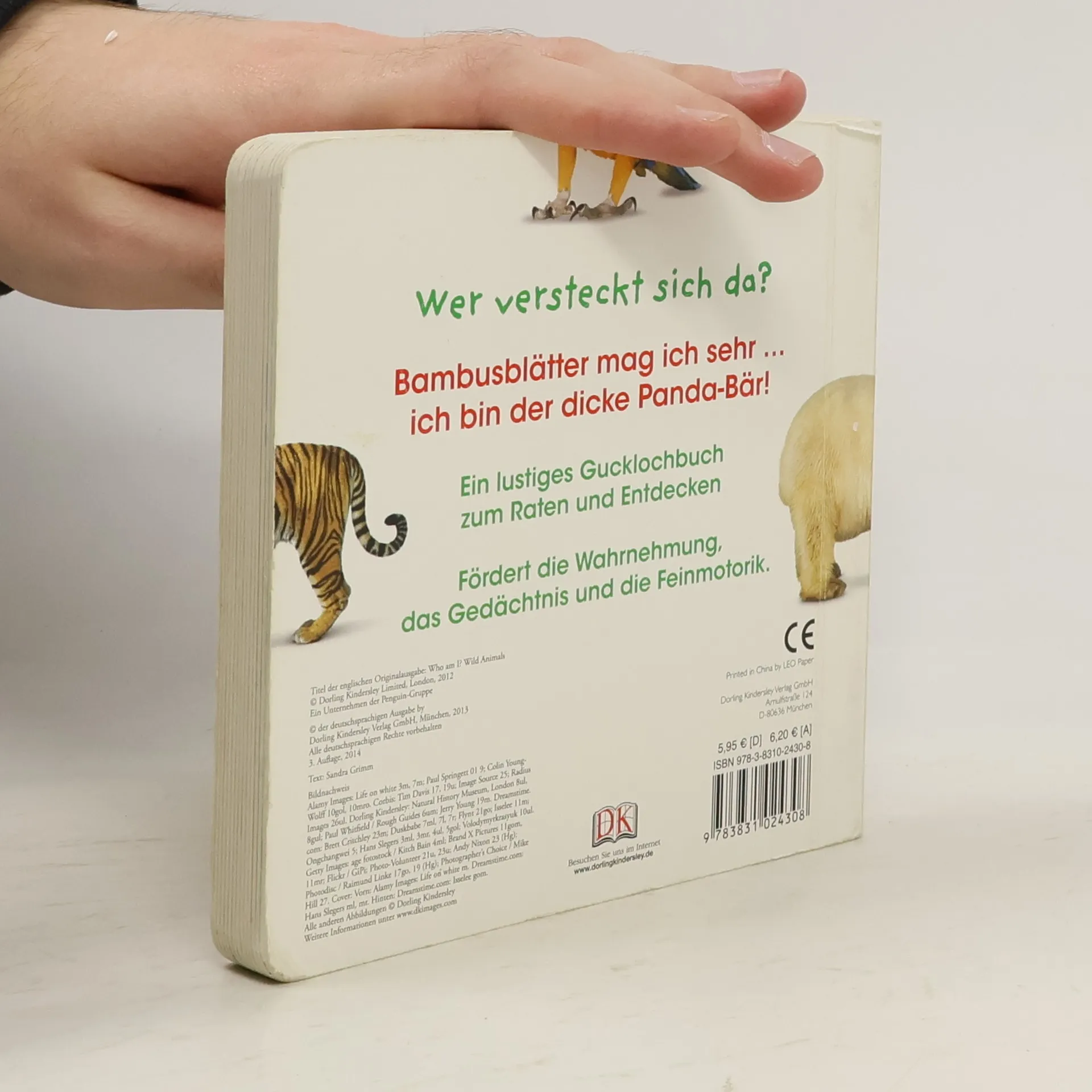Guck mal! In diesem lustigen Pappbilderbuch verbergen sich hinter vielen Gucklöchern bekannte Zootiere, die Kleinkinder lieben. Jedes Guckloch zeigt einen kleinen Ausschnitt des Tieres in seiner typischen Umgebung. Wer könnte das wohl sein? Lustige Reime geben Hinweise und animieren Kinder zu einem aufregenden Ratespiel. Durch das Guckloch zu spähen und - Überraschung! - das Tier dann auf der nächsten Seite vollständig zu sehen macht Kindern großen Spaß und wird nie langweilig. Kleine gereimte Aufforderungen zum Nachmachen von Tierlauten oder Bewegungen sorgen für noch mehr Spaß. Das Ratespiel schult die Wahrnehmung und das Gedächtnis von Kleinkindern und fördert die Feinmotorik durch das gezielte Umblättern. Die stabile Verarbeitung garantiert lang anhaltende Freude an diesem schönen Pappbilderbuch. Ab 18 Monaten.