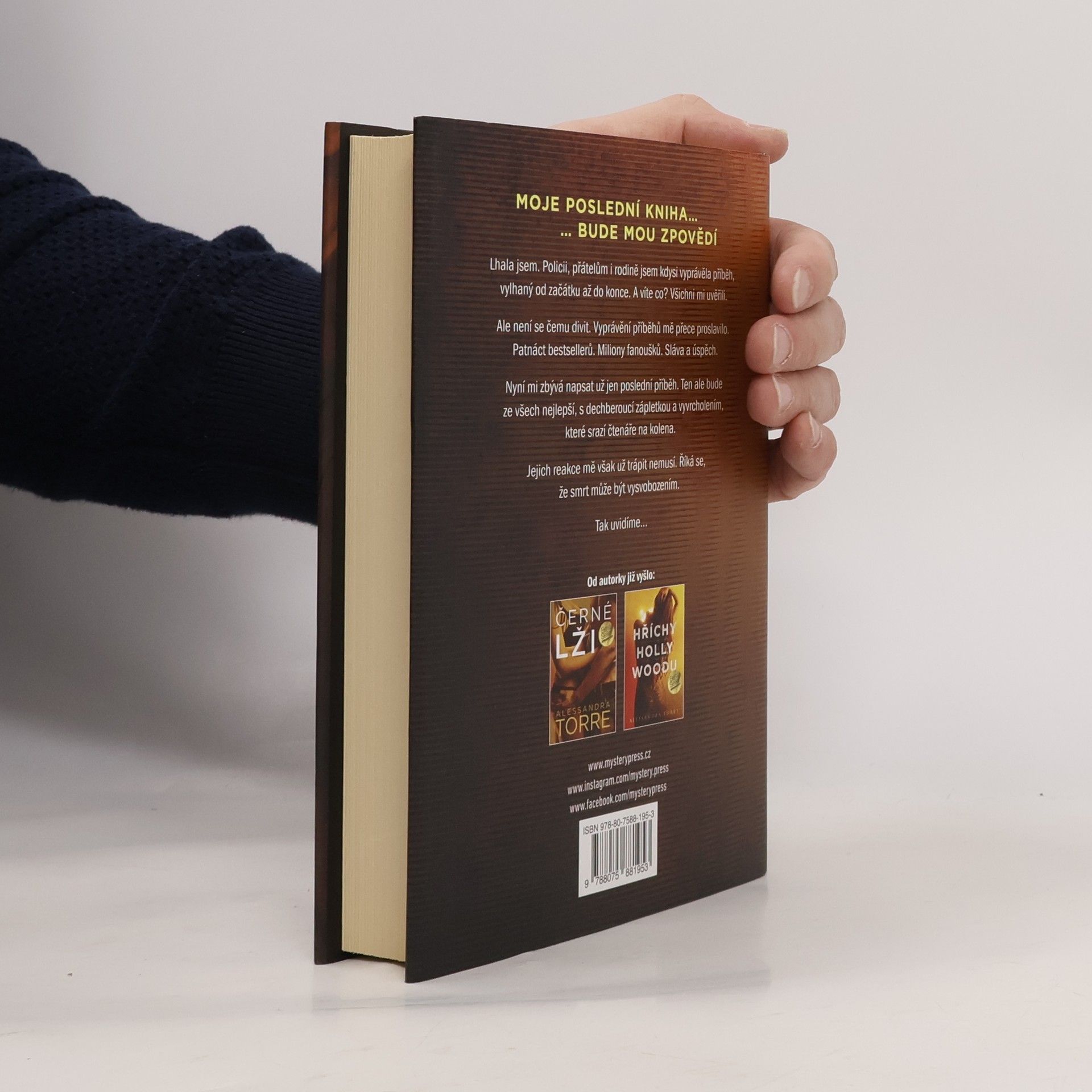 MOJE POSLEDNÍ KNIHA BUDE MOU ZPOVĚDÍ… Lhala jsem. Policii, přátelům i rodině jsem kdysi vyprávěla příběh, vylhaný od začátku až do konce. A víte co? Všichni mi uvěřili. Ale není se čemu divit. Vyprávění příběhů mě přece proslavilo. Patnáct bestsellerů. Miliony fanoušků. Sláva a úspěch. Nyní mi zbývá napsat už jen poslední příběh. Ten ale bude ze všech nejlepší, s dechberoucí zápletkou a vyvrcholením, které srazí čtenáře na kolena. Jejich reakce mě však už trápit nemusí. Říká se, že smrt může být vysvobozením. Tak uvidíme…