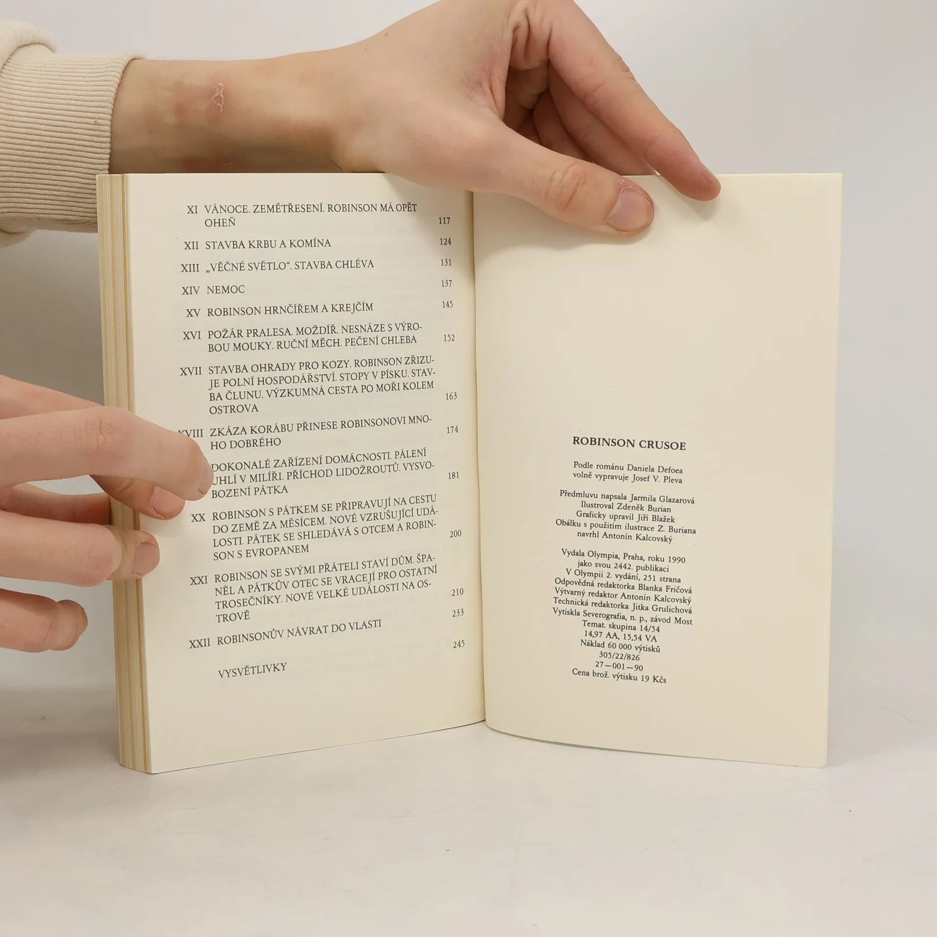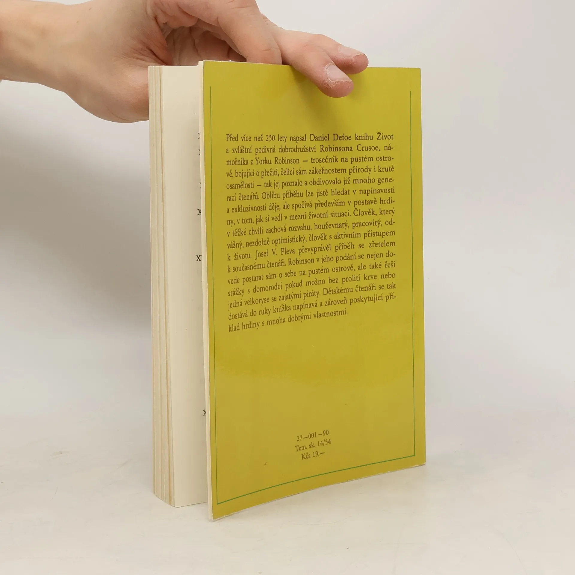 Před více než 250 lety napsal Daniel Defoe knihu Život a zvláštní podivná dobrodružství Robinsona Crusoe, námořníka z Yorku. Robinson - trosečník na pustém ostrově, bojující o přežití, čelící sám zákeřnostem přírody i kruté osamělosti - tak jej poznalo a obdivovalo již mnoho generací čtenářů. Oblibu příběhu lze jistě hledat v napínavosti a exkluzívnosti děje, ale spočívá především v postavě hrdiny, v tom, jak si vedl v mezní životní situaci. Člověk, který v těžké chvíli zachová rozvahu, houževnatý, pracovitý, odvážný, nezdolně optimistický, člověk s aktivním přístupem k životu. Josef V. Pleva převyprávěl příběh se zřetelem k současnému čtenáři. Robinson v jeho podání se nejen dovede postarat sám o sebe na pustém ostrově, ale také řeší srážky s domorodci pokud možno bez prolití krve nebo jedná velkoryse se zajatými piráty. Dětskému čtenáři se tak dostává do rukou knížka napínavá a zároveň poskytující příklad hrdiny s mnoha dobrými vlastnostmi.