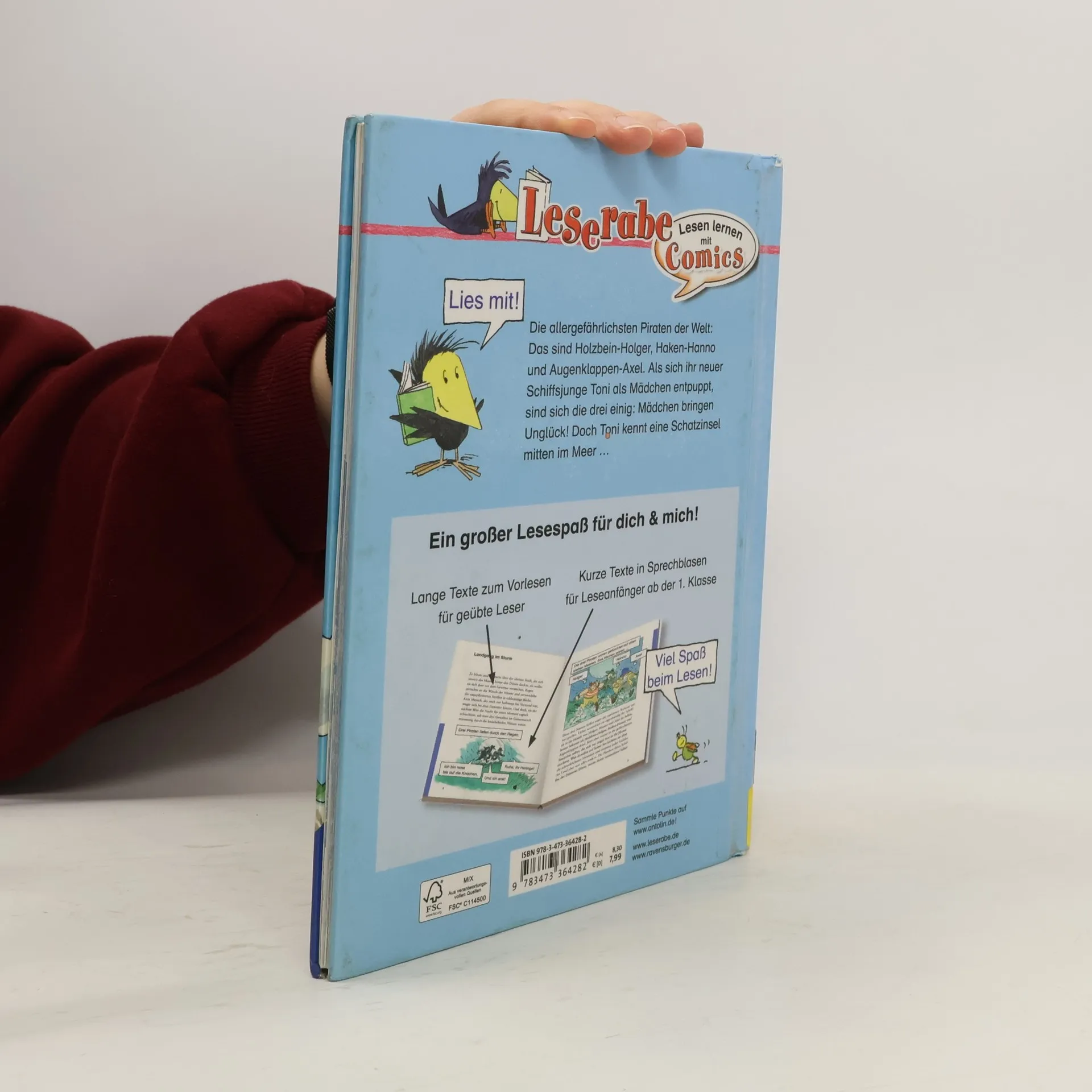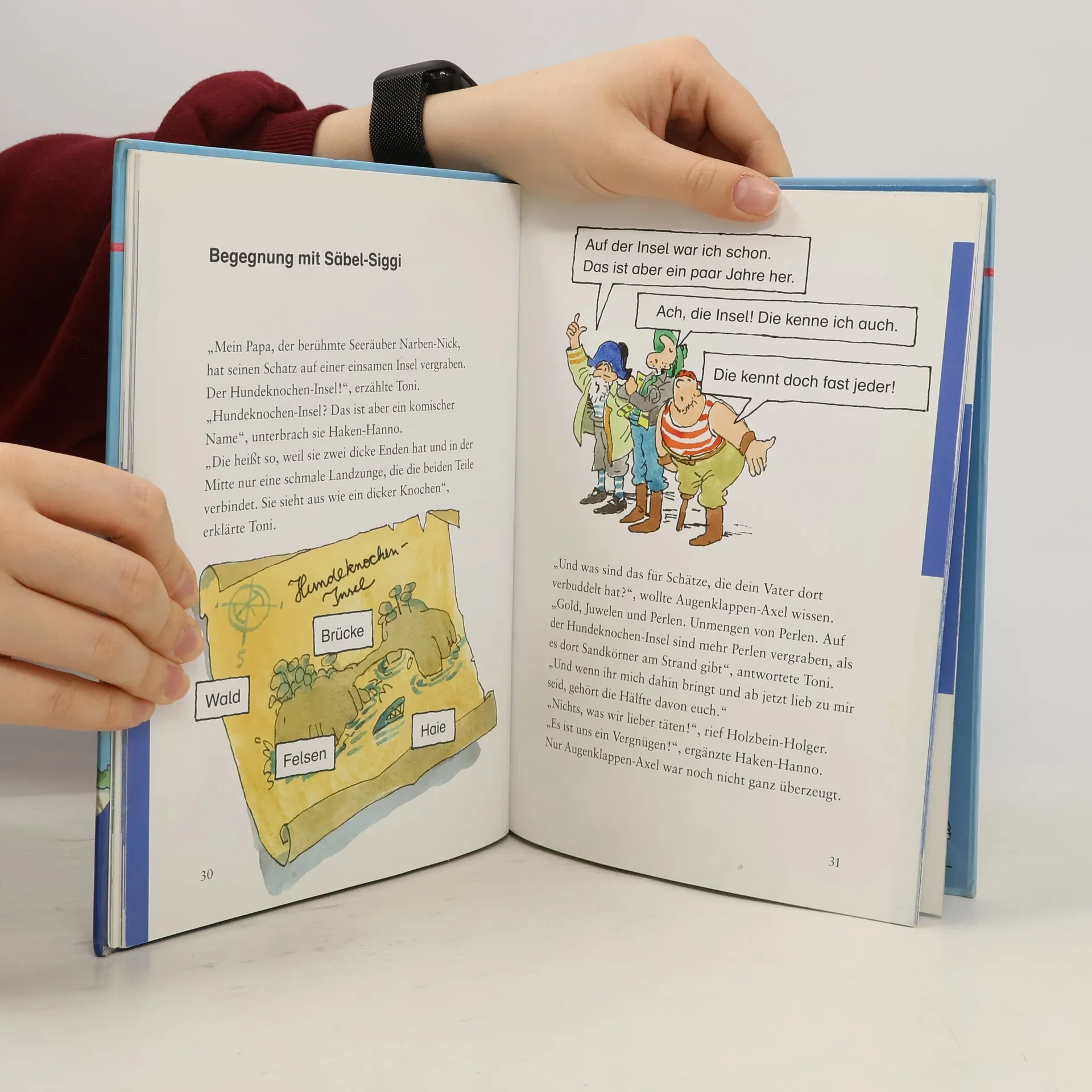 Statt eines Schiffsjungen haben die Piraten Holzbein-Holger, Haken-Hanno und Augenklappen-Axel versehentlich Toni, ein Mädchen, an Bord der Düsteren Dörte geholt, was Unglück bringt, wie jeder Pirat weiss! Doch Toni ist forsch und furchtlos, trickst unterwegs Soldaten vom Patrouillenboot aus, lässt die Piraten Kurs zur fernen Insel nehmen, verspricht einen Perlenschatz im Sand. Der boshafte Piraten-Rivale Säbel-Siggi folgt ihnen, verankert bald seine Grausame Grete in der Inselbucht neben der Düsteren Dörte. Sand und Perlen finden sie nicht, wohl aber Tonis schiffbrüchigen Vater. Wie sie Säbel-Siggi auf der Insel festsetzen, seine Beute auf die Düstere Dörte umladen, das Piraten-Trio davonfährt und Toni und ihrem Vater die Grausame Grete überlassen, wird noch erzählt. - Mögen die Motive auch nicht ganz neu sein, die Story ist flott und voller Komik erzählt, reich und witzig illustriert. Während ein kundiger Vorleser den klein gedruckten Haupttext übernimmt, fügen Leseeinsteiger die kurzen Worte aus den Comic-Blasen ein. Vergnügliche Team-Arbeit ist angesagt! Mit Leserätsel - und fortsetzungsträchtig!