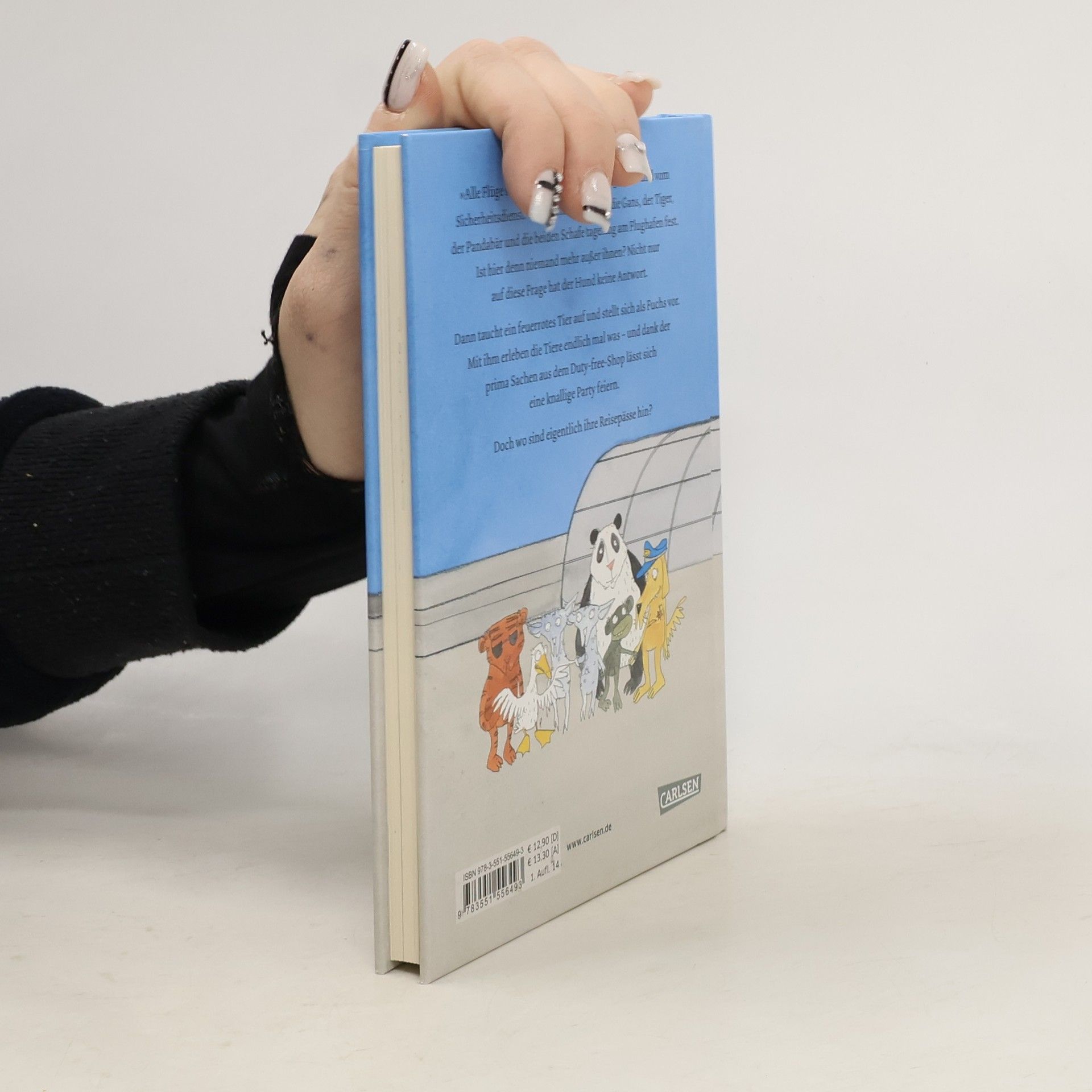 „Alle Flüge sind ersatzlos gestrichen!“, sagt der Hund vom Sicherheitsdienst. Und so sitzen der Panda, der Affe, die Gans, der Tiger und die beiden Schafe am Flughafen fest. Aber wieso ist eigentlich das ganze Gebäude verlassen? Nicht nur auf diese Frage hat der Hund keine Antwort. Dann taucht ein feuerrotes Tier auf und stellt sich als Fuchs vor. Mit ihm erleben die Tiere endlich mal was – und dank all der tollen Sachen aus dem Duty Free Shop lässt sich eine knallige Party feiern. Doch wo sind nur ihre Reisepässe hin?