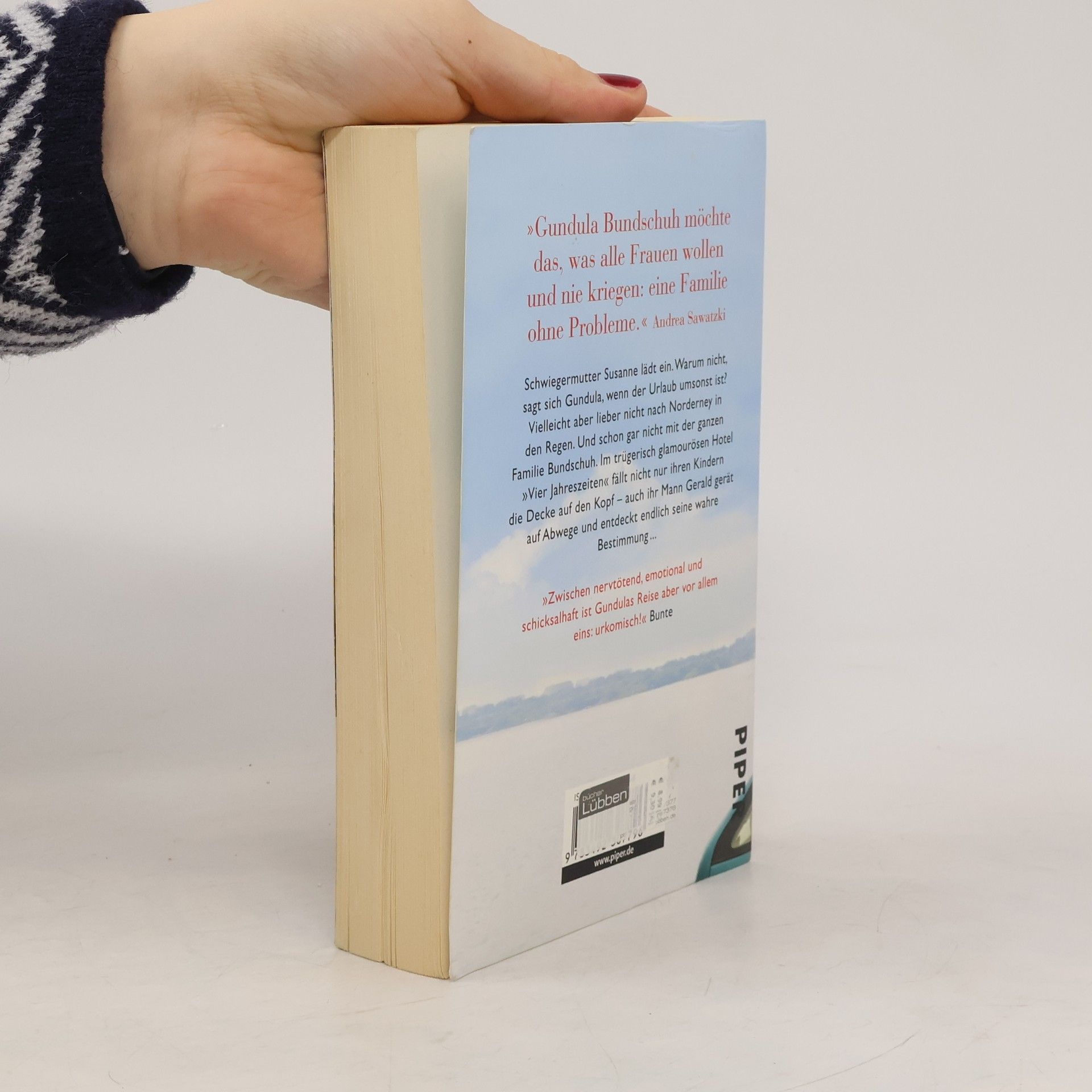 Schwiegermutter Susanne lädt ein. Warum nicht, sagt sich Gundula, wenn der Urlaub umsonst ist? Vielleicht aber lieber nicht nach Norderney in den Regen. Und schon gar nicht mit der ganzen Familie Bundschuh. Im trügerisch glamourösen Hotel »Vier Jahreszeiten« fällt nicht nur ihren Kindern die Decke auf den Kopf – auch ihr Mann Gerald gerät auf Abwege und entdeckt endlich seine wahre Bestimmung ... Die sympathischste Familie der deutschen Literatur – Andrea Sawatzki erzählt Neues aus dem skurrilen Leben der Bundschuhs  Kaum jemand schreibt so amüsant über das deutsche Familienleben wie SPIEGEL-Bestseller-Autorin Andrea Sawatzki. Schon mit den anderen Büchern der Bundschuh-Reihe feierte sie große Erfolge. Die dazugehörigen ZDF-Filme, in denen sie zusammen mit Axel Milberg die Hauptrolle spielt, konnten ebenfalls hohe Einschaltquoten einfahren. Auch ihr neuer Roman wartet mit absurder Situationskomik auf, die trotzdem direkt aus dem Leben gegriffen scheint.