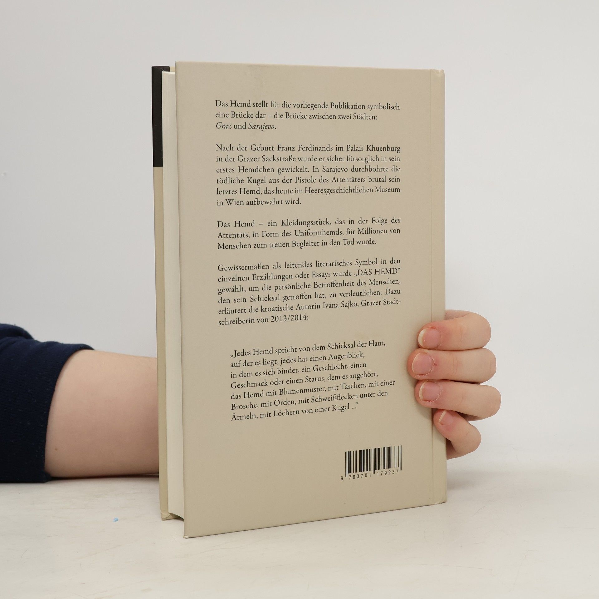 Aus Anlass 100 Jahre Beginn Erster Weltkrieg haben sich ca. 30 Schriftstellerinnen und Schriftsteller mit dem Thema „Das Hemd“ und der Zeitspanne 1863 – 1914 – 2014 auseinandergesetzt. Das Hemd stellt für die vorliegende Publikation symbolisch eine Brücke dar – die Brücke zwischen zwei Städten: Graz und Sarajevo. Nach der Geburt Franz Ferdinands im Palais Khuenburg in der Grazer Sackstraße wurde er sicher fürsorglich in sein erstes Hemdchen gewickelt. In Sarajevo durchbohrte die tödliche Kugel aus der Pistole des Attentäters brutal sein letztes Hemd, das heute im Heeresgeschichtlichen Museum in Wien aufbewahrt wird. Das Hemd – ein Kleidungsstück, das in der Folge des Attentats, in Form des Uniformhemds, für Millionen von Menschen zum treuen Begleiter in den Tod wurde. Gewissermaßen als leitendes literarisches Symbol in den einzelnen Erzählungen oder Essays wurde „DAS HEMD“ gewählt, um die persönliche Betroffenheit des Menschen, den sein Schicksal getroffen hat, zu verdeutlichen. Dazu erläutert die kroatische Autorin Ivana Sajko, Grazer Stadtschreiberin von 2013/2014: „Jedes Hemd spricht von dem Schicksal der Haut, auf der es liegt, jedes hat einen Augenblick, in dem es sich bindet, ein Geschlecht, einen Geschmack oder einen Status, dem es angehört, das Hemd mit Blumenmuster, mit Taschen, mit einer Brosche, mit Orden, mit Schweißflecken unter den Ärmeln, mit Löchern von einer Kugel …“