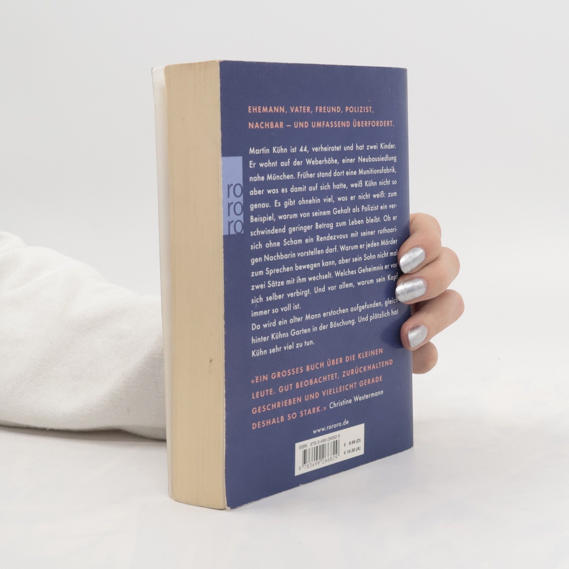 Ehemann, Vater, Freund, Polizist, Nachbar – und umfassend überfordert. Martin Kühn ist 44, verheiratet und hat zwei Kinder. Er wohnt auf der Weberhöhe, einer Neubausiedlung nahe München. Früher stand dort eine Munitionsfabrik, aber was es damit auf sich hatte, weiß Kühn nicht so genau. Es gibt ohnehin viel, was er nicht weiß: Zum Beispiel, warum von seinem Gehalt als Polizist ein verschwindend geringer Betrag zum Leben bleibt. Ob er sich ohne Scham ein Rendezvous mit seiner rothaarigen Nachbarin vorstellen darf. Warum er jeden Mörder zum Sprechen bewegen kann, aber sein Sohn nicht mal zwei Sätze mit ihm wechselt. Welches Geheimnis er vor sich selber verbirgt. Und vor allem, warum sein Kopf immer so voll ist. Da wird ein alter Mann erstochen aufgefunden, gleich hinter Kühns Garten in der Böschung. Und plötzlich hat Kühn sehr viel zu tun.