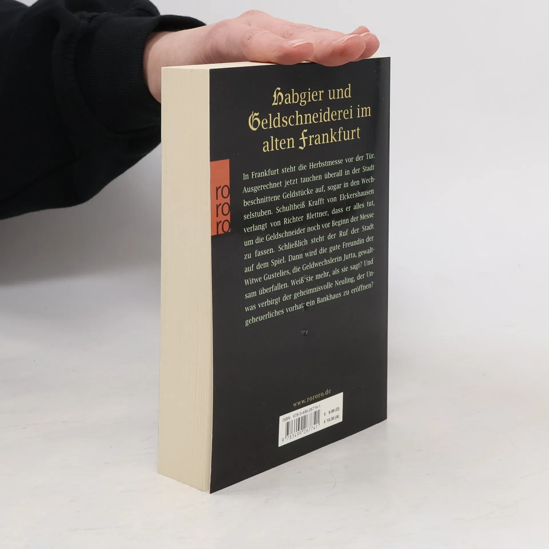 Habgier und Geldschneiderei im alten Frankfurt In Frankfurt steht die Herbstmesse vor der Tür. Ausgerechnet jetzt tauchen überall in der Stadt beschnittene Geldstücke auf, sogar in den Wechselstuben. Schultheiß Krafft von Elckershausen verlangt von Richter Blettner, dass er alles tut, um die Geldschneider noch vor Beginn der Messe zu fassen. Schließlich steht der Ruf der Stadt auf dem Spiel. Dann wird die gute Freundin der Witwe Gustelies, die Geldwechslerin Jutta, gewaltsam überfallen. Weiß sie mehr, als sie sagt? Und was verbirgt der geheimnisvolle Neuling, der Ungeheuerliches vorhat: ein Bankhaus zu eröffnen?