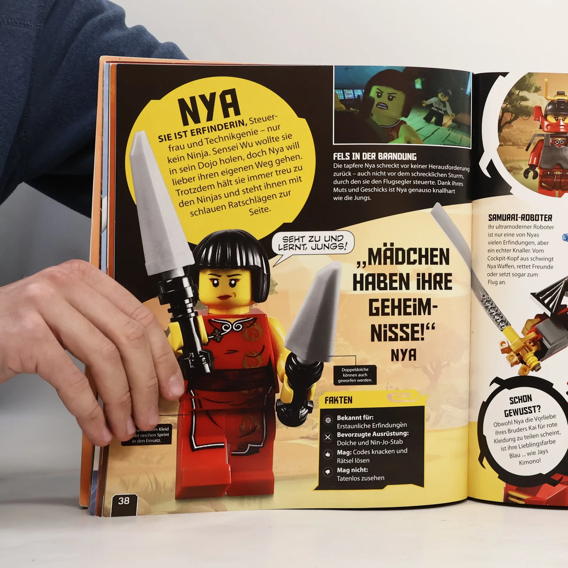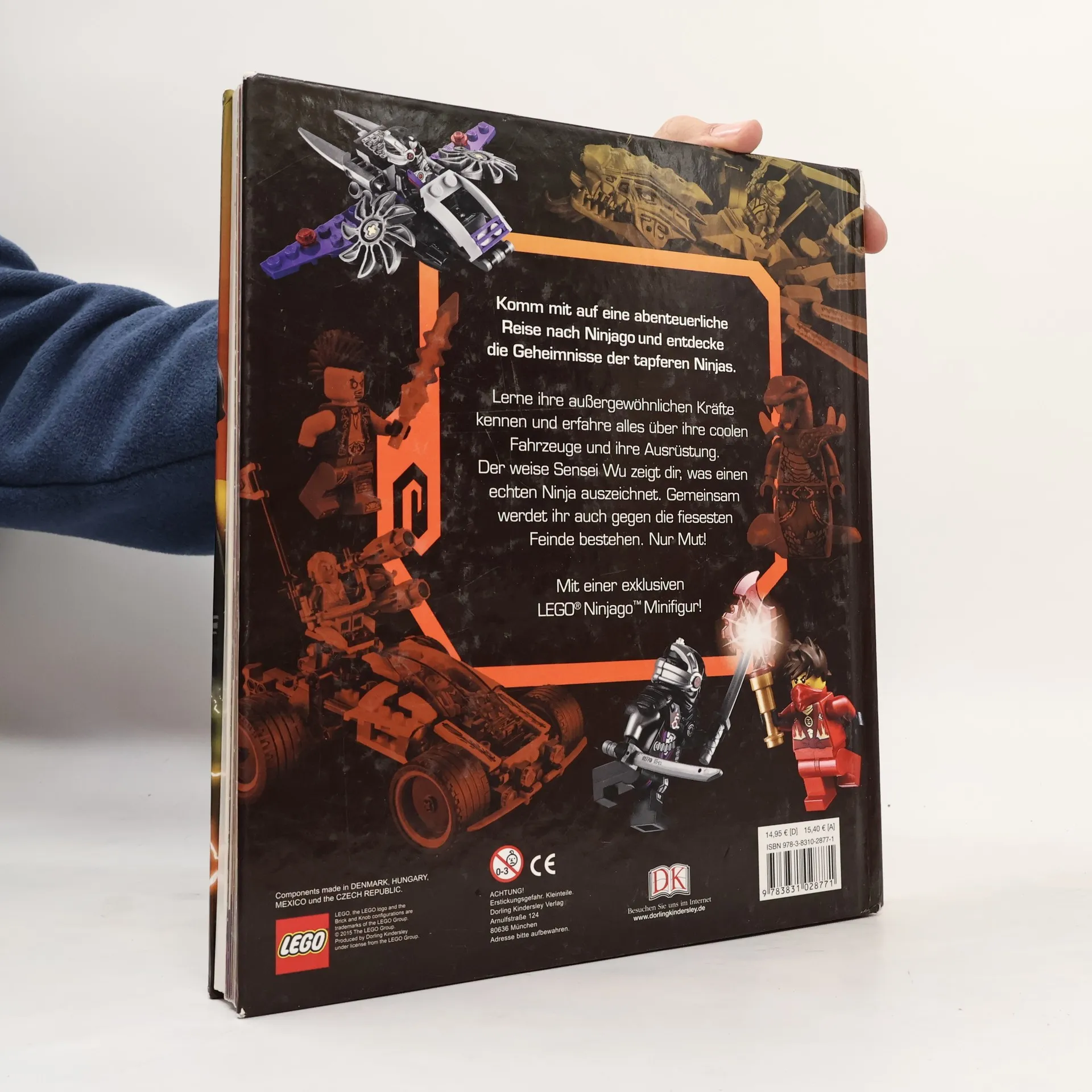 Ninjago ist ein friedlicher Ort, bis er von Lord Garmadon und seiner Skelett-Armee überfallen wird. Nur der Weise Sensei Wu und seine Ninja-Lehrlinge können Ninjago retten, indem sie sich für das Gute einsetzen. Dafür werden die Lehrlinge von Sensei Wu in der Kampfkunst Spinjitzu ausgebildet. - Die Gut-Böse-Geschichte basiert auf der gleichnamigen LEGO-Spielzeug-Produktlinie, die auch als Action-Fernsehserie bekannt ist. Sie ist mit 54 Episoden in 5 Staffeln die am längsten laufende LEGO-Serie. In diesem Jahr lief die 4. und 5. Staffel. Wie beim Anfang des Jahres erschienenen "LEGO Ninjago - Das große Ninja-Lexikon" (ID-A 12/15) werden die LEGO-Ninja-Figuren, ihre beeindruckende Kampfausrüstung und Fahrzeuge in Übergröße auf der TV-Serie entnommenen Fotos gezeigt. Auf Doppelseiten präsentieren sich die Ninjas sowie deren Gegner mit ihren Eigenheiten und Fähigkeiten. Kleine Textanmerkungen und Bildbeschriftungen geben zusätzliche Informationen. Der Sachbildband ist farbig und für die Zielgruppe ansprechend gestaltet. Beigefügt ist die exklusive LEGO-Minifigur Sensei Wu