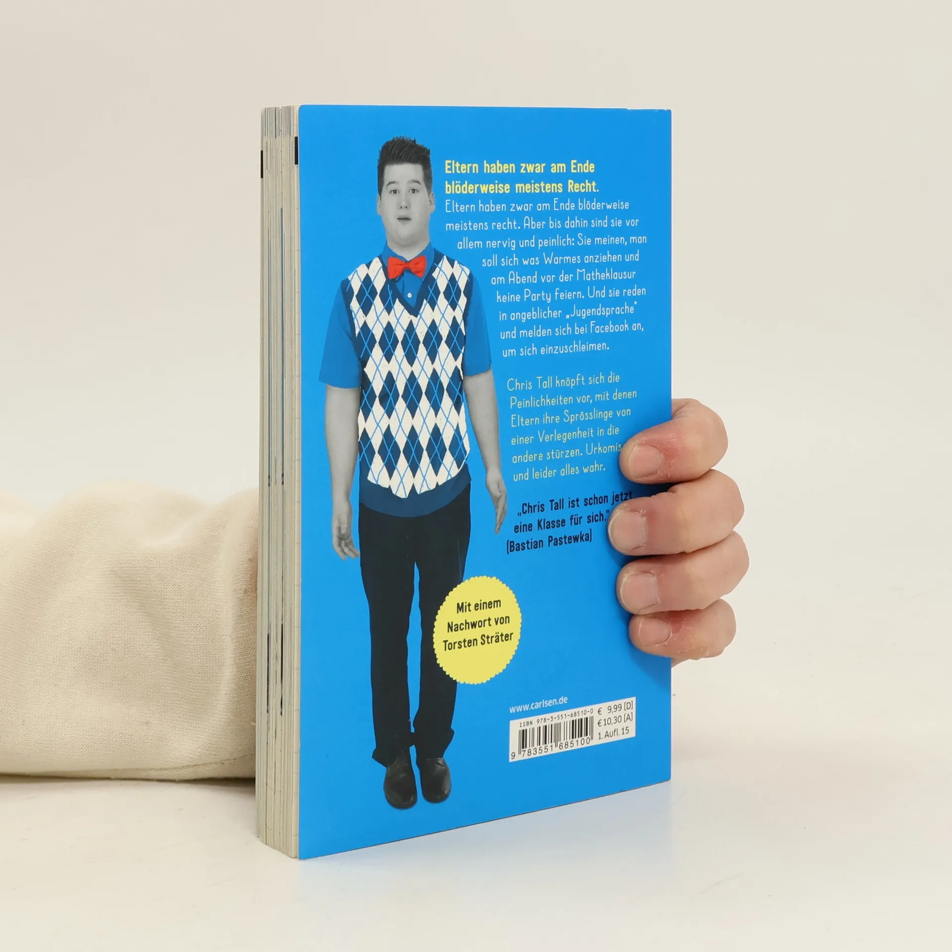 Eltern haben zwar am Ende blöderweise meistens recht. Aber bis dahin sind sie vor allem nervig und peinlich. Diese immer gleichen Ermahnungen, sich was Warmes anzuziehen und endlich sein Zimmer aufzuräumen. Das Partyverbot nur wegen der läppischen Klassenarbeit morgen. Und dann diese Versuche, coole Kumpels zu sein, die in angeblicher „Jugendsprache“ reden und sich bei Facebook anmelden, weil sie denken, sie träfen da ihre Kinder. Chris Tall knöpft sich die Peinlichkeiten vor, mit denen Eltern ihr Sprösslinge von einer Verlegenheit in die anderen stürzen - voller Mutterliebe, Selbstironie und Respektlosigkeit. Bastian Pastewka über Chris Tall: „Chris Tall ist in meinen Augen einer der spannendsten Komiker der jüngsten Generation. Und zwar weil er den Witz bei sich selber sucht; und nicht etwa bei den anderen, über die man trefflich lästern könnte. Chris Tall ist schon jetzt eine Klasse für sich.“