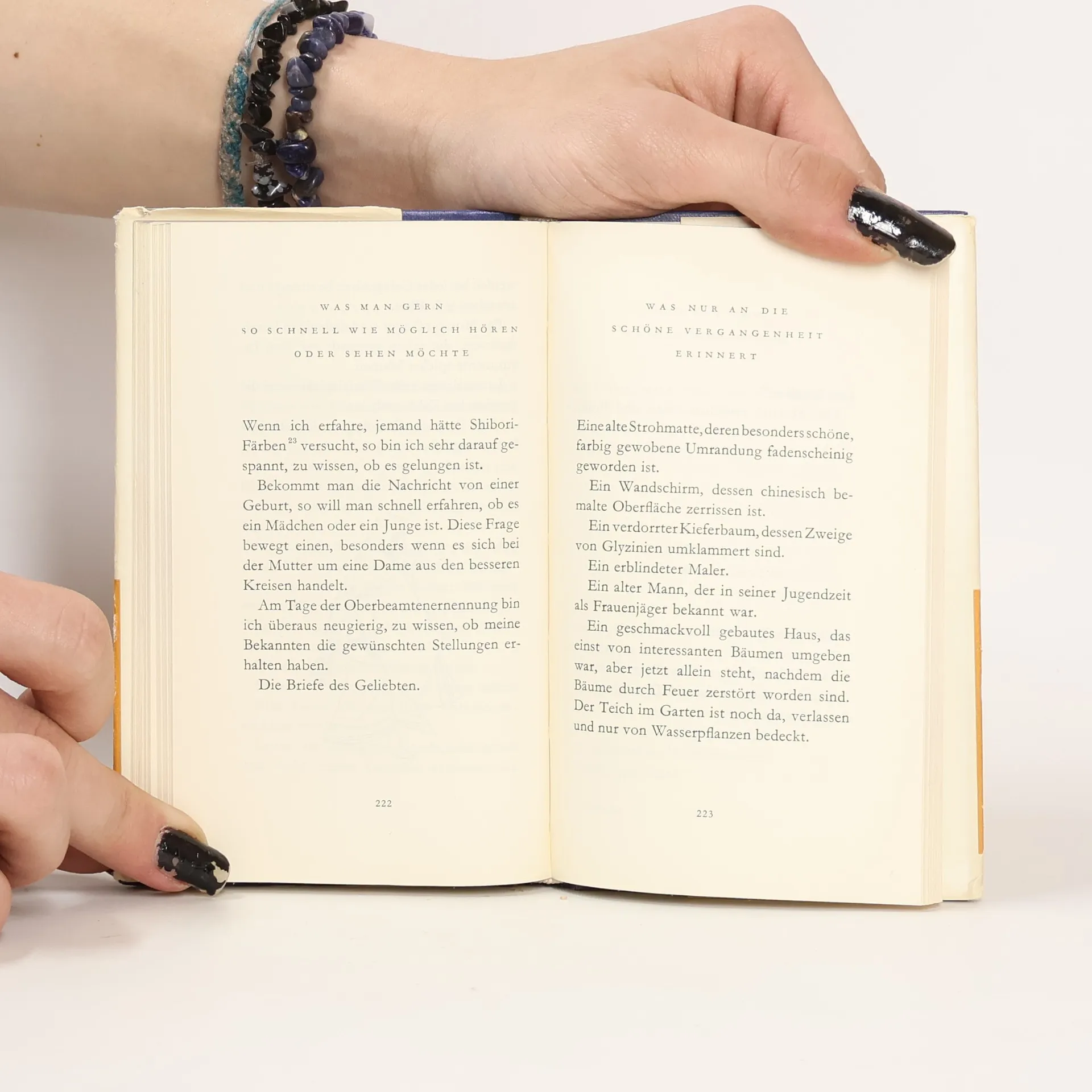 Eine poetische Zeitreise an den japanischen Kaiserhof des Jahres 1000 wird in dieser Neuübersetzung erstmals vollständig auf Deutsch präsentiert. Sei Shonagon nutzte ein Bündel edlen Papiers als Notizbuch, um ihre Gedanken festzuhalten – von Vertraulichem bis Delikatem aus den Privatgemächern des Kaiserpalasts. Ihre Schilderungen, sei es über geistreiche Zwiegespräche oder das Schwertlilienfest, wirken wie mit Tuschepinsel gemalte Ewigkeitsbilder. Sie plaudert inspirierend über sich und ihre Welt. Ihre «Telegramme» gewähren tiefe Einblicke in das Japan der Heian-Zeit und ihr eigenes Seelenleben. Dieses radikal subjektive Bekenntnisbuch, erstmals vollständig ins Deutsche übersetzt und von falscher Süßlichkeit befreit, besticht durch seinen klaren, ungekünstelten Ton. Eine kluge, selbstbewusste Frau stellt Weltbewegendes neben scheinbar Banales und spricht über Mode und Galanterie, während sie das Intrigenspiel am Hof entlarvt. Aus kritischer Halbdistanz zeigt sie das Treiben einer müßiggängerischen Feudalkaste, die sich mit Kalligraphie, Flötenspiel oder Fußball beschäftigt. Auch heute erkennen wir die eitlen Parvenüs und Stilikonen, die es schon vor tausend Jahren gab. Der Einband aus bedrucktem Feinleinen, die farbige Fadenheftung und der Zweifarbdruck auf Satinpapier machen diese Ausgabe zu einer bibliophilen Kostbarkeit.