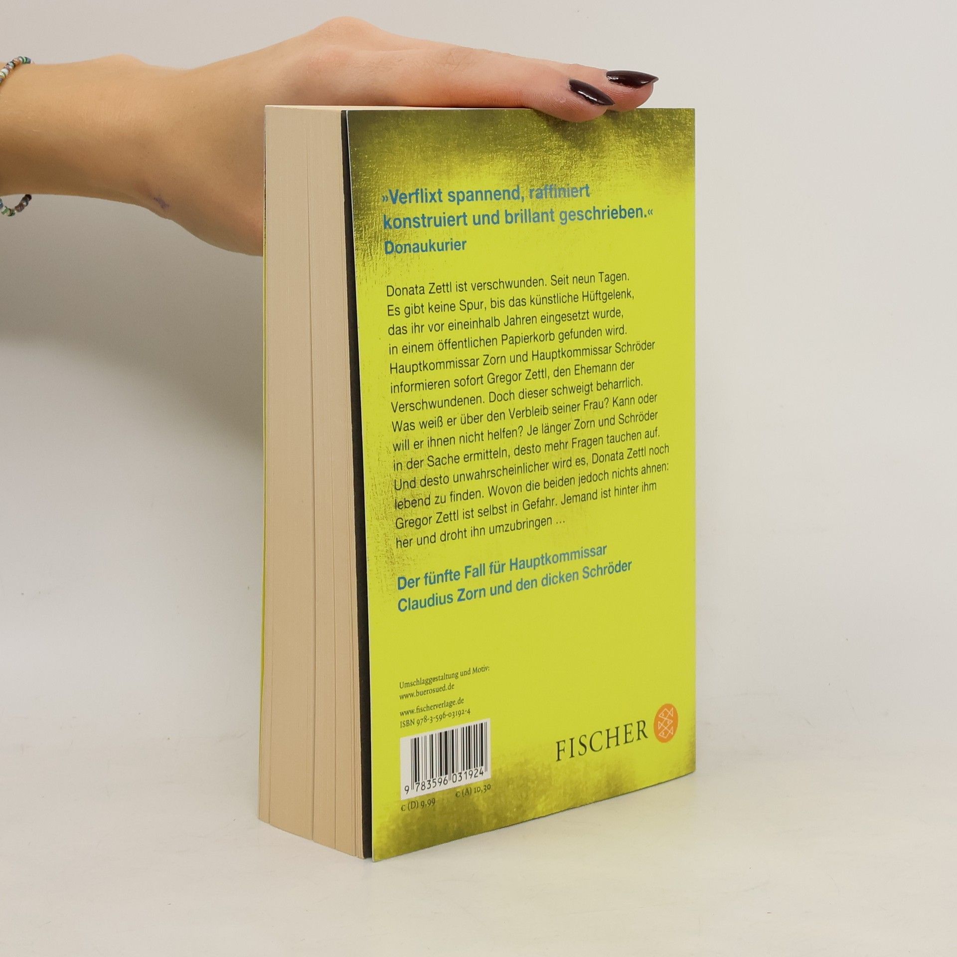 »MACHE ICH IHNEN ANGST? Das ist gut. Es gehört zu meinem Job. Und ich bin gut darin. Sehr gut.« Es regnet Fische auf die Stadt. Erst landet eine kleine Elritze in der Dachrinne der Kirche auf dem Hasenberg, kurz darauf klatschen Aale und Lachse auf die nächtlichen Straßen und Wege. Bei Morgengrauen wird das Ausmaß des ungewöhnlichen Phänomens sichtbar. Doch während der Aufräumarbeiten kommt etwas viel Seltsameres zutage: Ein künstliches Hüftgelenk liegt im Mülleimer unter einer glitschigen Rotfeder. Zorn und Schröder ermitteln, dass es einer Frau eingesetzt wurde. Doch diese Frau ist verschwunden. Die beiden Kommissare treffen nur ihren Mann Gregor Zettl an, der, wie Schröder feststellt, vor Jahren ein gefeierter Popstar war. Je mehr Zorn und Schröder ermitteln, desto mehr Fragen tauchen auf: Warum ist Zettls Frau verschwunden? War sie in dunkle Machenschaften verstrickt? Warum kann Gregor Zettl den Ermittlern keine Informationen liefern? Ist er wirklich der unwissende Ehemann, der er vorgibt zu sein? Ist Zettls Frau tot? Was die beiden Ermittler nicht wissen: Jemand ist hinter Zettl her, er schüchtert ihn ein und droht ihn umzubringen …