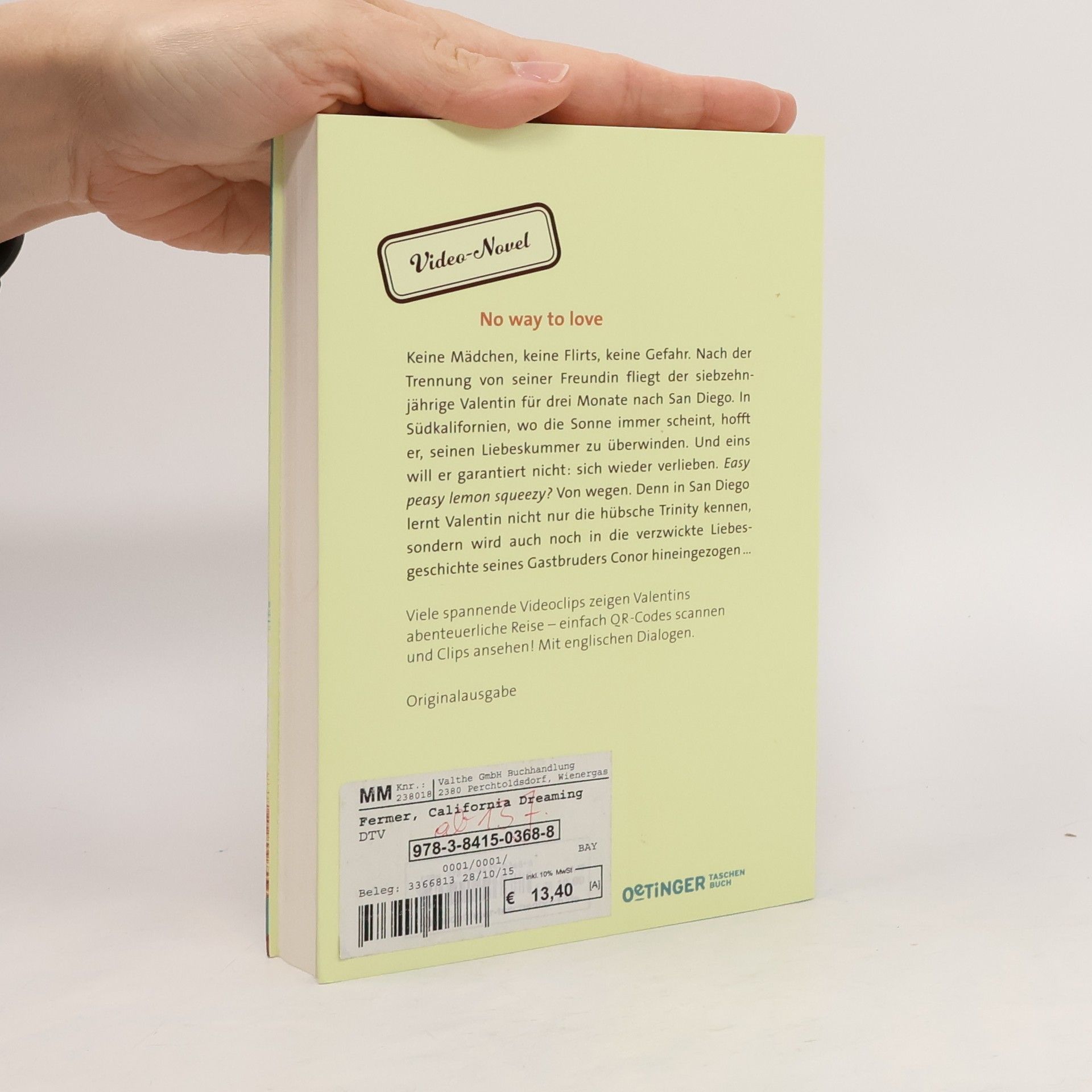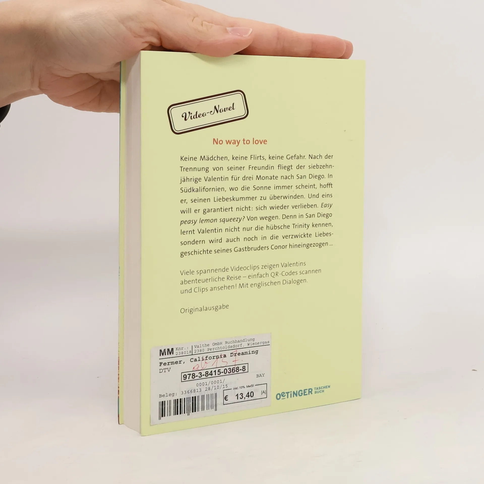 Keine Mädchen, keine Flirts, keine Gefahr. No way to love. Nach der Trennung von seiner Freundin fliegt der siebzehnjährige Valentin für drei Monate nach San Diego. In Südkalifornien, wo die Sonne immer scheint, hofft er, seinen Liebeskummer zu überwinden. Und eins will er garantiert nicht: sich wieder verlieben. Easy peasy lemon squeezy? Von wegen. Denn in San Diego lernt Valentin nicht nur die hübsche Trinity kennen, sondern wird auch noch in die verzwickte Liebesgeschichte seines Gastbruders Conor hineingezogen … Video Novel – Ein Roman mit 45 Videoclips Einfach QR-Codes scannen und Clips anschauen! Weiteres Extra: Mit englischen Dialogen – locker und leicht zu lesen