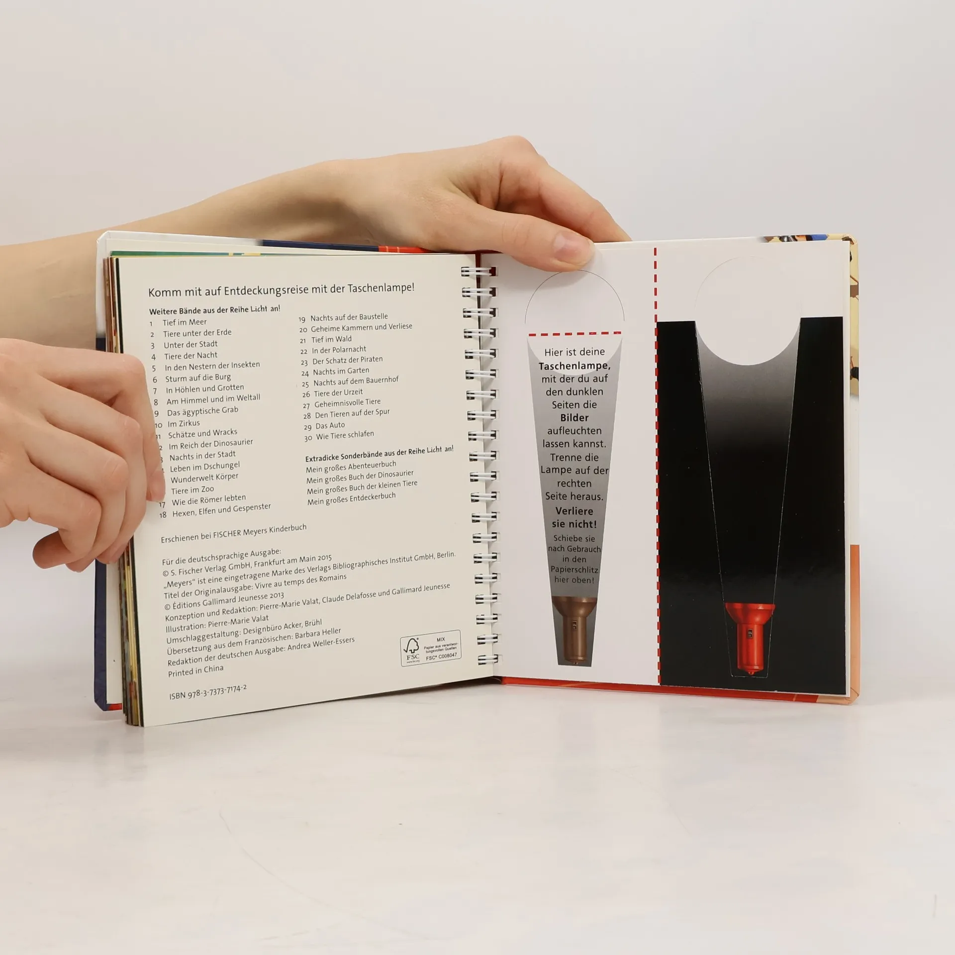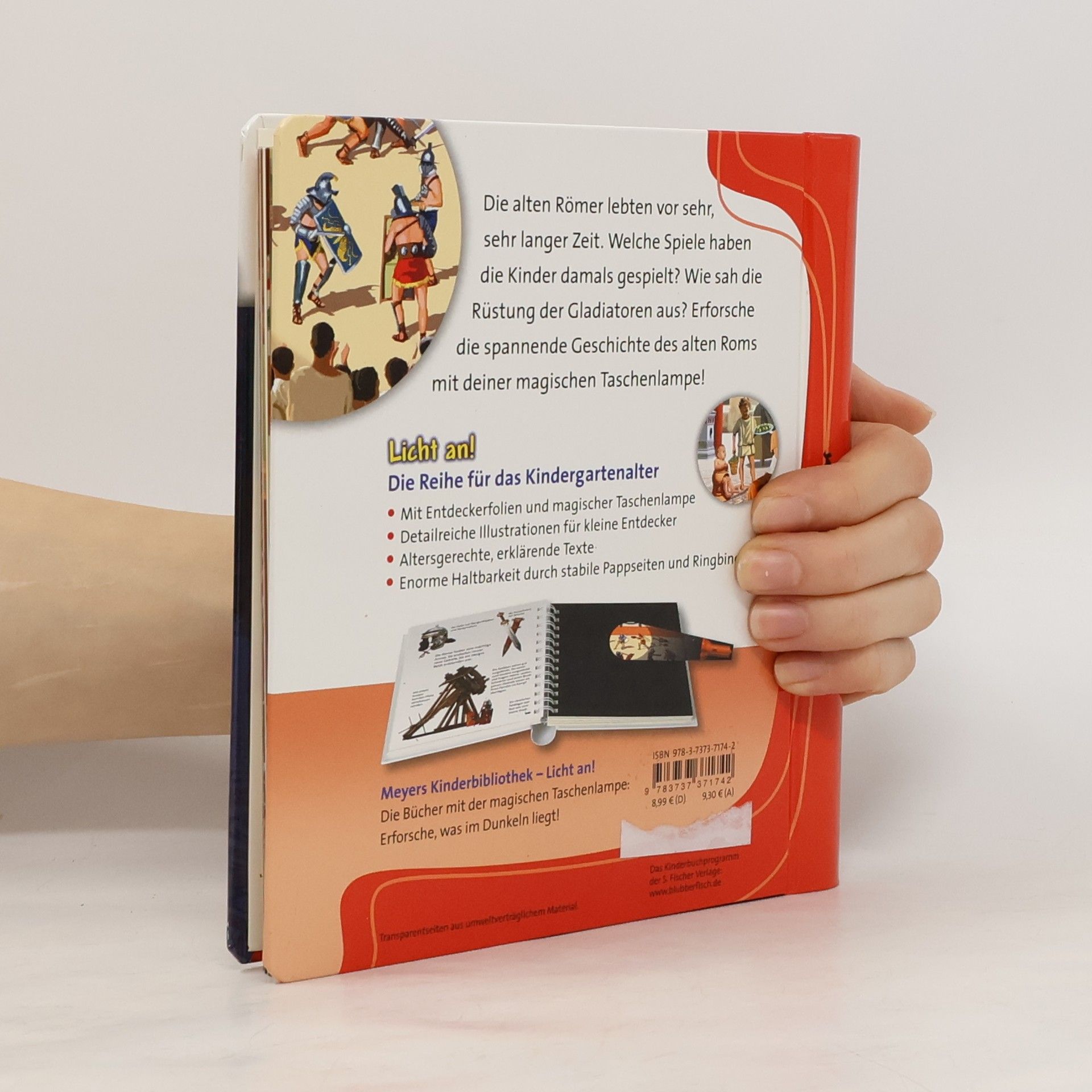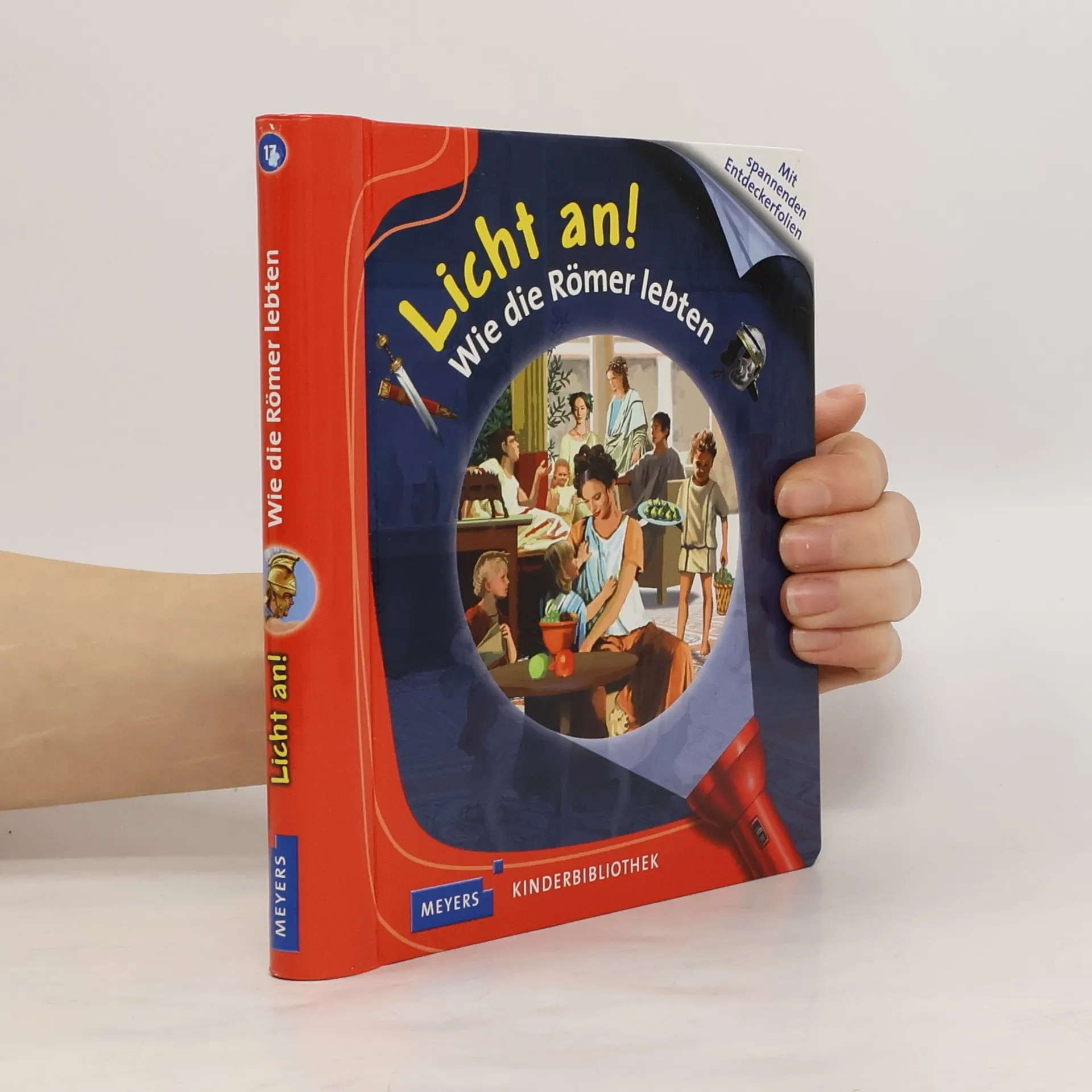 ***Meyers Kinderbiblitohek LICHT AN – die Reihe für das Kindergartenalter*** In der spannenden Sachbilderbuchreihe »Meyers Kinderbibliothek – Licht an!« entdecken Kinder, was normalerweise im Dunkeln liegt. Mit der beiliegenden »Taschenlampe« aus Papier können die kleinen Forscher unter den Entdeckerfolien gezielt bunte Szenen beleuchten und in verborgene Welten eintauchen. Ein außergewöhnlicher Einblick in den Alltag im alten Rom. Wohin gingen die Römer, um sich zu waschen? Wo konnte man Gladiatoren und wilde Tiger kämpfen sehen? Und was ist ein Aquädukt? Die magische Taschenlampe beleuchtet bunt gefüllte Marktstände, prachtvolle Mosaikbilder und die eindrucksvollen Masken der Schauspieler im Amphitheater. + Mit Entdeckerfolien und magischer Taschenlampe + Detailreiche Illustrationen für kleine Entdecker + Altersgerechte, erklärende Texte + Enorme Haltbarkeit durch stabile Pappseiten und Ringbindung Bei Antolin gelistet