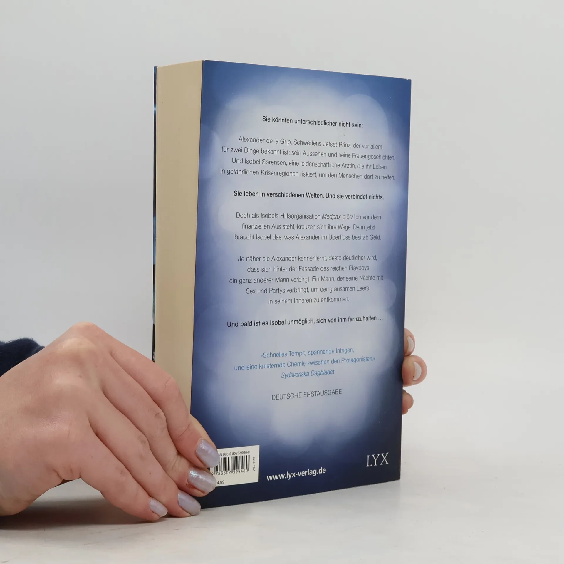 Sie könnten unterschiedlicher nicht sein: Alexander de la Grip, Schwedens Jetset-Prinz, der vor allem für zwei Dinge bekannt ist: sein Aussehen und seine Frauengeschichten. Und Isobel Sørensen, eine leidenschaftliche Ärztin, die ihr Leben in Krisenregionen riskiert, um Menschen zu helfen. Sie leben in verschiedenen Welten. Und sie verbindet nichts. Doch als Isobels Hilfsorganisation Medpax plötzlich vor dem finanziellen Aus steht, kreuzen sich ihre Wege. Denn jetzt braucht Isobel das, was Alexander im Überfluss besitzt: Geld. Je näher sie Alexander kennenlernt, desto deutlicher wird, dass sich hinter der Fassade des reichen Playboys ein ganz anderer Mann verbirgt. Ein Mann, der seine Nächte mit Sex und Partys verbringt, um der grausamen Leere in seinem Inneren zu entkommen. Und bald ist es Isobel unmöglich, sich von ihm fernzuhalten ... „Schnelles Tempo, spannende Intrigen, und eine knisternde Chemie zischen den Protagonisten.“ SYDSVENSKA DAGBLADET Band 2 der schwedischen Bestseller-Trilogie