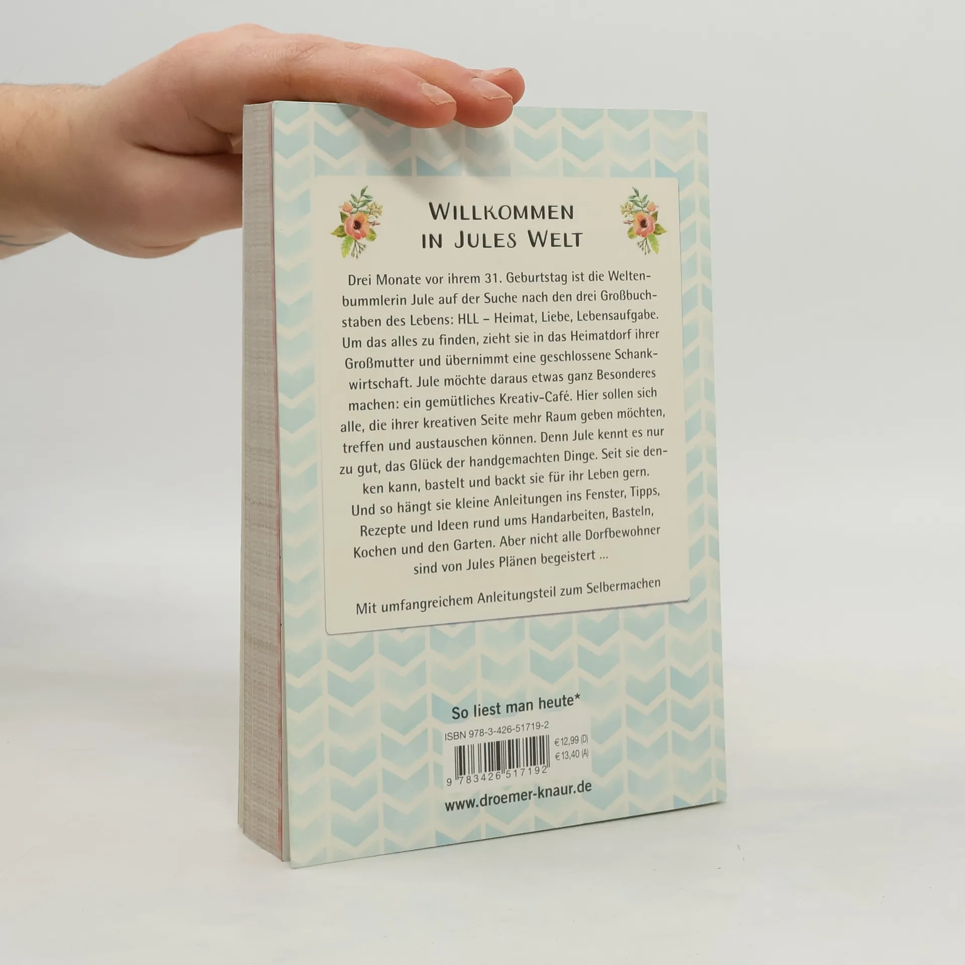Haben Sie’s schon mal getan? Etwas selbst gemacht? Dann wissen Sie ja, wie wunderbar sich das anfühlt. Auch Jule, die Heldin aus Marina Boos' erstem Kreativ-Roman „Jules Welt“ kennt es gut, das Glück der handgemachten Dinge. Drei Monate vor ihrem 31. Geburtstag ist die Weltenbummlerin Jule auf der Suche nach den drei Großbuchstaben des Lebens: HLL – Heimat, Liebe, Lebensaufgabe. Um das alles zu finden, zieht sie in das Heimatdorf ihrer Großmutter und übernimmt eine geschlossene Schankwirtschaft. Jule möchte daraus etwas ganz Besonderes machen: ein gemütliches Kreativ-Café. Hier sollen sich alle, die ihrer kreativen Seite mehr Raum geben möchten, treffen und austauschen können. Denn seit sie denken kann, bastelt und backt Jule für ihr Leben gern. Und so hängt sie kleine Anleitungen ins Fenster, Tipps, Rezepte und Ideen rund ums Handarbeiten, Basteln, Kochen und den Garten. Aber nicht alle Dorfbewohner sind von Jules Plänen begeistert … Eine moderne Sinnsuche-Geschichte, in der es um das Glück geht, Dinge wieder selber zu machen. Mit umfangreichem Anleitungsteil zum Selbermachen.