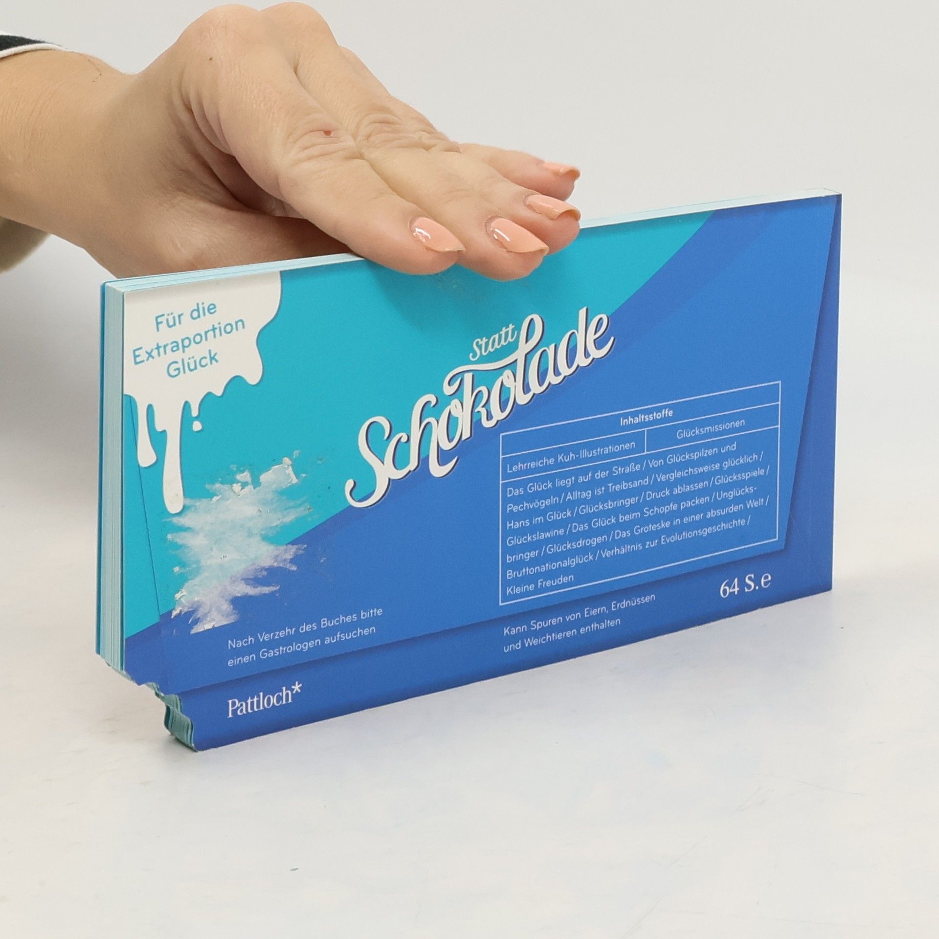 Alles, was sonst noch glücklich macht Dieses Buch kann es in jeder Hinsicht mit einer Tafel Schokolade aufnehmen: Der positive Effekt, der sich auf Ihre Psyche bei der Lektüre einstellen wird, ist enorm! „Statt Schokolade“ ist ein kleines, feines Sammelsurium an Dingen, die glücklich machen. Unerwartete Denkanstöße, originelle Ideen und inspirierende Glücksmissionen werden Ihren Alltag bereichern. Auch die herrlich witzigen Kuh-Illustrationen sind eine Köstlichkeit und helfen der guten Laune wieder auf die Sprünge. Das Geschenk für die Extraportion Glück - ganz ohne erhobenen Zeigefinger des Zahnarztes oder Fitness-Coachs – und für viele Anlässe! Besondere Ausstattung: mit Biss-Stanze im rechten unteren Eck!
