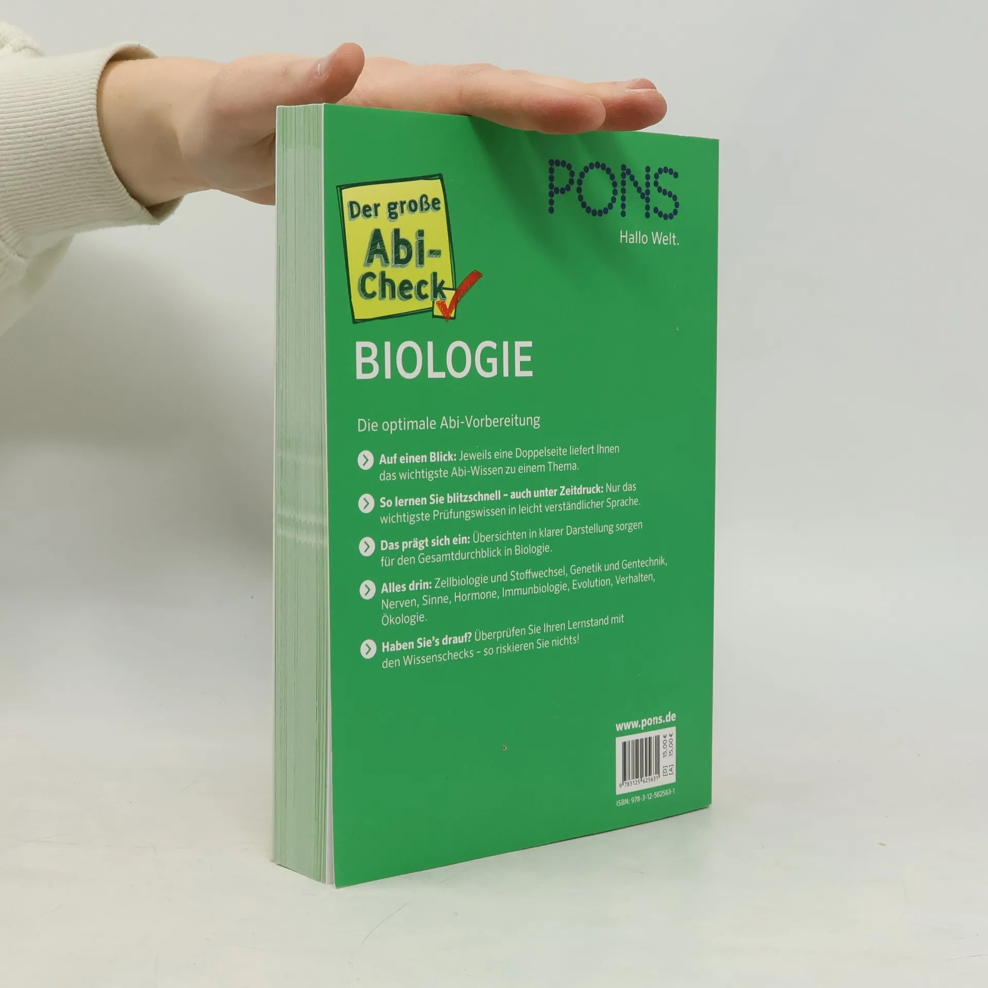 Die optimale Abi-Vorbereitung - Prüfungswissen auf einen Blick! Geeignet für Abiturienten und Schüler der Oberstufe Cleveres Doppelseitenprinzip: Alles zu einem Thema kompakt und übersichtlich Wissen schnell erfasst durch leicht verständliche Sprache und übersichtliche Darstellung Themenbereiche: Zellbiologie und Stoffwechsel, Genetik und Gentechnik, Nerven, Sinne, Hormone, Immunbiologie, Evolution, Verhalten, Ökologie