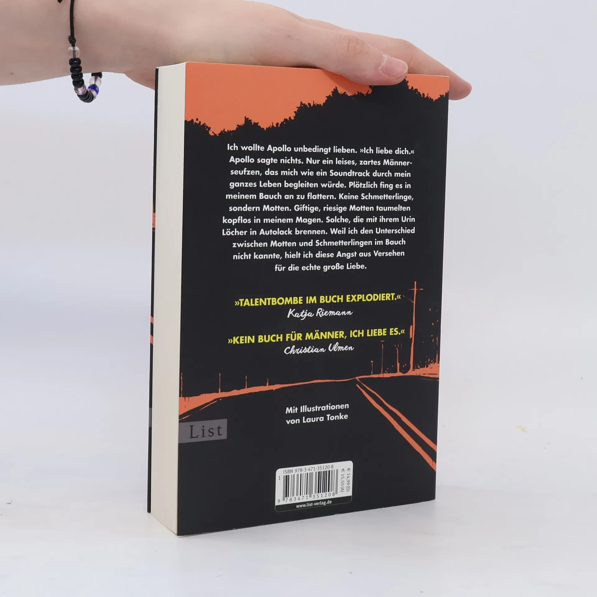 Ich wollte Apollo unbedingt lieben. „Ich liebe dich.“ Apollo schwieg und ließ nur ein leises, zartes Seufzen hören, das mich mein Leben lang begleiten würde. Plötzlich begann es in meinem Bauch zu flattern – keine Schmetterlinge, sondern giftige, riesige Motten, die mit ihrem Urin Löcher in Autolack brennen. Diese Angst hielt ich fälschlicherweise für große Liebe. Für Luzy, die Berufsfreundin, sind Männer das Zentrum ihrer Welt. Allein sein ist für sie schwierig, auch wenn sie es nicht mag. In einem Raum kann sie das, aber ohne einen Freund wird es kompliziert. Bisher konnte sie sich immer retten, indem sie sich rechtzeitig den Nächsten suchte: Apollo, Peter, Jonas. Sie springt von einem Mann zum anderen, investiert all ihre Energie in oft flüchtige Beziehungen. Doch plötzlich geht etwas schief, und Luzys Verhalten kann ihre Trennungsangst nicht mehr verbergen. Im Streit bricht sie Jonas den Arm und muss fortan 100 Meter Abstand zu ihm halten. Mit Liebeskummer und einem Entfernungsmesser in der Hand erkennt sie, dass sich etwas ändern muss, denn aufrichtige Liebe ist ihr fremd. Mit Illustrationen von Laura Tonke.