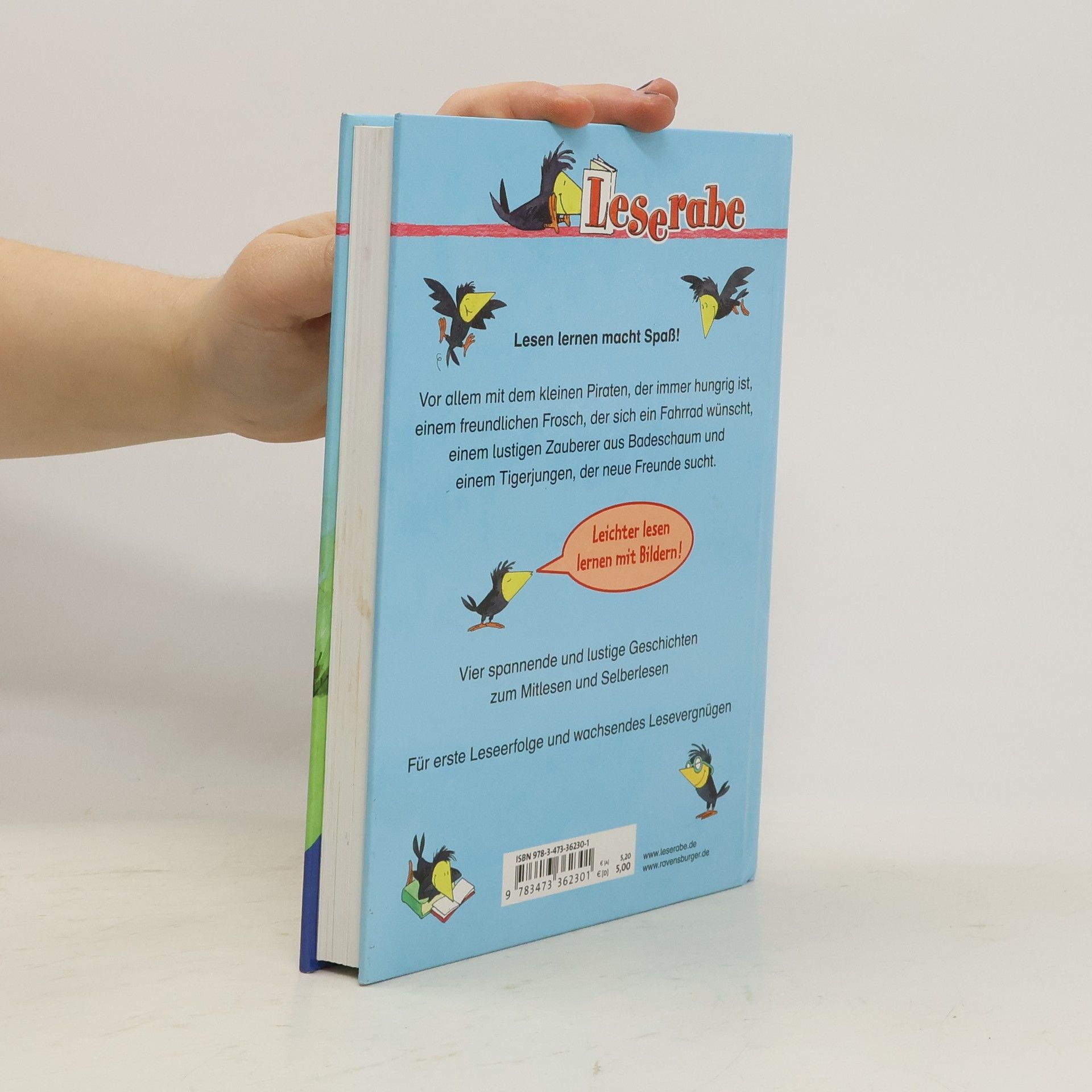 In den 4 bekannten Geschichten zum Mitlesen und Selberlesen lernen die Kinder den kleinen Piraten, der immer hungrig ist, einen Frosch, der sich ein Fahrrad wünscht, einen Zauberer aus Badeschaum und einen unternehmungslustigen Tigerjungen kennen. Ab 5.