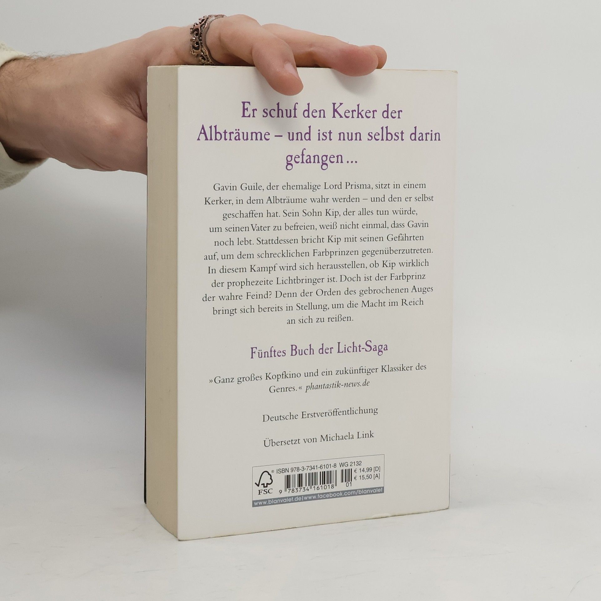 Wahnsinnige Magier, grausame Mörder, machtgierige Adelige – und niemand kann sie aufhalten Gavin Guile, der ehemalige Lord Prisma, sitzt in einem Kerker, in dem Albträume wahr werden – und den er selbst geschaffen hat. Sein Sohn Kip, der alles tun würde, um seinen Vater zu befreien, weiß nicht einmal, dass Gavin noch lebt. Stattdessen bricht Kip mit seinen Gefährten auf, um dem schrecklichen Farbprinzen gegenüberzutreten. In diesem Kampf wird sich herausstellen, ob Kip wirklich der prophezeite Lichtbringer ist. Doch ist der Farbprinz der wahre Feind? Denn der Orden des gebrochenen Auges bringt sich bereits in Stellung, um die Macht im Reich an sich zu reißen.