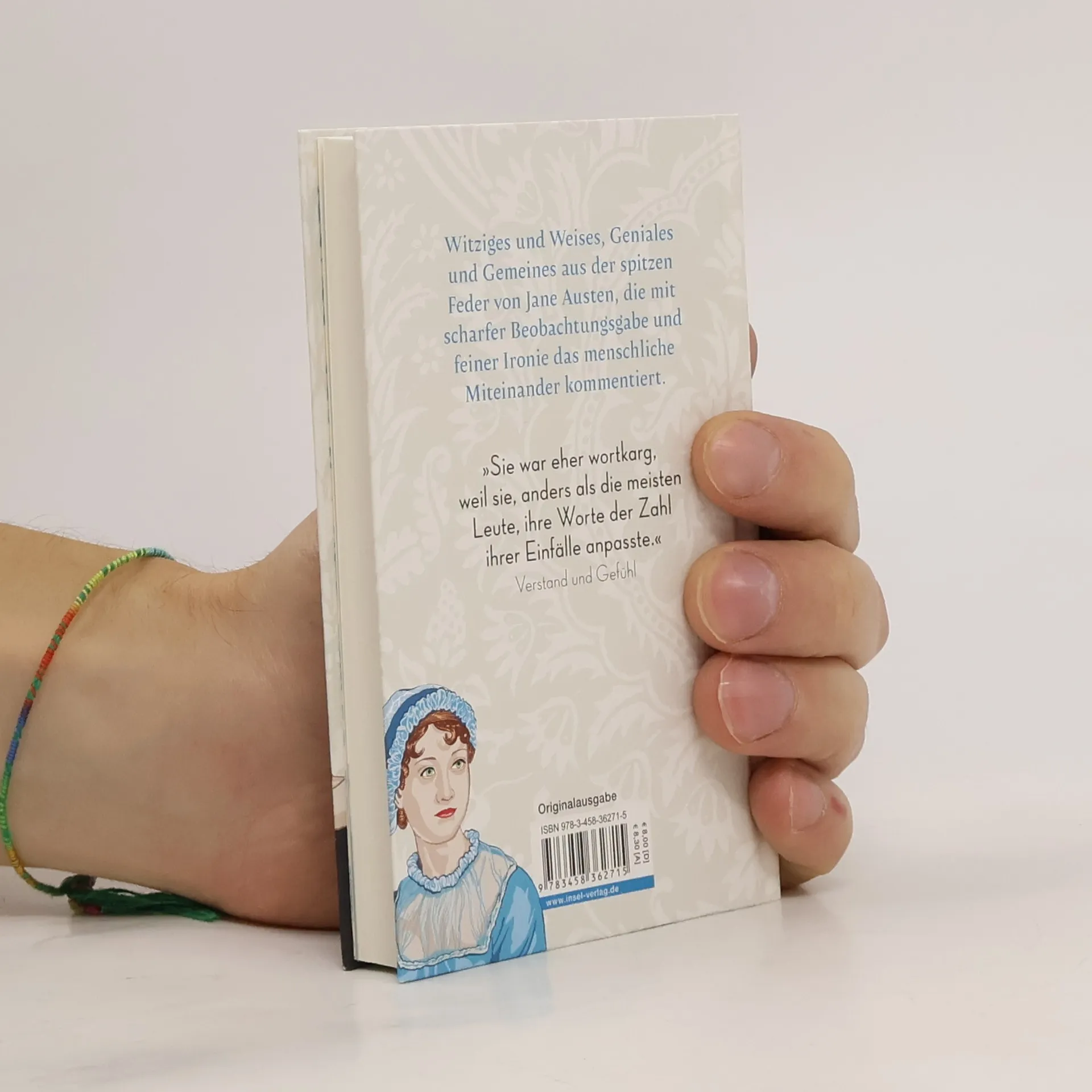 Jane Austen weiß mit ihrer scharfen Beobachtungsgabe und geschliffenen Formulierkunst, den beiläufig, aber zielsicher gesetzten Pointen, der leisen Ironie und den launigen Kommentaren sämtliche Facetten der menschlichen Natur und des zwischenmenschlichen Miteinanders auf den Punkt zu bringen. Witzig und weise, genial und gemein, klug und mitunter bitterböse kann sie dabei sein – und vermag es bis heute, ihre Leser zu erhellen und zu amüsieren. Liebe und Glück, Ehe und Familie, Freunde und Gesellschaft, Klatsch und Tratsch, Eitelkeiten und moralische Verwerflichkeiten – um nichts weniger als das ganze bewegte Leben geht es Jane Austen in ihren Romanen und Briefen. Mit Argusaugen beobachtete sie ihr Umfeld und ließ selbst kleinste Details in ihre ebenso klugen wie spitzfindigen Beschreibungen einfließen. Die besten Kommentare, Ratschläge und Weisheiten sind in diesem kleinen und feinen Geschenkbuch versammelt – eine wahre Fundgrube an Schlagfertigkeit und Witz. »Eine Frau, die das Unglück hat, viel zu wissen, täte gut daran, es möglichst zu verbergen.« Die Abtei von Northanger »Sie war eher wortkarg, weil sie, anders als die meisten Leute, ihre Worte der Zahl ihrer Einfälle anpasste.« Verstand und Gefühl