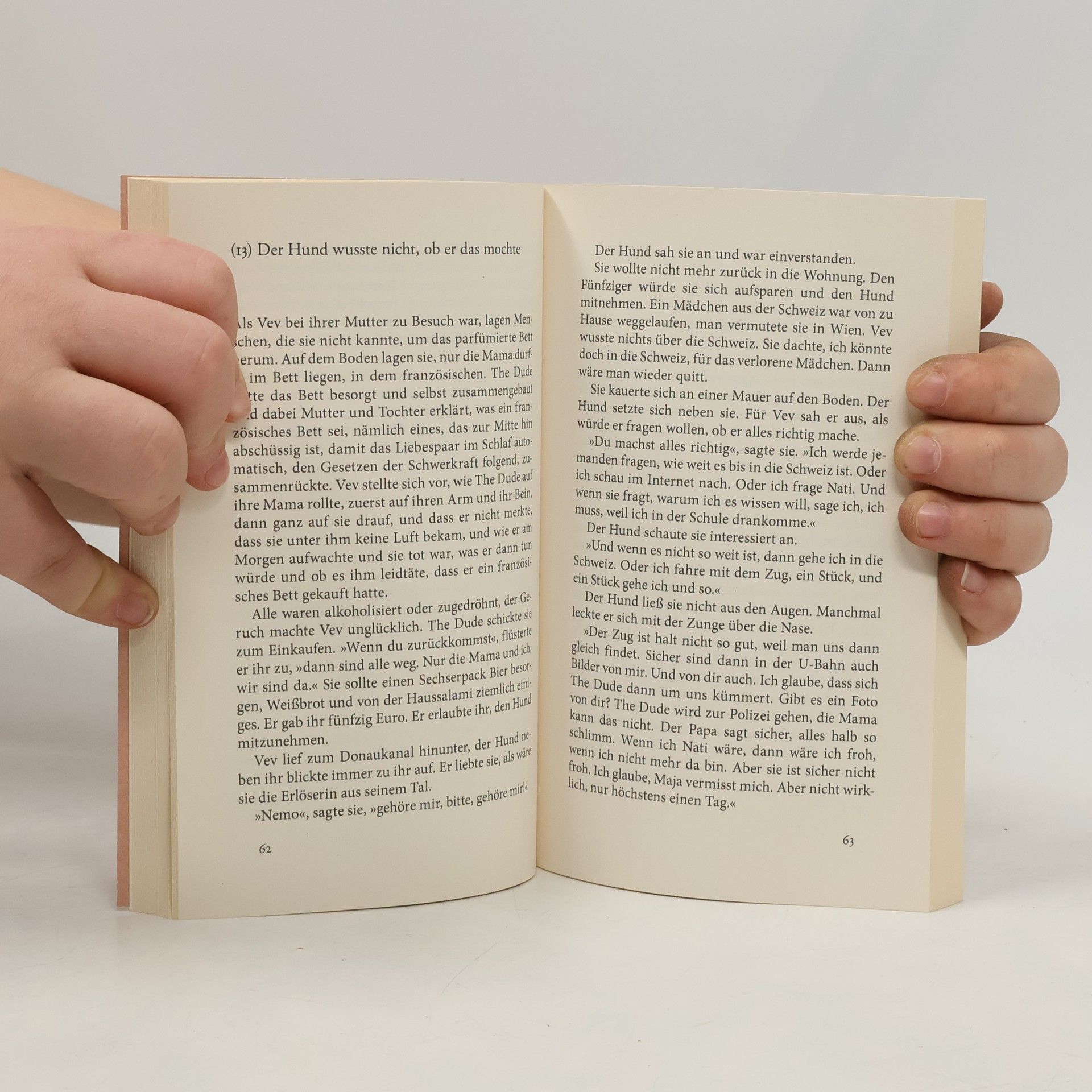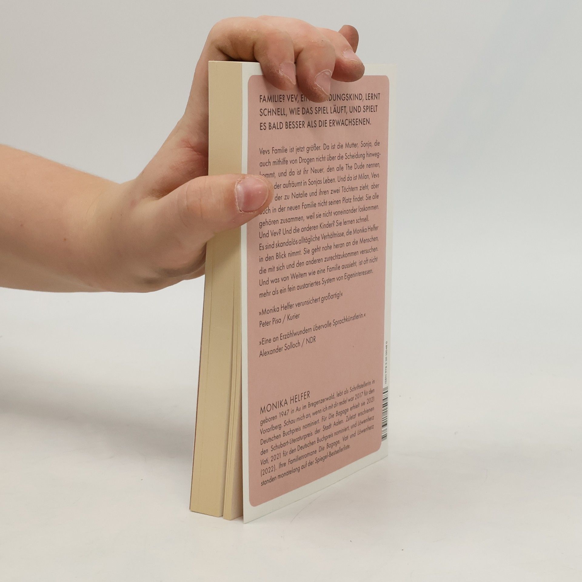 Vev ist ein Scheidungskind, ihre Familie ist jetzt größer als früher. Da ist die Mutter, Sonja, die auch mithilfe von Drogen nicht recht über die Scheidung hinwegkommt, und da ist ihr Neuer, den alle nur The Dude nennen, einer, der die Dinge in die Hand nimmt und aufräumt in Sonjas Leben. Und da ist Milan, Vevs Vater, der zu Natalie und ihren beiden Töchtern zieht, aber auch in seiner neuen Familie nicht den richtigen Platz findet. Sie alle gehören irgendwie zusammen, weil sie nicht voneinander loskommen. Und Vev? Und die anderen Kinder? Die Kinder lernen schnell, wie das Spiel läuft, und spielen es bald besser als die Erwachsenen. Es sind skandalös alltägliche Verhältnisse, die Monika Helfer in den Blick nimmt. Sie geht nahe heran an die Menschen, die darin leben, die mit sich und den anderen zurechtzukommen versuchen. Ihr Blick ist entlarvend, aber auch voller Empathie, schonungslos, aber immer im Dienst der Aufrichtigkeit. Und was aus größerer Entfernung wie eine Familie aussieht, ist bei näherer Betrachtung eben oft nicht mehr als ein fein austariertes System von Eigeninteressen.