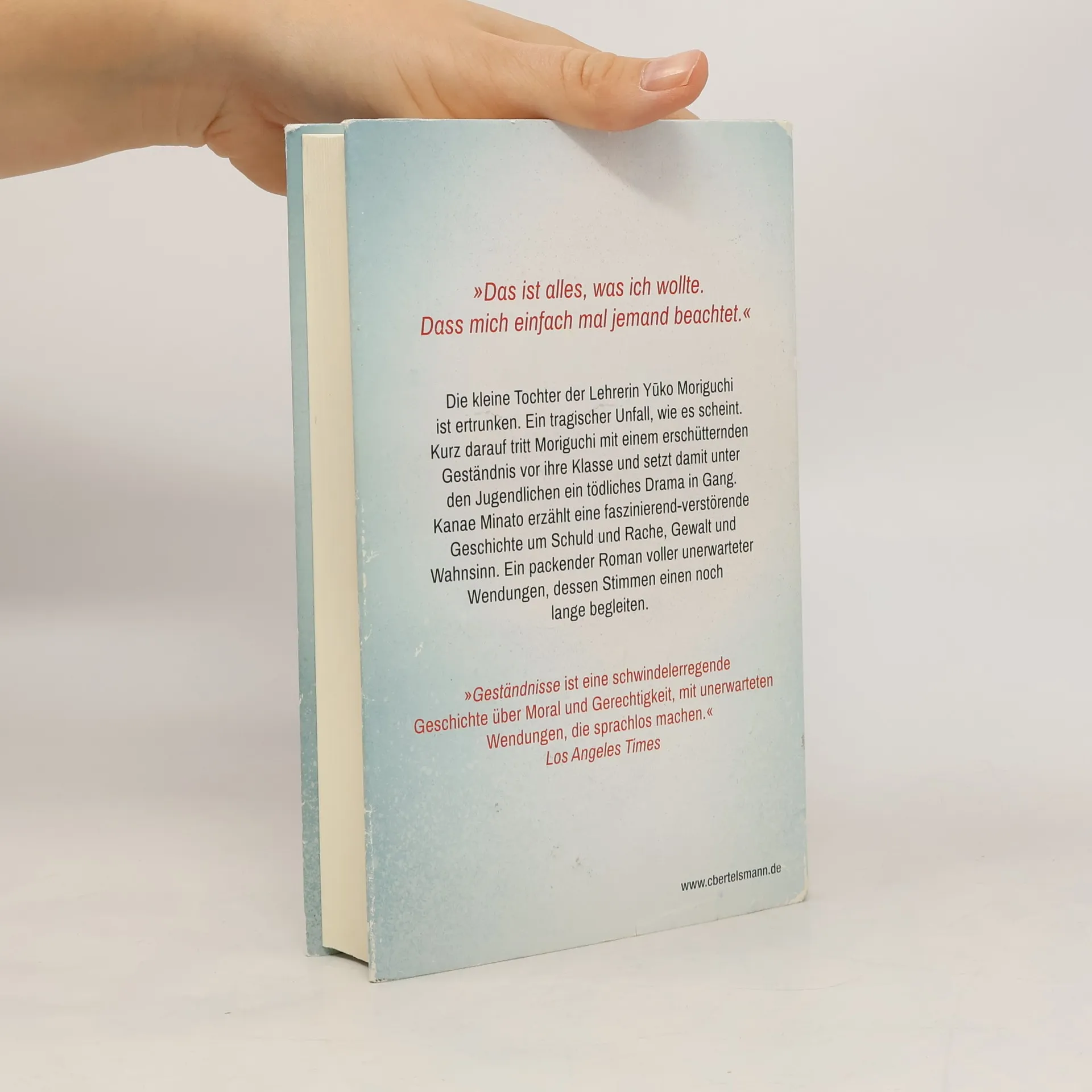 Die kleine Tochter der alleinerziehenden Lehrerin Moriguchi ist im Schulschwimmbad ertrunken; ein tragischer Unfall, wie es scheint. Wenige Wochen später kündigt Moriguchi ihre Stelle an der Schule, doch zuvor will sie ihrer Klasse noch eine letzte Lektion mit auf den Weg geben. Denn sie weiß, dass ihre Schüler Schuld am Tod ihrer Tochter haben. Mit einer erschütternden Offenbarung setzt sie unter ihnen ein tödliches Drama um Schuld und Rache, um Gewalt und Wahnsinn in Gang, an dessen Ende keiner – weder Kind noch Erwachsener – ungeschoren davonkommt. Mit immenser Sogwirkung und einem unbestechlichen Blick auf die menschlichen Abgründe erzählt die ehemalige Lehrerin Kanae Minato eine faszinierend-verstörende Geschichte voller unerwarteter Wendungen. Ein packender Roman, dessen Stimmen den Leser noch lange begleiten.