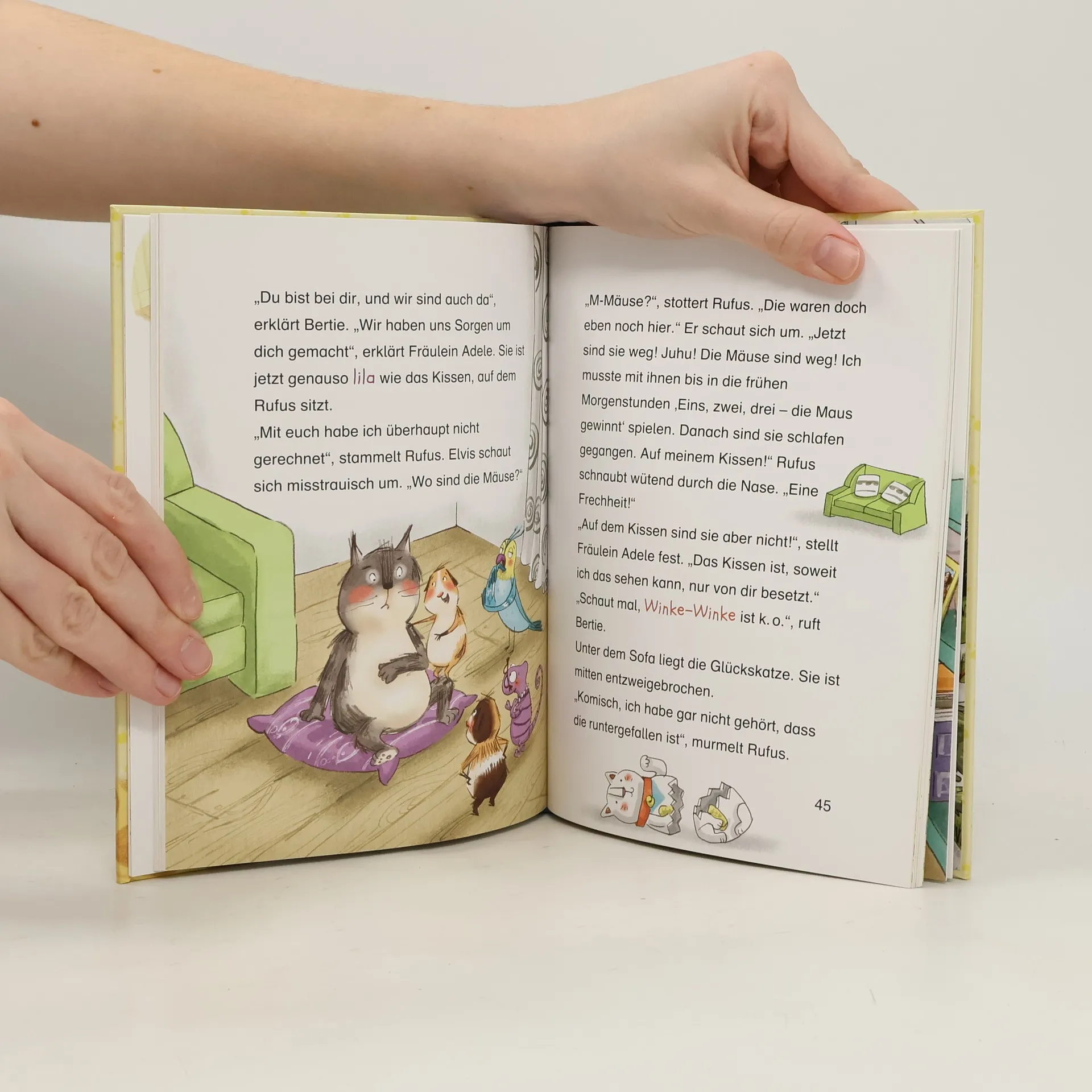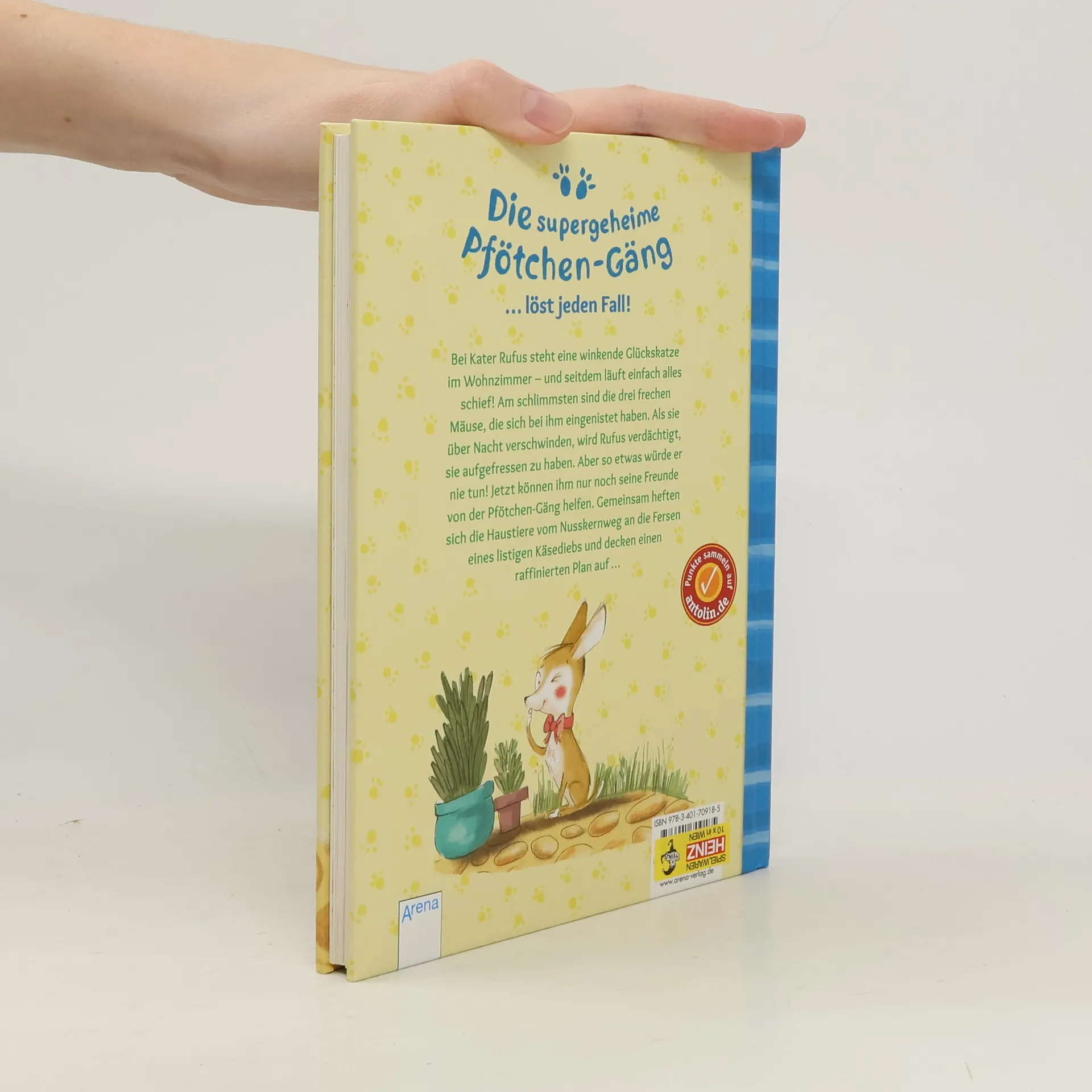 Seit bei Kater Rufus eine winkende Glückskatze im Wohnzimmer steht, läuft einfach alles schief! Am Schlimmsten sind die drei frechen Mäuse, die sich bei ihm eingenistet haben. Als sie über Nacht verschwinden, wird Rufus verdächtigt, sie aufgefressen zu haben. Aber so etwas würde er nie tun! Jetzt können ihm nur noch seine Freunde von der Pfötchen-Gäng helfen. Gemeinsam heften sie sich an die Fersen eines listigen Käsediebs und decken einen raffinierten Plan auf.