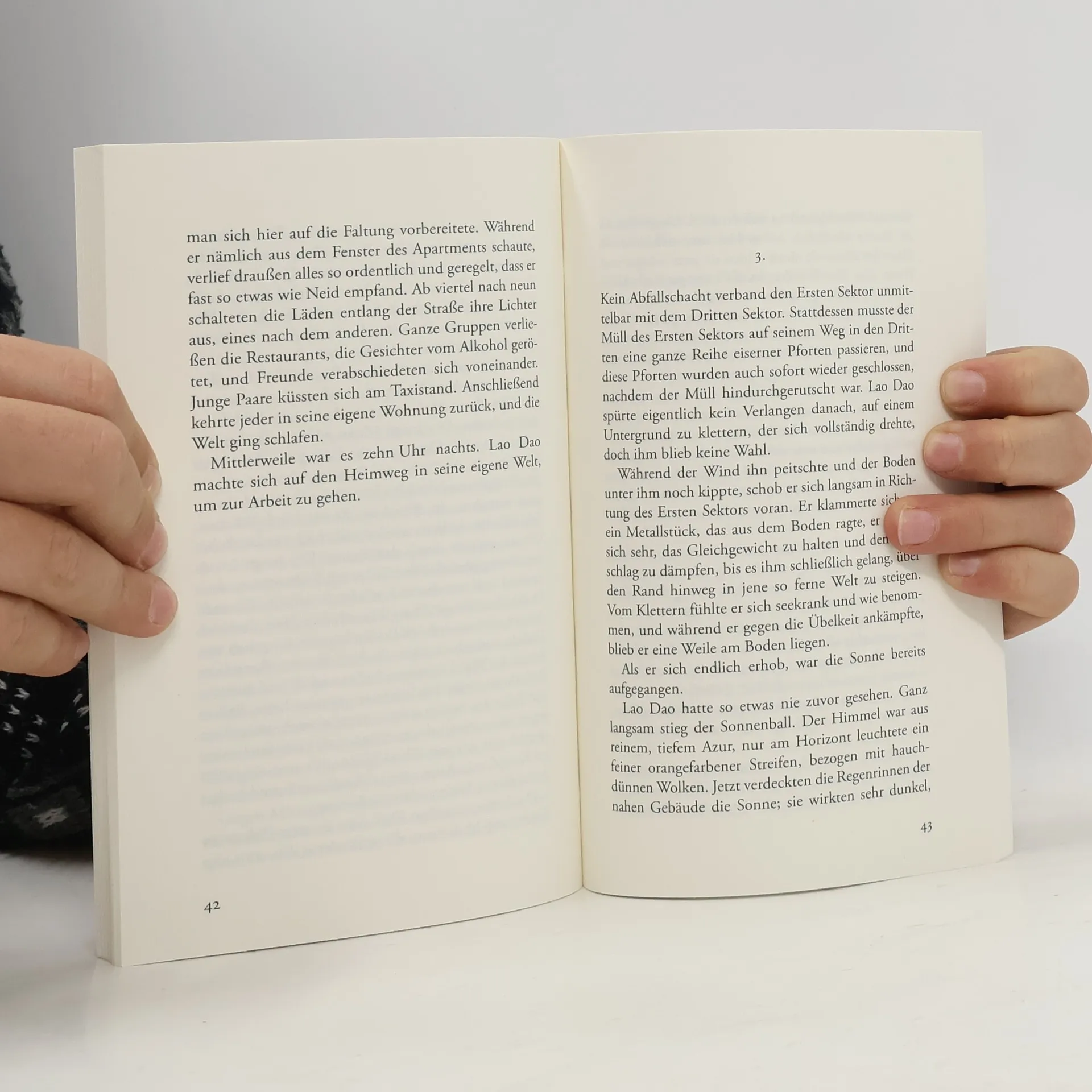 Peking, in der Zukunft: Um den knapp bemessenen Raum möglichst effizient zu nutzen, wurde die Stadt in drei Sektoren unterteilt, die sich mittels einer raffinierten Konstruktion platzsparend drehen, in der Erde versenken und zusammenfalten lassen. Nach einem strengen Plan wird immer nur ein Sektor entfaltet, damit die Menschen darin ihren Tätigkeiten nachgehen können. Ein Kontakt über die Sektorengrenzen hinweg ist untersagt. Lao Dao, Arbeiter in einer Müllentsorgungsanlage im Dritten Sektor, übernimmt einen abenteuerlichen Botengang in die abgeschirmte Erste Zone – und entdeckt ein düsteres Geheimnis hinter den faltbaren Mauern dieser schönen neuen Welt.