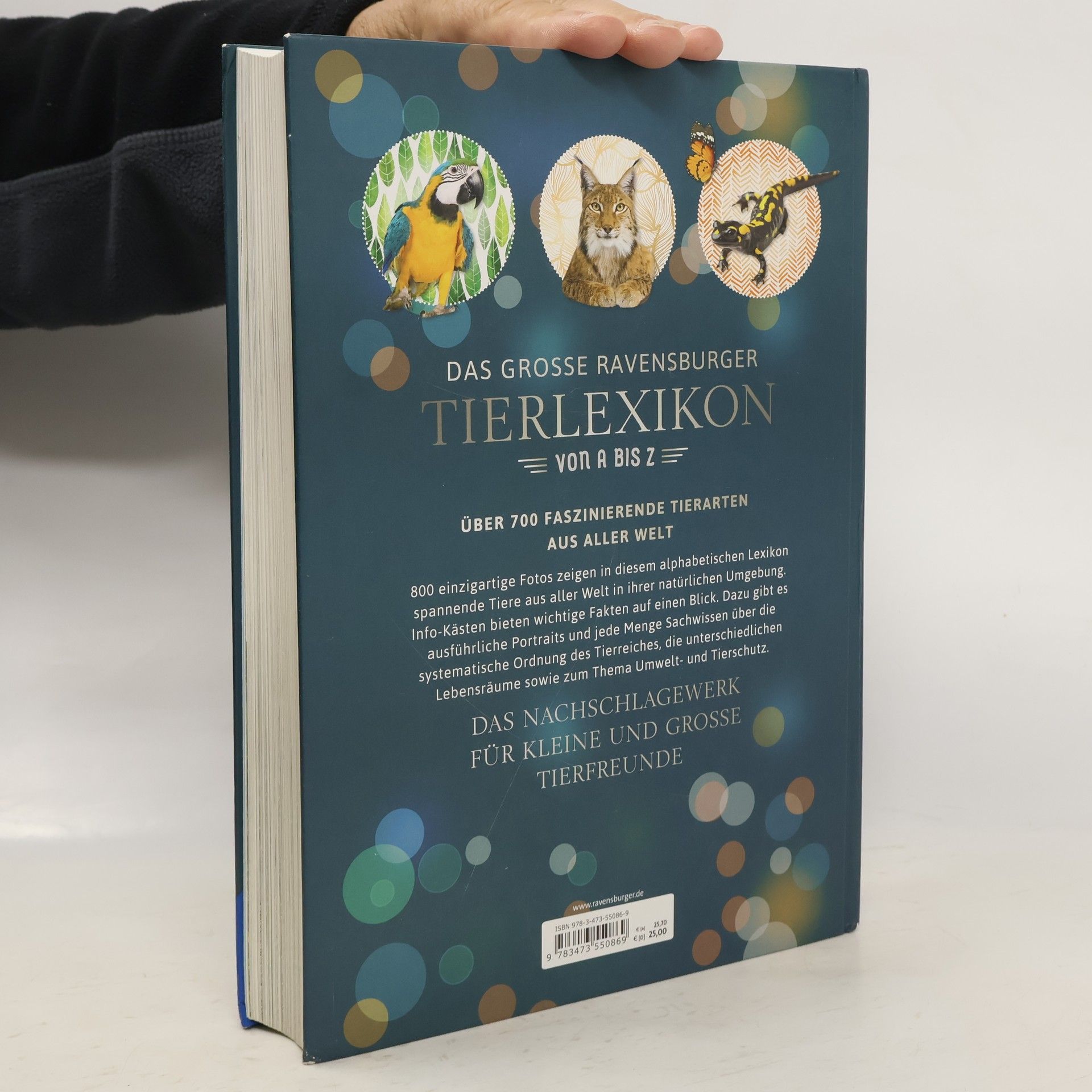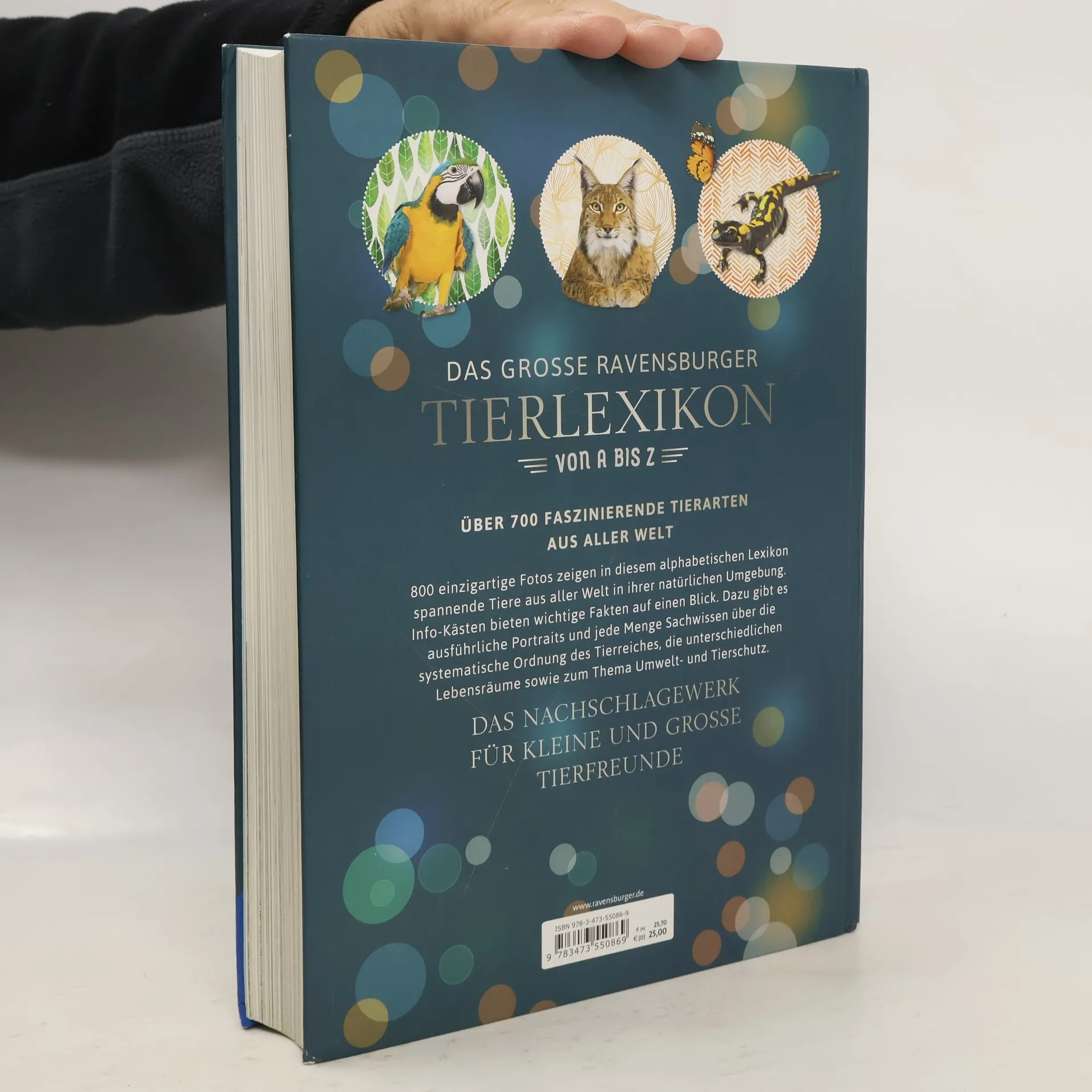 Kinder lieben Tiere und möchten alles über sie wissen. In diesem Lexikon lernen sie über 700 Tierarten aus aller Welt kennen. Einzigartige Fotos zeigen Adler, Elefant, Kaiserpinguin und Co in ihrer natürlichen Umgebung. Kurze Steckbriefe vermitteln kompaktes Sachwissen zu Größe, Merkmalen, Ernährung, Fortpflanzung und Verbreitung. Ergänzt wird das zoologische Lexikon durch eine Übersicht über Tierstämme, die unterschiedlichen Lebensräume sowie Arten- und Umweltschutz. Das Nachschlagewerk für Groß und KleinDas große Ravensburger Tierlexikon von A bis Z bietet profundes Wissen über mehr als 700 spannende Tierarten aus aller Welt. Kompetent und zuverlässig gibt es Auskunft über Aussehen, Merkmale, Verhalten und Vorkommen von Gürteltier, Nandu, Rotkehlchen und Co. Wie alles zusammenhängtDer Biologe Eckart Pott stellt in diesem Nachschlagewerk nicht nur zahlreiche Tierarten vor. Er informiert auch über die Systematik des Tierreichs, die unterschiedlichen Lebensräume unseres Heimatplaneten sowie den Schutz von Tieren, Umwelt und Klima.