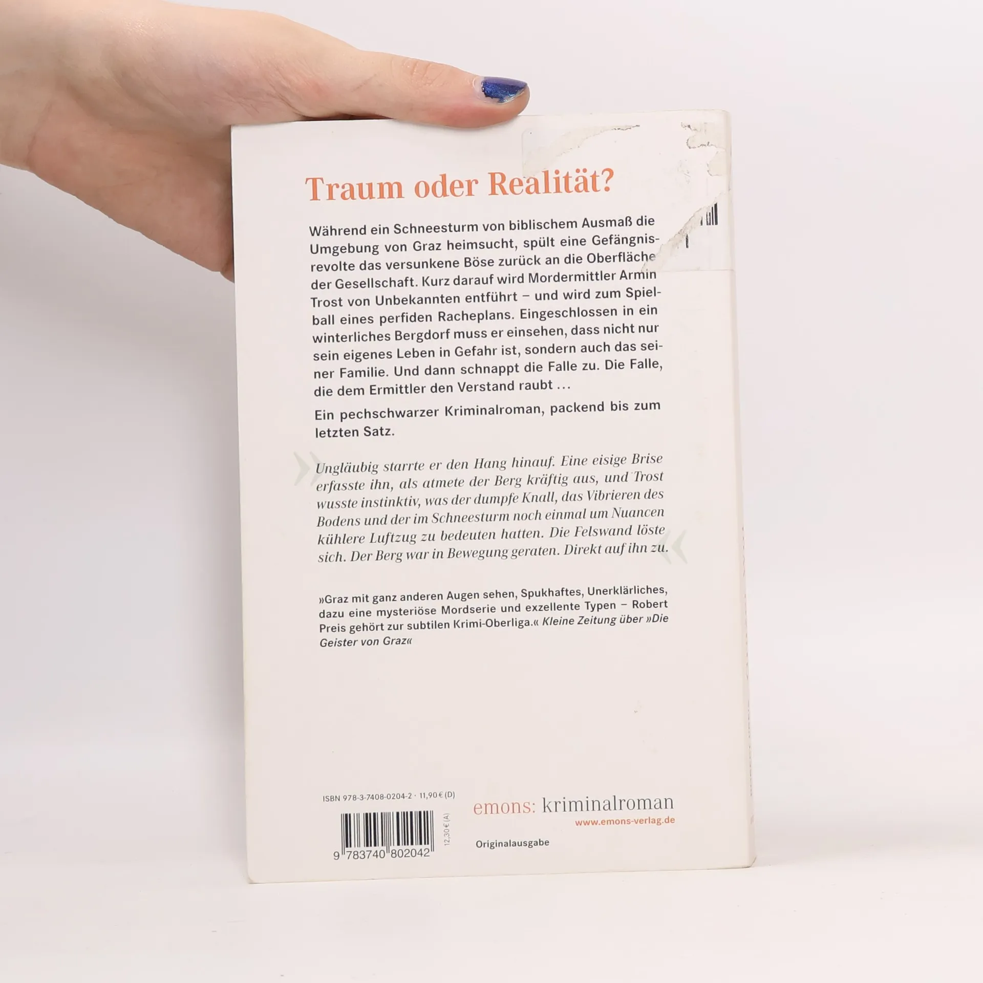 Ein pechschwarzer Alpenwestern packend bis zum letzten Satz. Während ein Schneesturm von biblischem Ausmaß die Umgebung von Graz heimsucht, spült eine Gefängnisrevolte das versunkene Böse zurück an die Oberfläche der Gesellschaft. Kurz darauf wird Mordermittler Armin Trost von Unbekannten entführt – und zum Spielball eines perfiden Racheplans. Eingeschlossen in ein winterliches Bergdorf muss er einsehen, dass nicht nur sein eigenes Leben in Gefahr ist, sondern auch das seiner Familie. Und dann schnappt die Falle zu. Die Falle, die dem Ermittler den Verstand raubt . . .