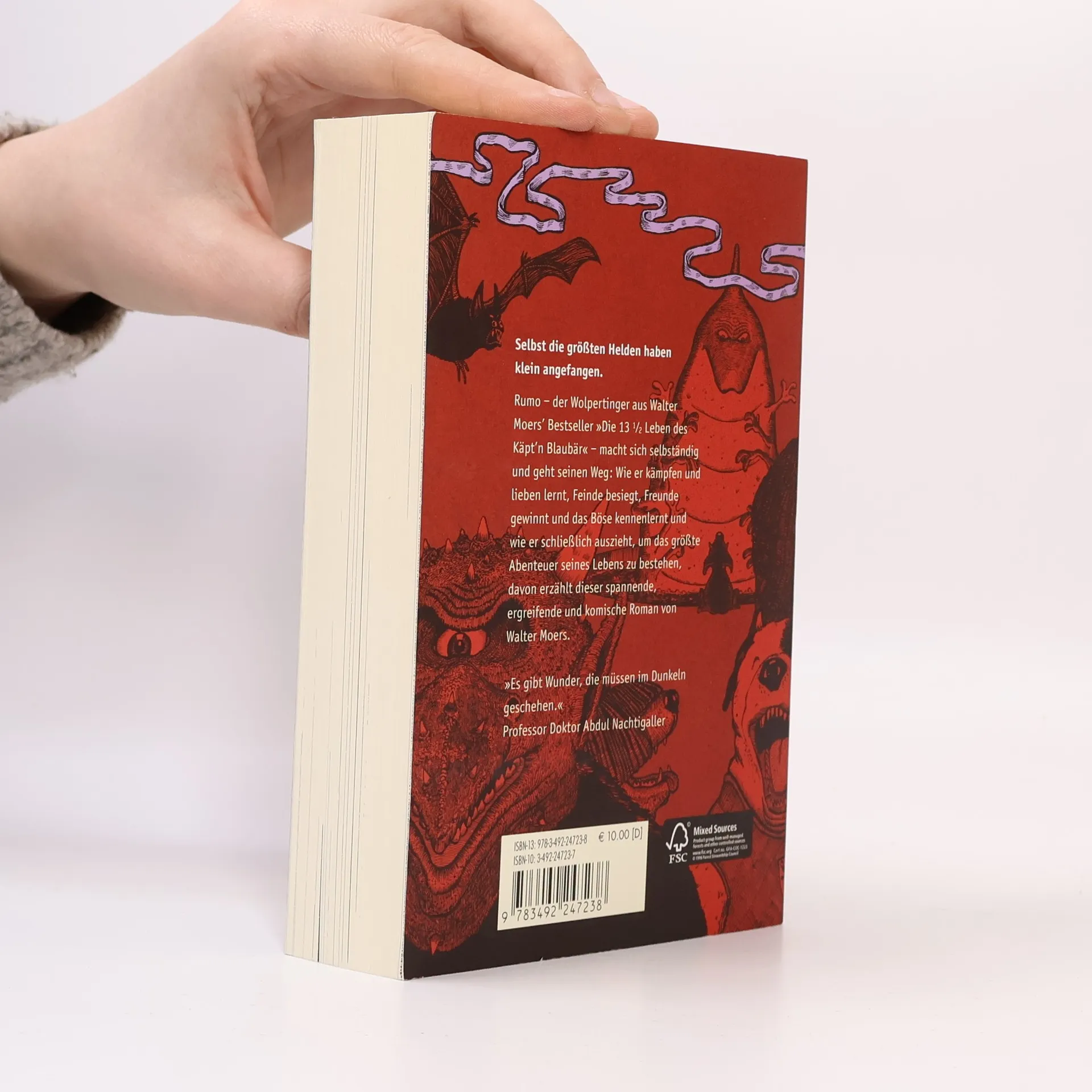 Selbst die größten Helden haben klein angefangen Rumo, der junge Wolpertinger aus "Die 13 ½ Leben des Käpt'n Blaubär", macht sich selbstständig und geht seinen eignen Weg durch den gefährlichen Kontinent Zamonien. Er folgt dem Silbernen Faden, einer Geruchsspur, die nur er wittern kann und an deren Ende Rumo das Glück vermutet. Auf seiner abenteuerlichen Reise durch zwei höchst unterschiedliche Welten begegnet er Teufelszyklopen und Mondlichtschatten, den Kupfernen Kerlen und den Toten Yetis. Rumo lernt das Kämpfen, die Liebe, die Freundschaft und das Böse kennen, es verschlägt ihn in den geheimnisvollen Nurnenwald, in die legendären Untenwelt und in das Theater der Schönen Tode; er erfährt von den Unvorhandenen Winzlingen, von den Belagerungen der Lindwurmfeste, von Professor Dr. Abdul Nachtigaller und seinem Schubladenorakel - und Rumo findet endlich zu Rala, die ihm die Wunder im Dunkeln zeigt. Ausstattung: Über 100 Illustrationen