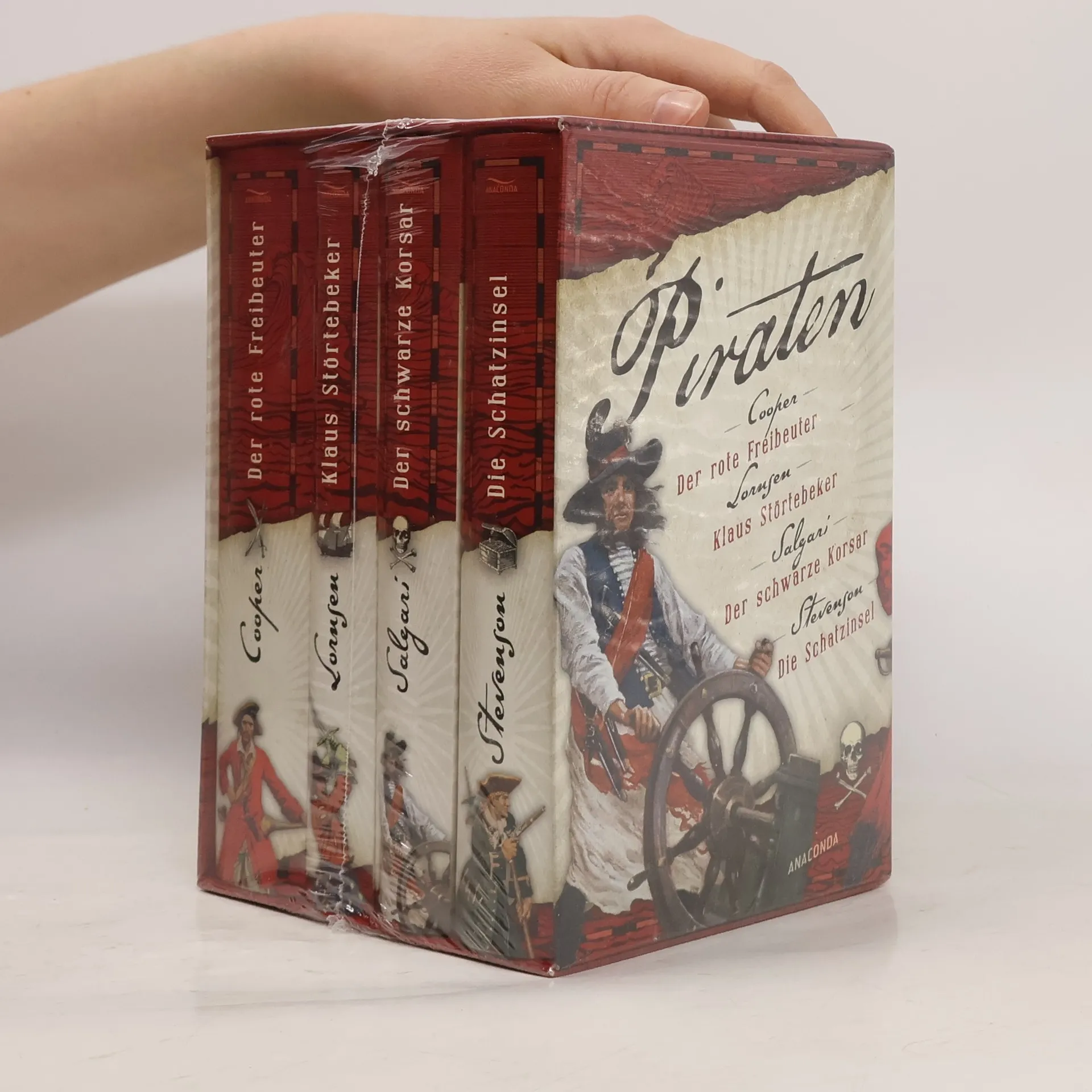 Vier spannende Abenteuerromane in schöner Geschenkbox, vier Klassiker als prickelnder Lesegenuss! Der roten Freibeuter sorgt mit seinem Geisterschiff auf hoher See für Angst und Schrecken, bis er schließlich enttarnt wird. – Klaus Störtebeker soll im Auftrag deutscher Hansestädte dänische Schiffe ausrauben, geht aber bald schon seine eigenen Wege. – Der schwarze Korsar zieht in der Karibik auf einen Rachefeldzug gegen den Mann, der seine Brüder auf dem Gewissen hat. – Captain J. Flint und der berüchtigte Korsar John Long Silver sind die Antagonisten im Kampf um den sagenumwobenen Goldschatz auf der Schatzinsel.