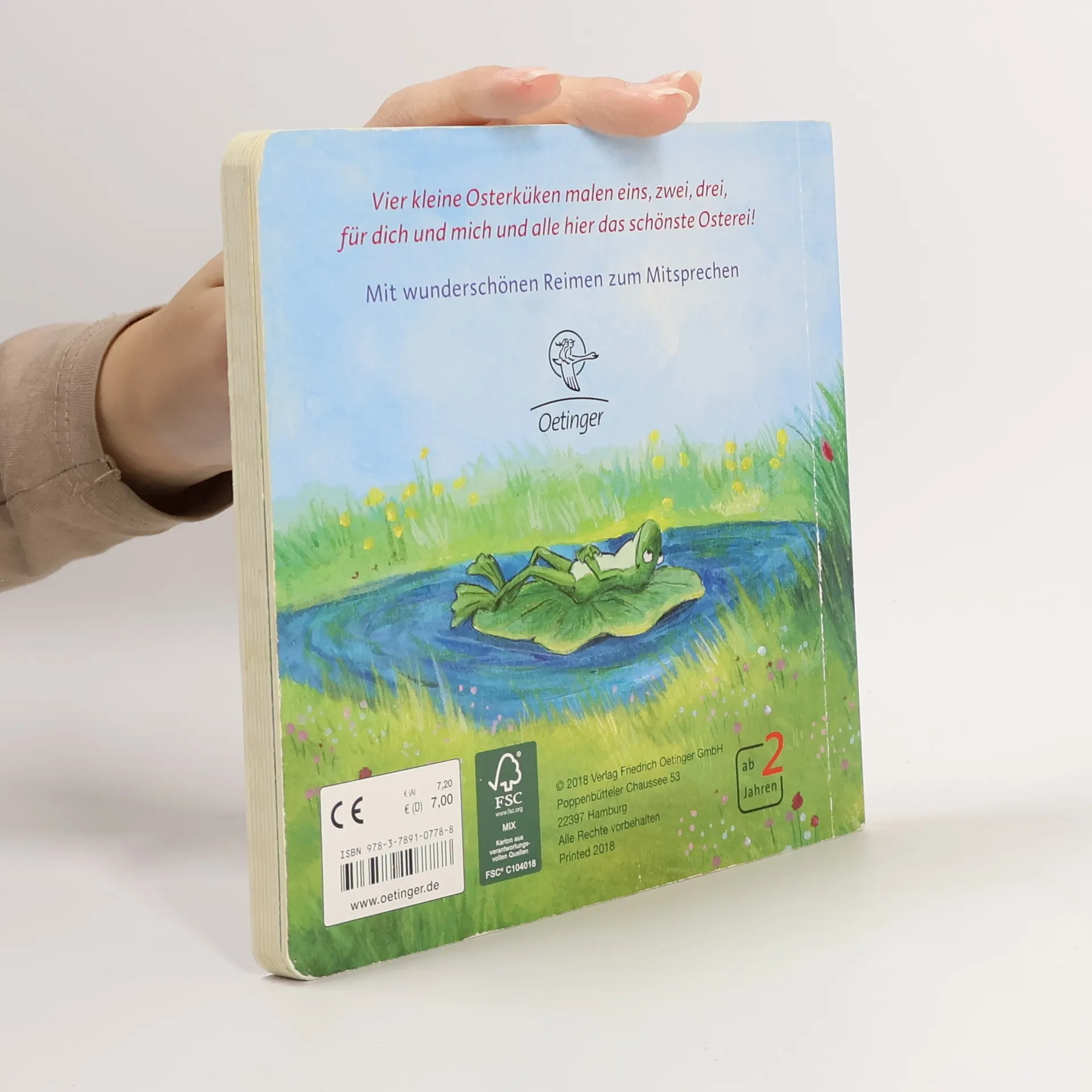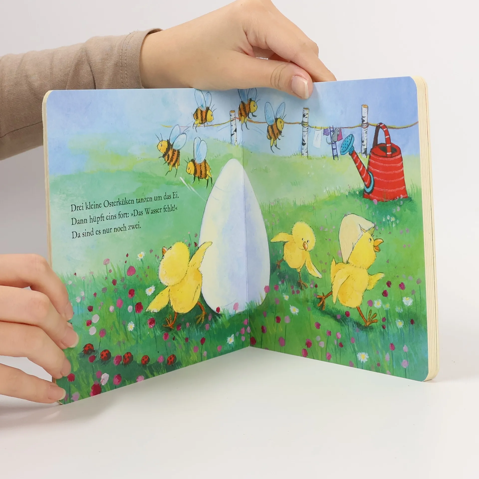 Eins, zwei, drei: Fertig ist ein wunderschönes Osterei! Vier kleine Osterküken wollen Ostereier bemalen. Was sie dazu brauchen? Wasser, Farbe und Pinsel. Das erste Küken läuft los, um Wasser zu holen. Das zweite Küken besorgt die Farbe, das dritte einen Pinsel. Und das vierte Küken? Das bleibt nicht lang allein, denn die anderen drei Küken kommen schnell wieder zurück und zusammen bemalen sie dann das schönste Osterei der Welt. Bunter Oster-Malspaß mit zauberhaften Reimen.