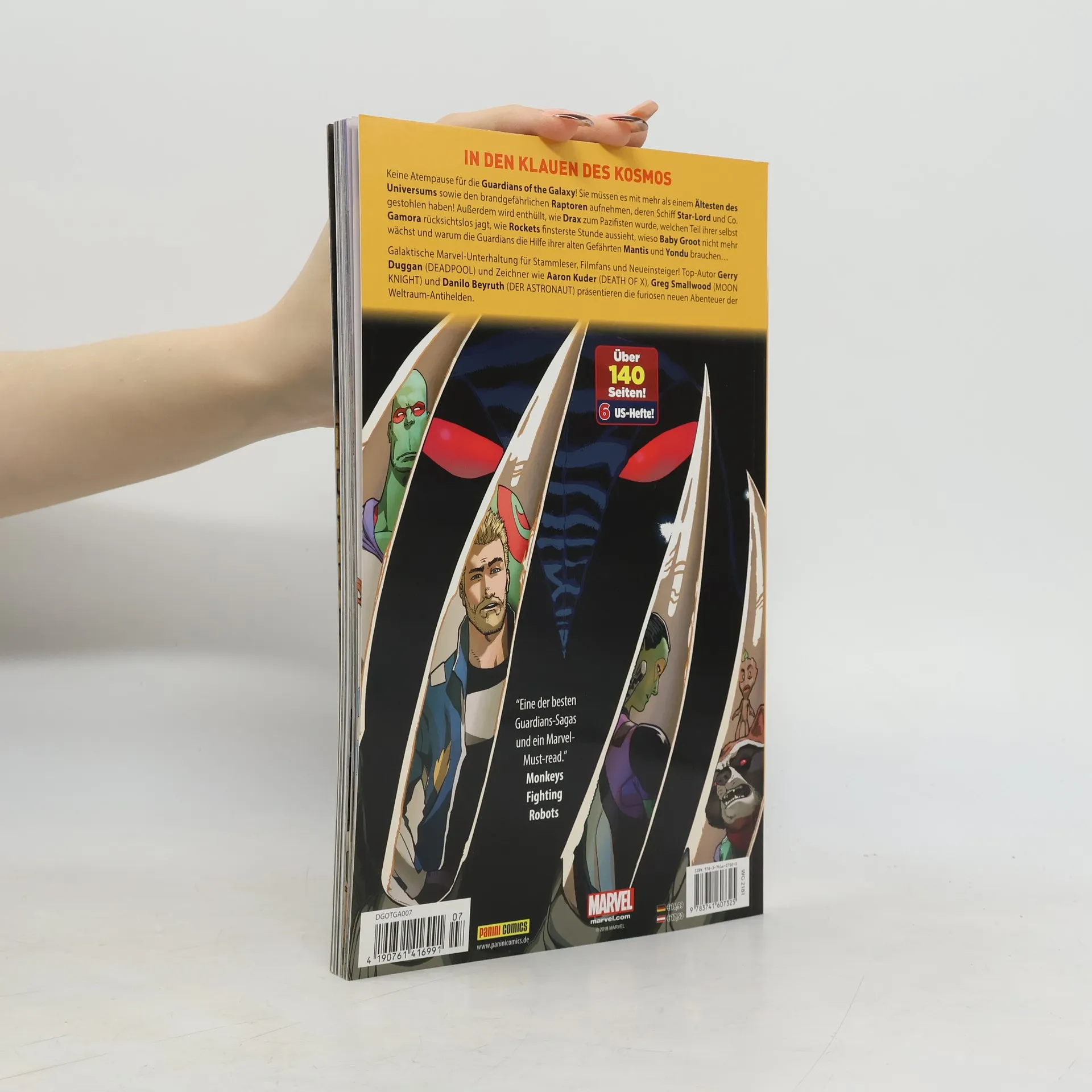 Die Guardians um Star-Lord und Rocket Raccoon haben viele Probleme: Etwa die brutalen Raptors-Krieger, denen sie ein Raumschiff gestohlen haben! Dazu: Wie wurde Drax der Zerstörer zum militanten Pazifisten? Wieso wächst Baby Groot nicht mehr? Kann Mantisden galaktischen Halunken helfen? Und was passiert, wenn Peter Quill auf seinen Ziehvater Yondu trifft?