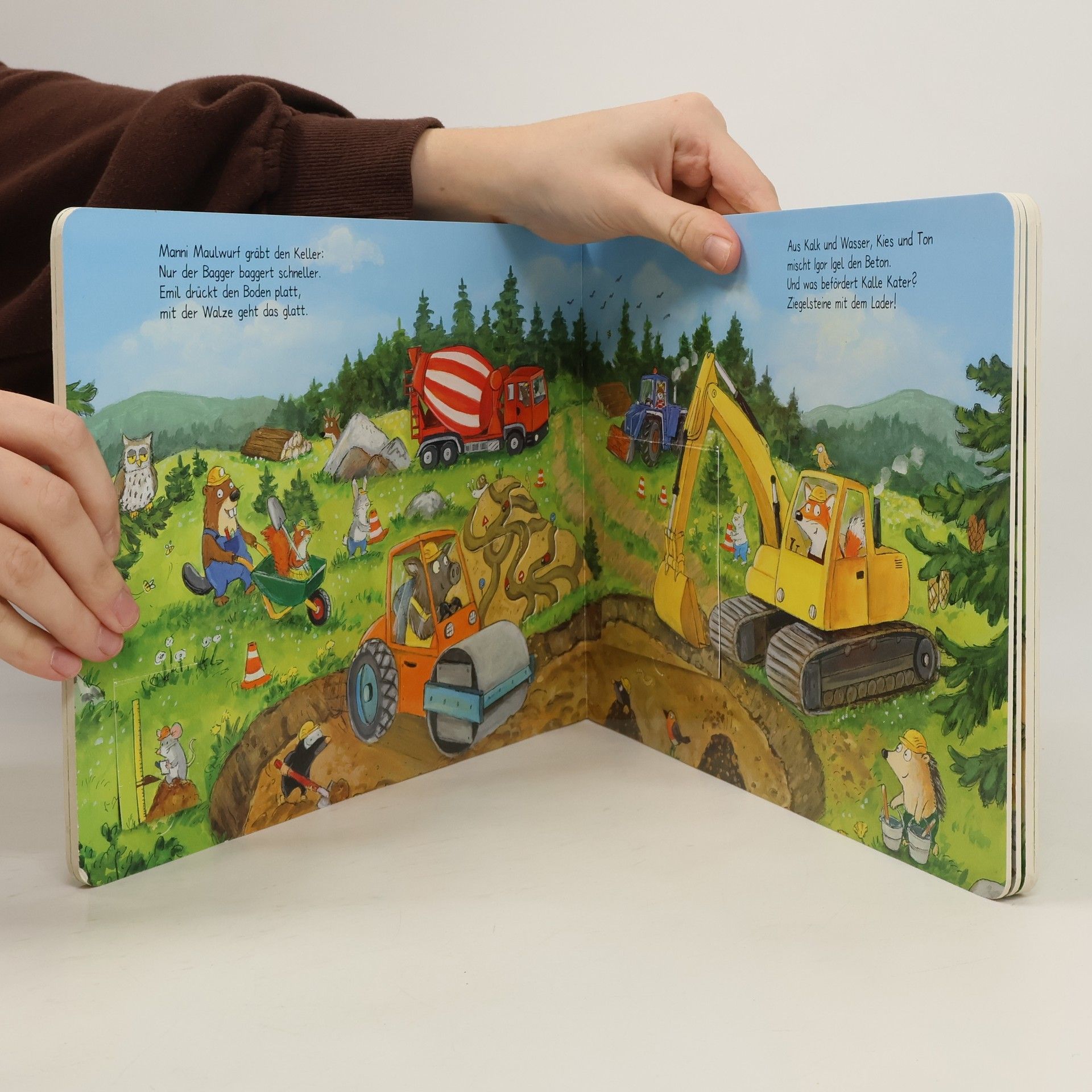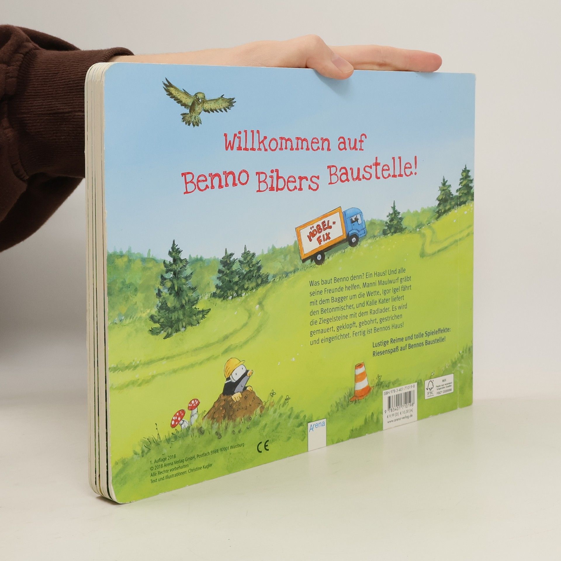 Willkommen auf Benno Bibers Baustelle! Was da wohl gebaut wird? Manni Maulwurf gräbt mit dem Bagger um die Wette, Igel Igor fährt den Betonmischer, und Kalle Kater liefert die Ziegelsteine mit dem Radlader. Es wird gemauert, geklopft, gebohrt, gestrichen und eingerichtet. Fertig ist Bennos Haus!