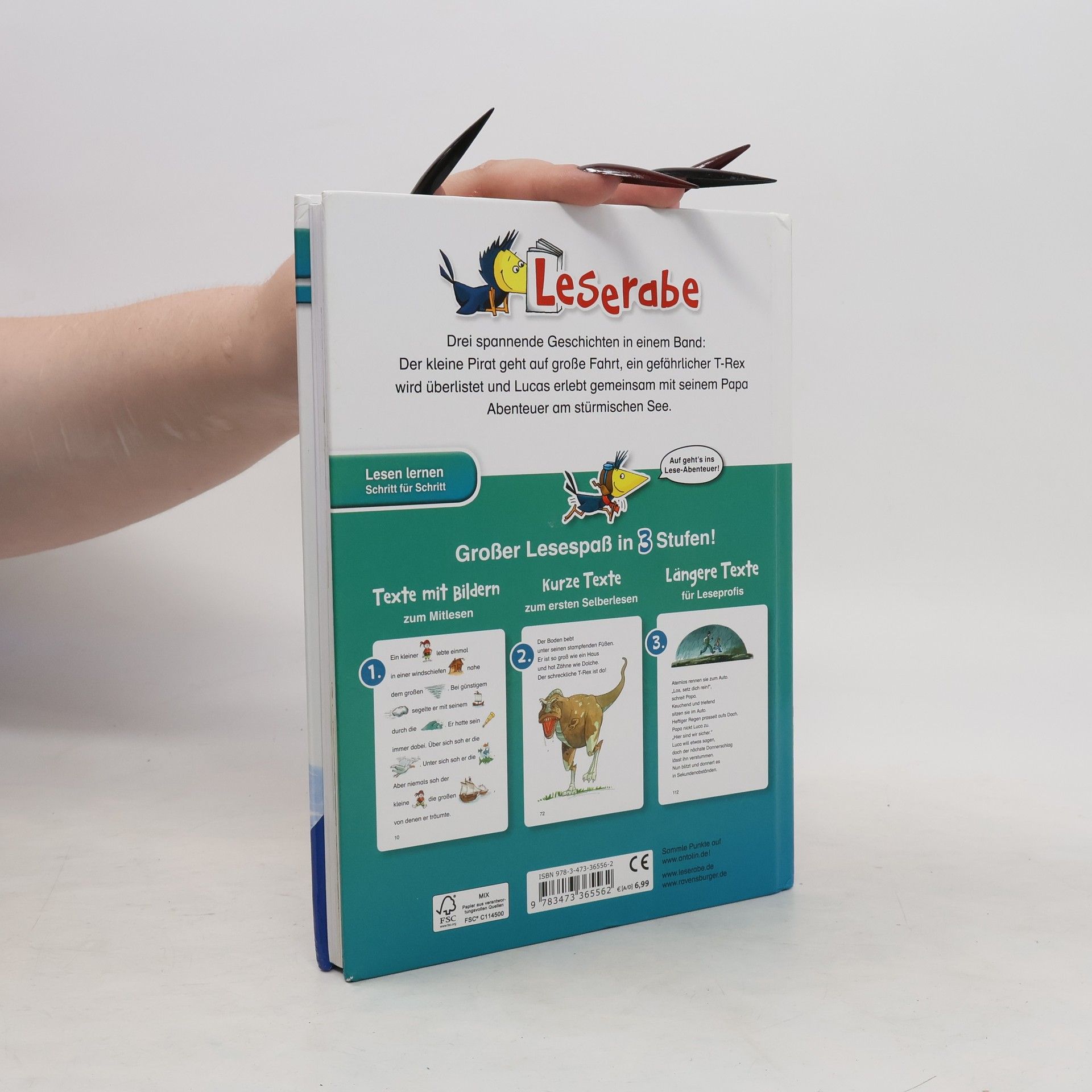 Kurzbeschreibung• Ideales Geschenk zur Einschulung • Bilder ersetzen Hauptwörter • Lesemotivation durch spannende Geschichten Drei spannende Geschichten in einem Band: Der kleine Pirat geht auf große Fahrt, ein gefährlicher T-Rex wird überlistet und Lucas erlebt gemeinsam mit seinem Papa Abenteuer am stürmischen See. Lesen lernen wie im Flug! Die Kinderbücher der Reihe Leserabe wurden mit Pädagogen entwickelt und richten sich an Leseanfänger ab dem Vorschulalter. Das große Leseraben-Buch der Abenteuergeschichten enthält drei Texte für Erstleser mit unterschiedlichem Schwierigkeitsgrad. Die Vor-Lesestufe ermöglicht, Kindern im Vorschulalter und deren Eltern als Leseteam erste gemeinsame Leseerlebnisse. Die kurzen Texte der ersten Lesestufe sind in großer Fibelschrift geschrieben, sichern erste Leseerfolge und steigern die Lesekompetenz. Spannende Geschichten in Fibelschrift wecken in der zweiten Lesestufe die Lesemotivation. So werden Leseanfänger Schritt für Schritt zum Leseprofi! Empfohlen von Stiftung Lesen. Weitere Informationen auf leserabe. de.