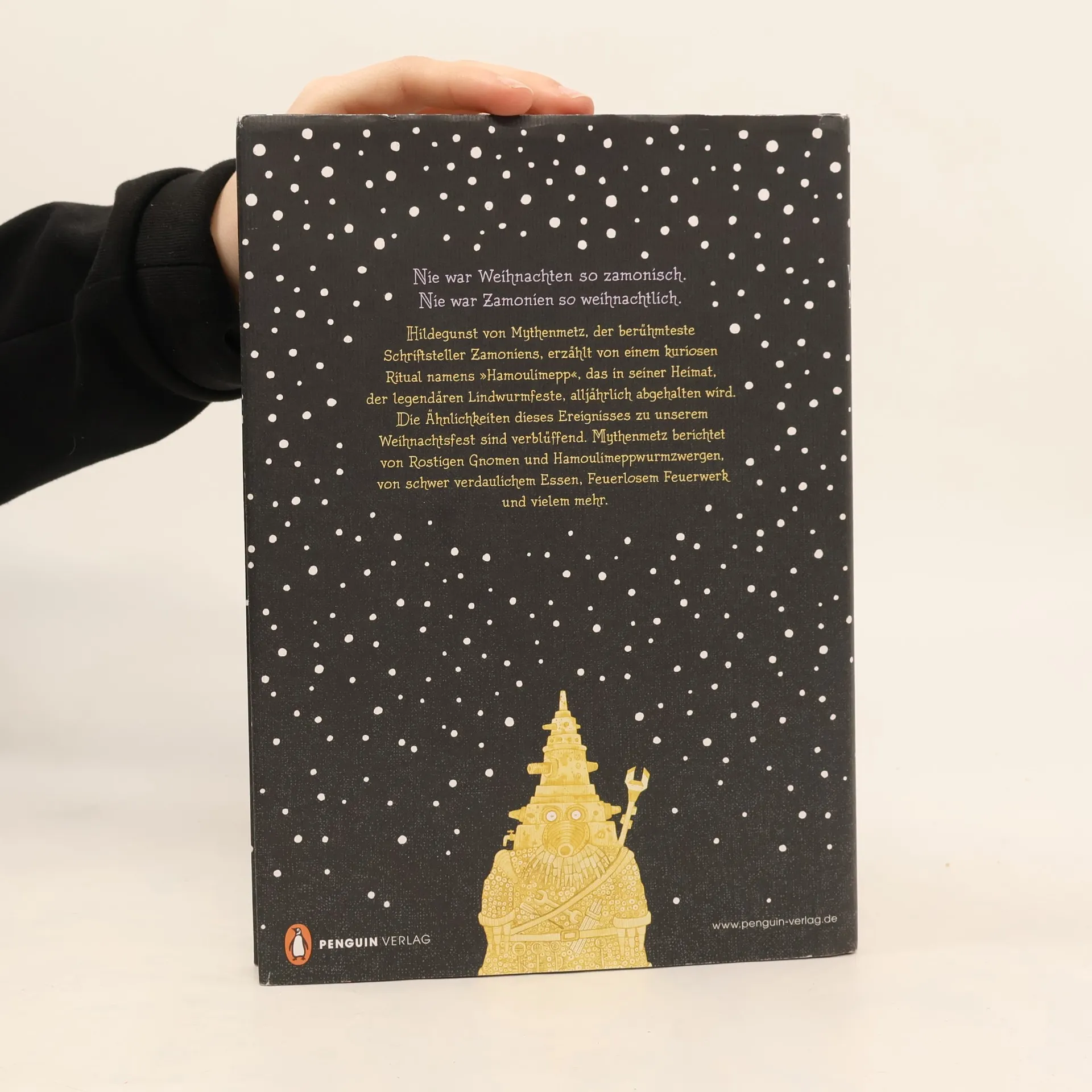 Diese zamonische Weihnachtsgeschichte gehört unter jeden Christbaum! Als Walter Moers den Briefwechsel zwischen Hildegunst von Mythenmetz und dem Buchhaimer Eydeeten Hachmed Ben Kibitzer sichtete, stieß er auf einen Brief, in dem der zamonische Autor ein Fest schildert, das Moers frappierend an unser Weihnachtsfest erinnert hat. Die Lindwürmer Zamoniens begehen es alljährlich und nennen es »Hamoulimepp«. Während dieser drei Feiertage steht die Lindwurmfeste ganz im Zeichen der beiden Figuren »Hamouli« und »Mepp«, die unserem Weihnachtsmann und dem Knecht Ruprecht verblüffend ähneln. Außerdem gehören zur Tradition Hamoulimeppwürmer, Hamoulimeppwurmzwerge, ungesundes Essen, ein Bücher-Räumaus, ein feuerloses Feuerwerk und vieles andere mehr. Laut Moers, kein Freund der Weihnachtsfeierei, gibt dieser Brief von Mythenmetz einen profunden Einblick in die Gebräuche einer beliebten zamonischen Daseinsform, der Lindwürmer. Nie war Weihnachten so zamonisch.